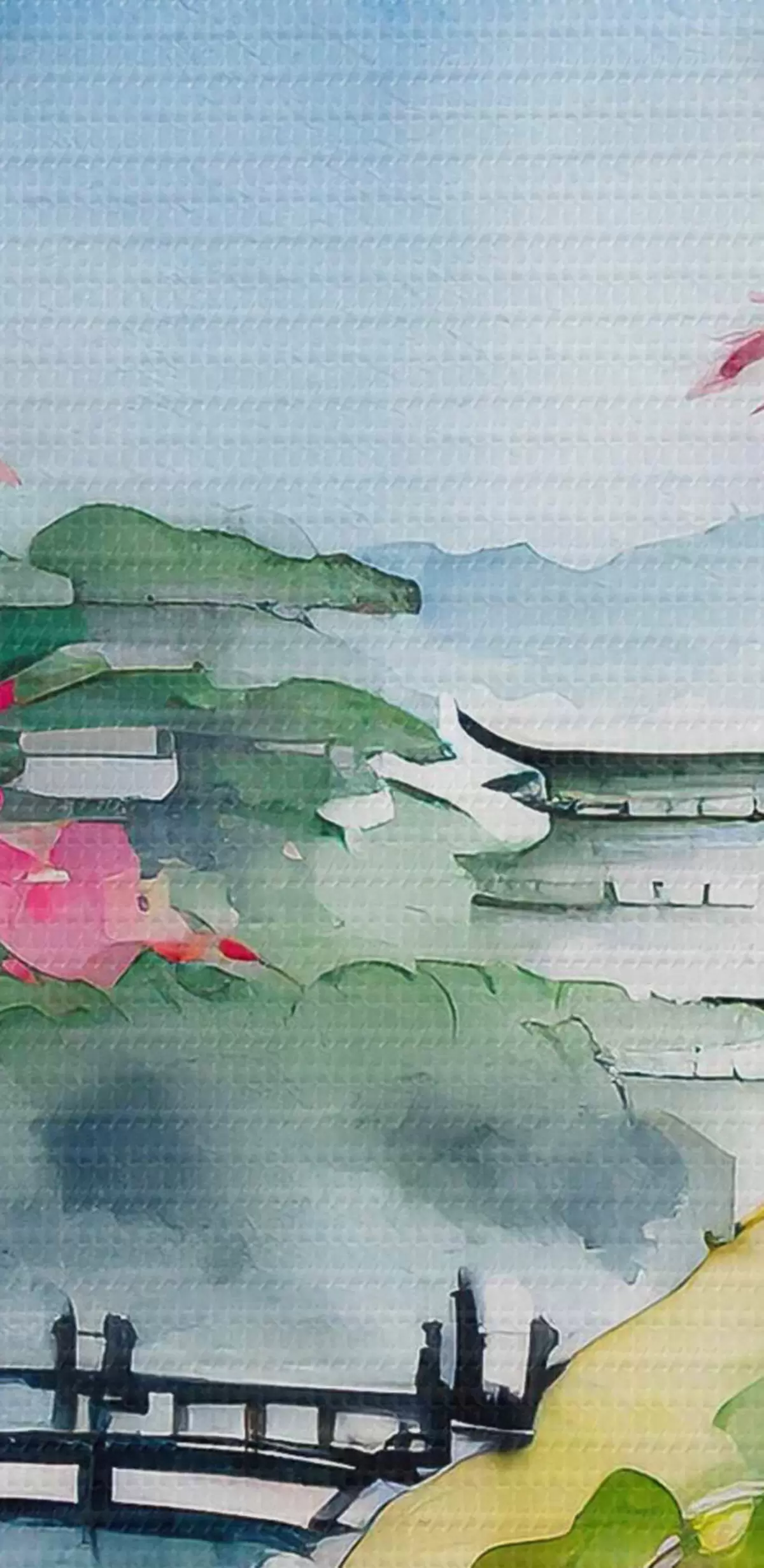 Picturi rotunde Acuarelă Japonia, cireș, munți Nr r36691