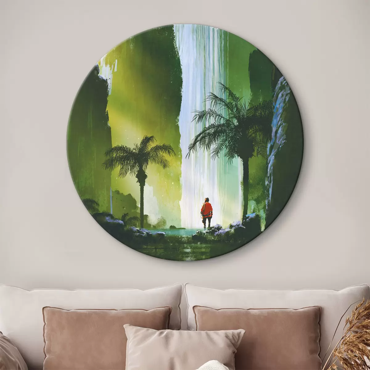 Picturi rotunde Un bărbat se plimbă în pădure cu o cascadă Nr r37080