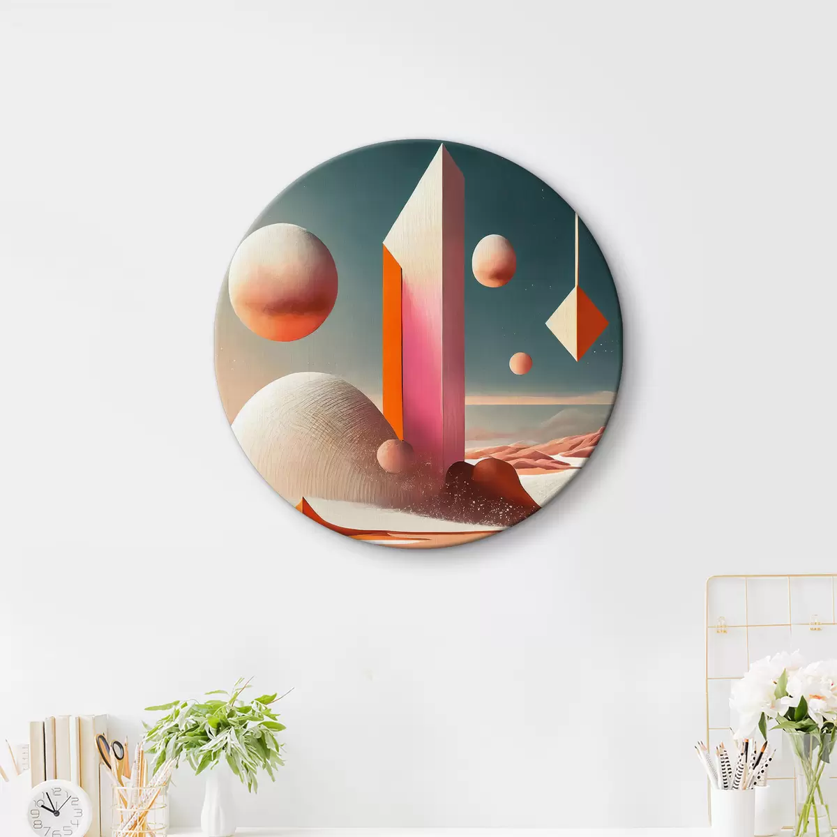 Picturi rotunde Peisaj de deșert cu turn și forme geometrice Nr r37368