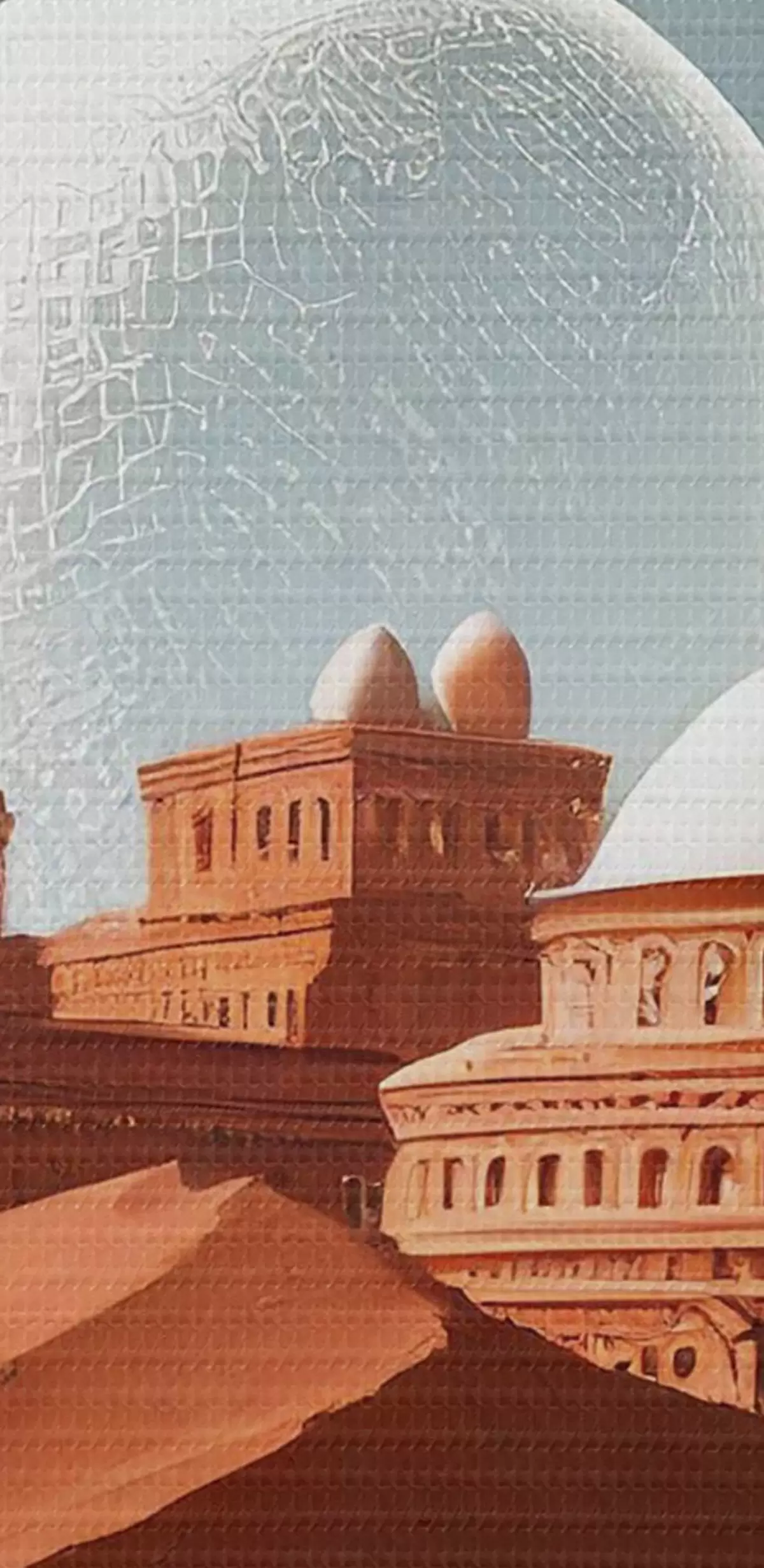 Picturi rotunde Peisaj deșertic cu clădiri și o minge albă mare Nr r37814