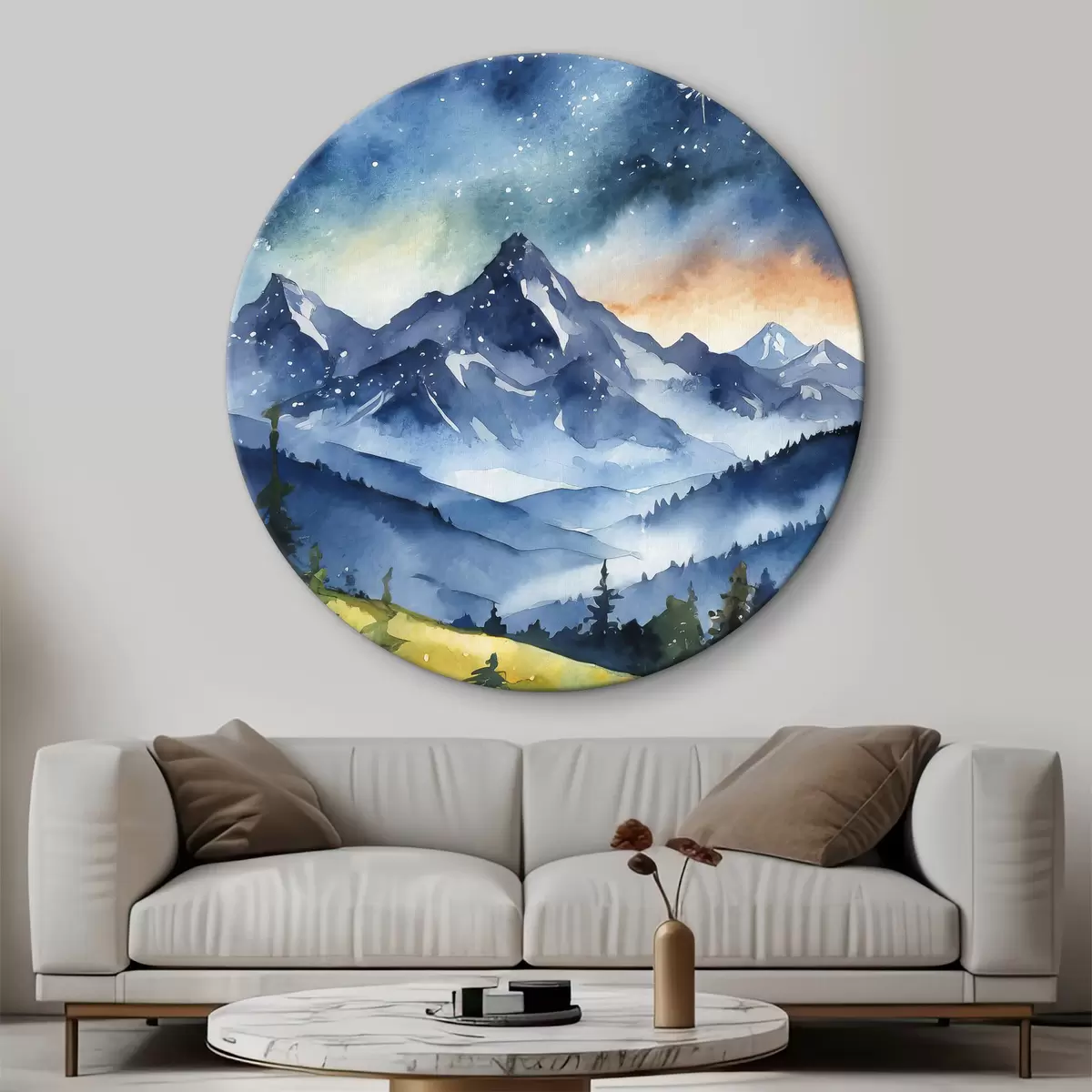 Picturi rotunde Peisaj montan acuarelă, pădure, cer de noapte înstelat, culori apus de soare r37946