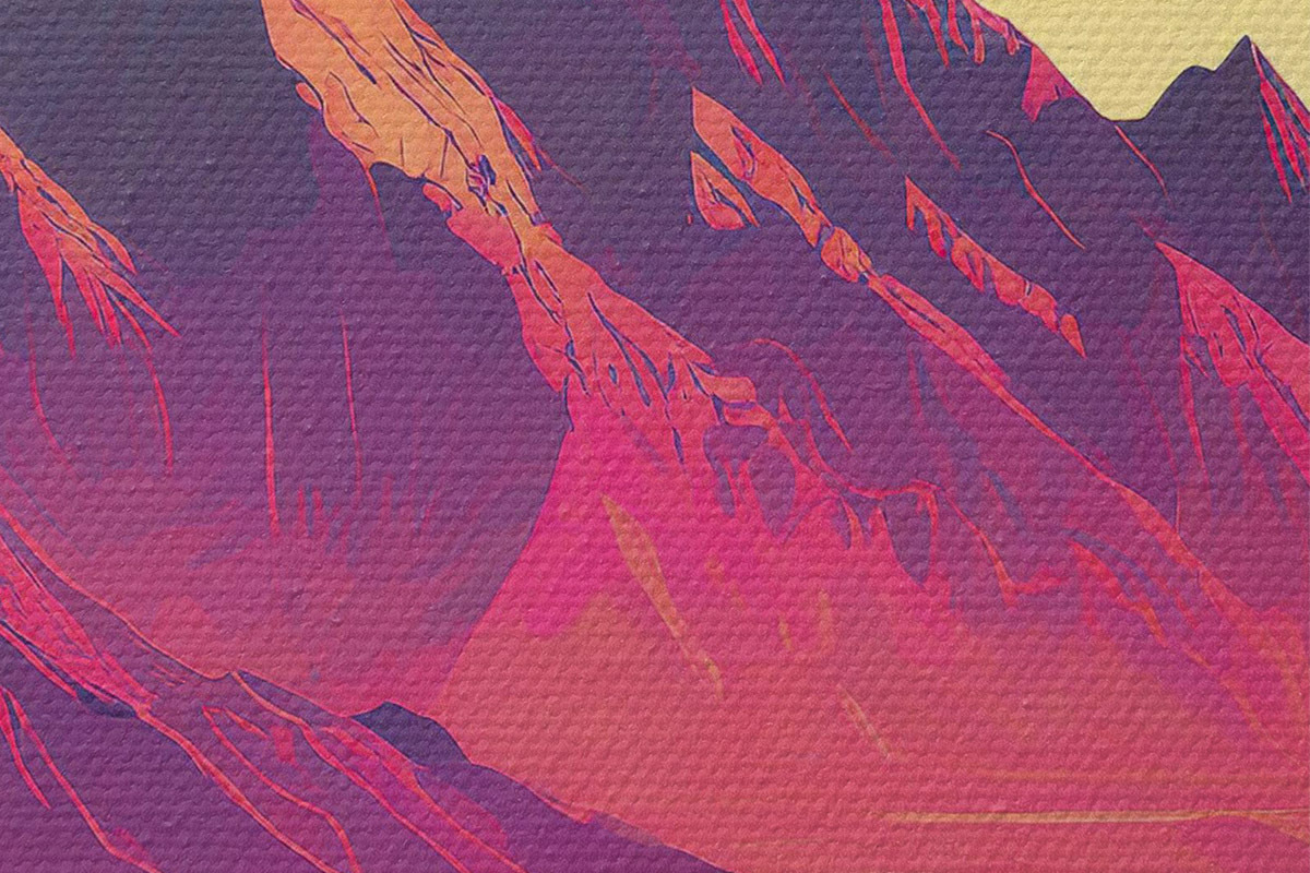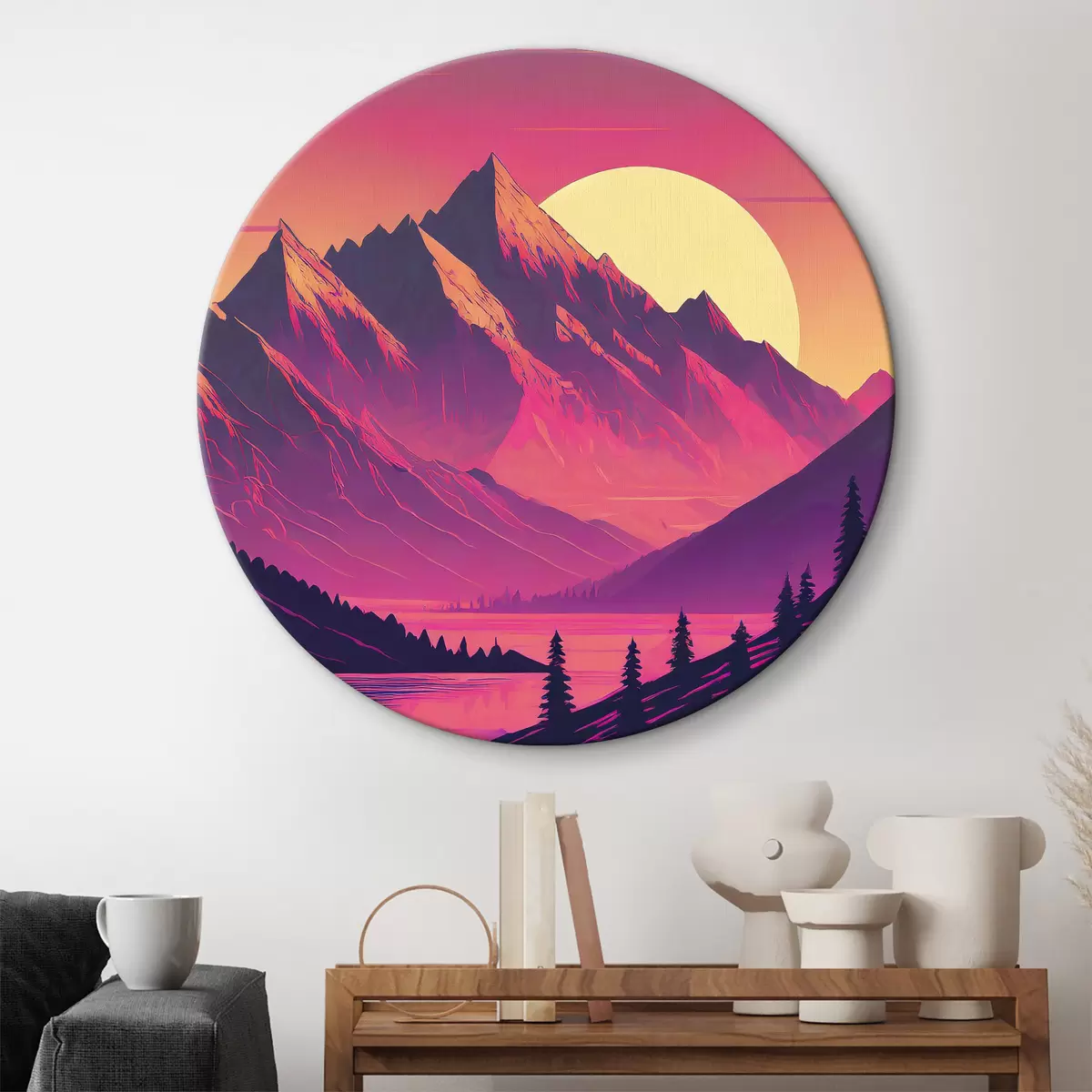 Picturi rotunde Abstract peisaj montan, culori vii, roz, cer apus de soare, futurist, soare, pădure r38000