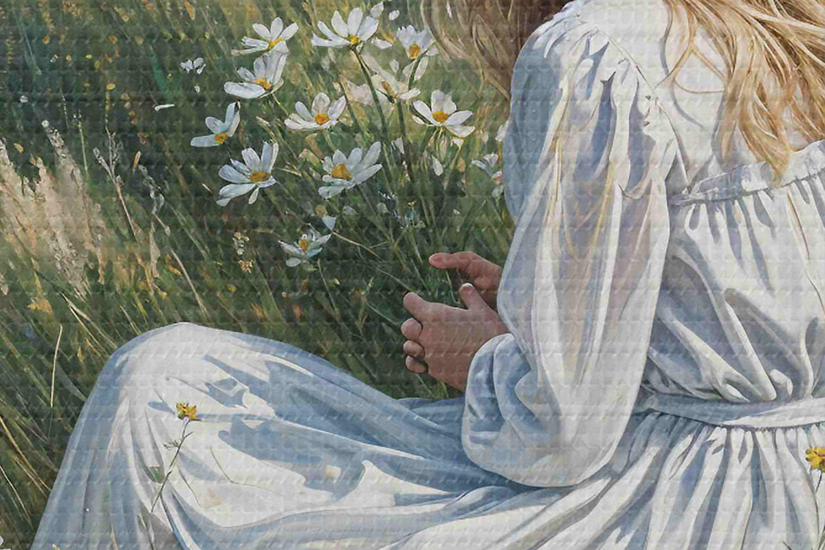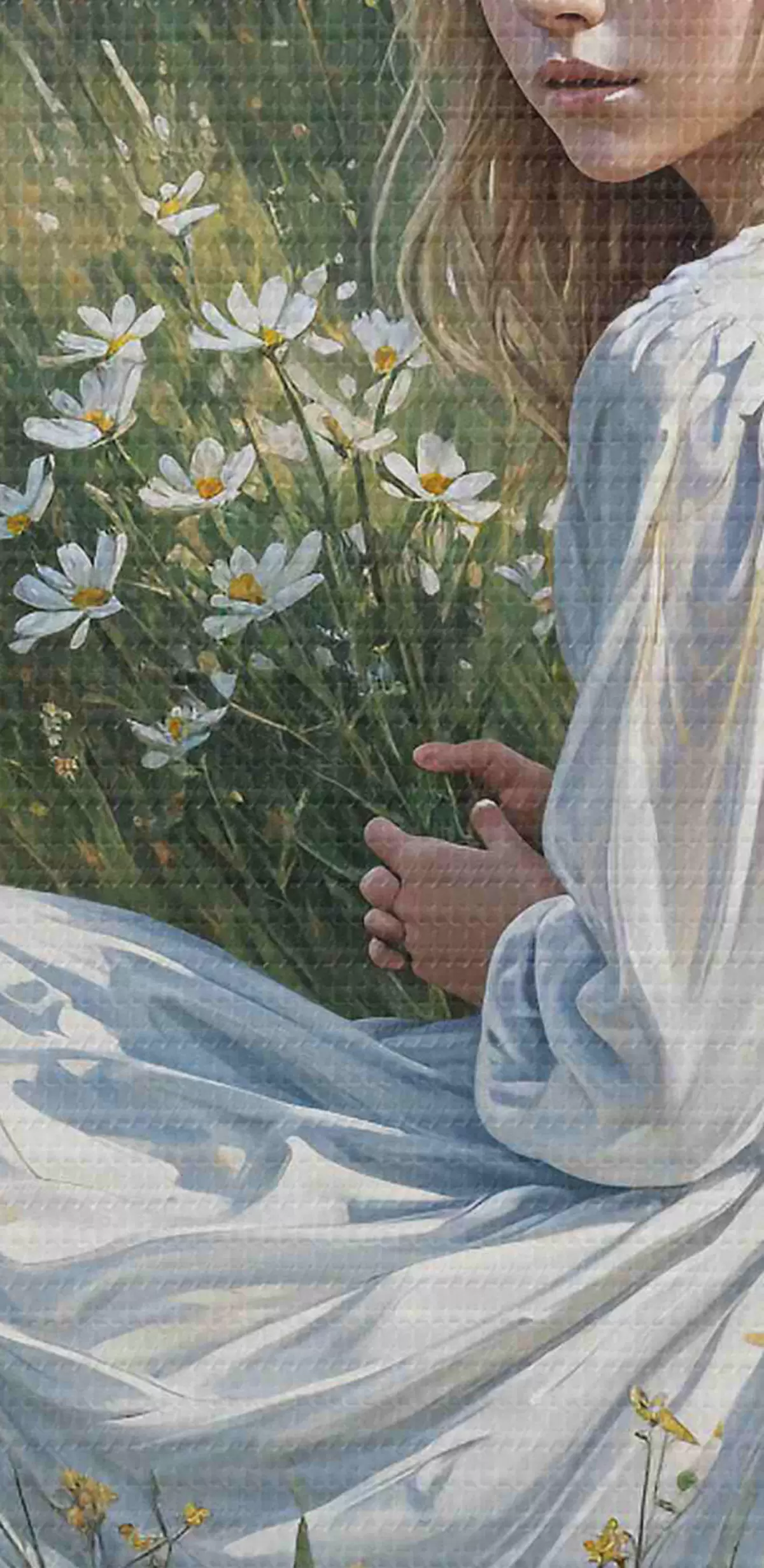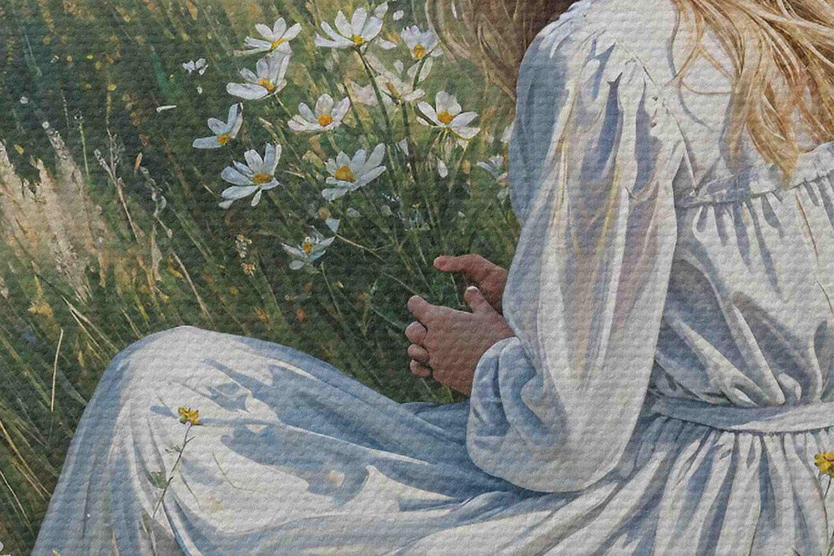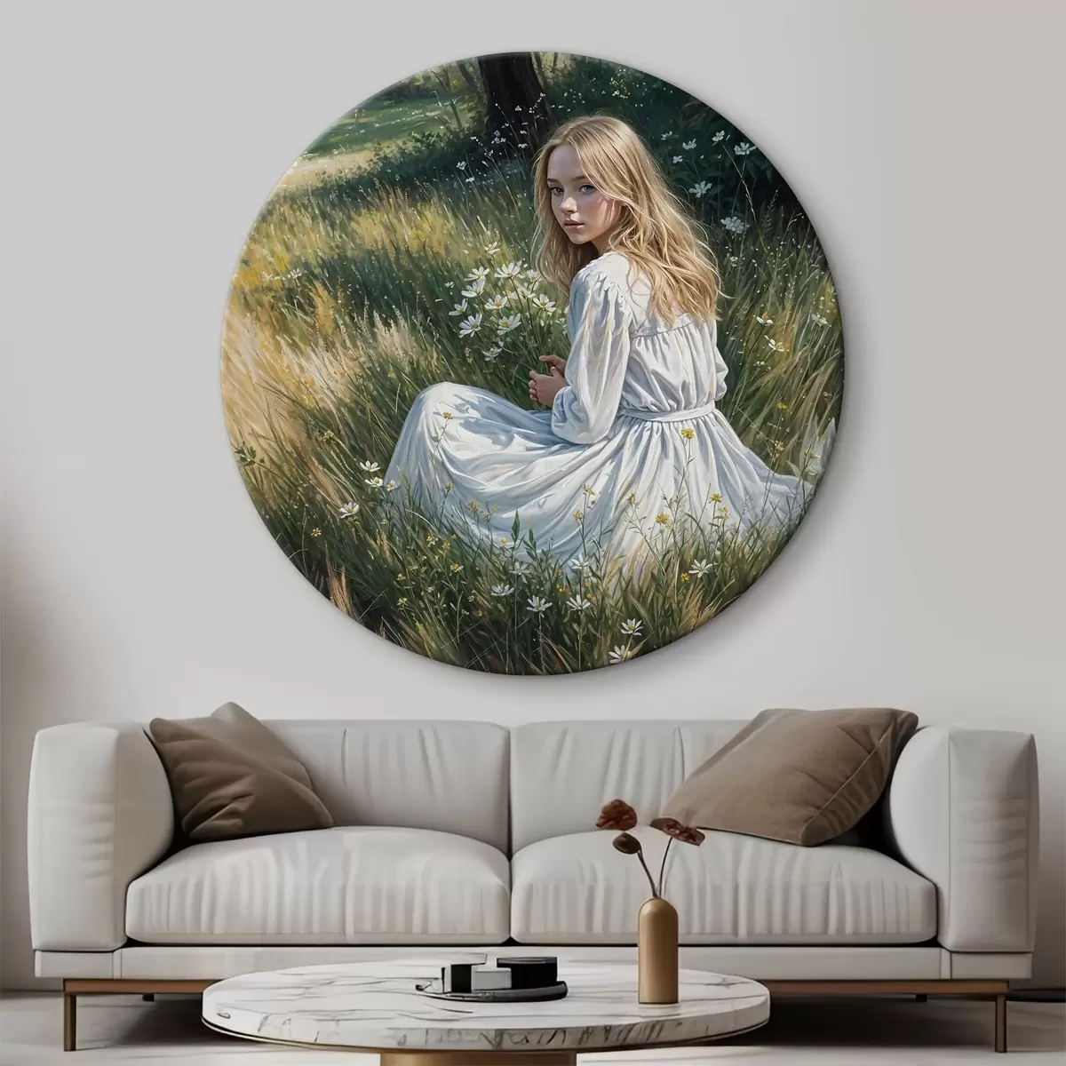 Picturi rotunde O fată într-o rochie albă stă într-un câmp de flori Nr r38196