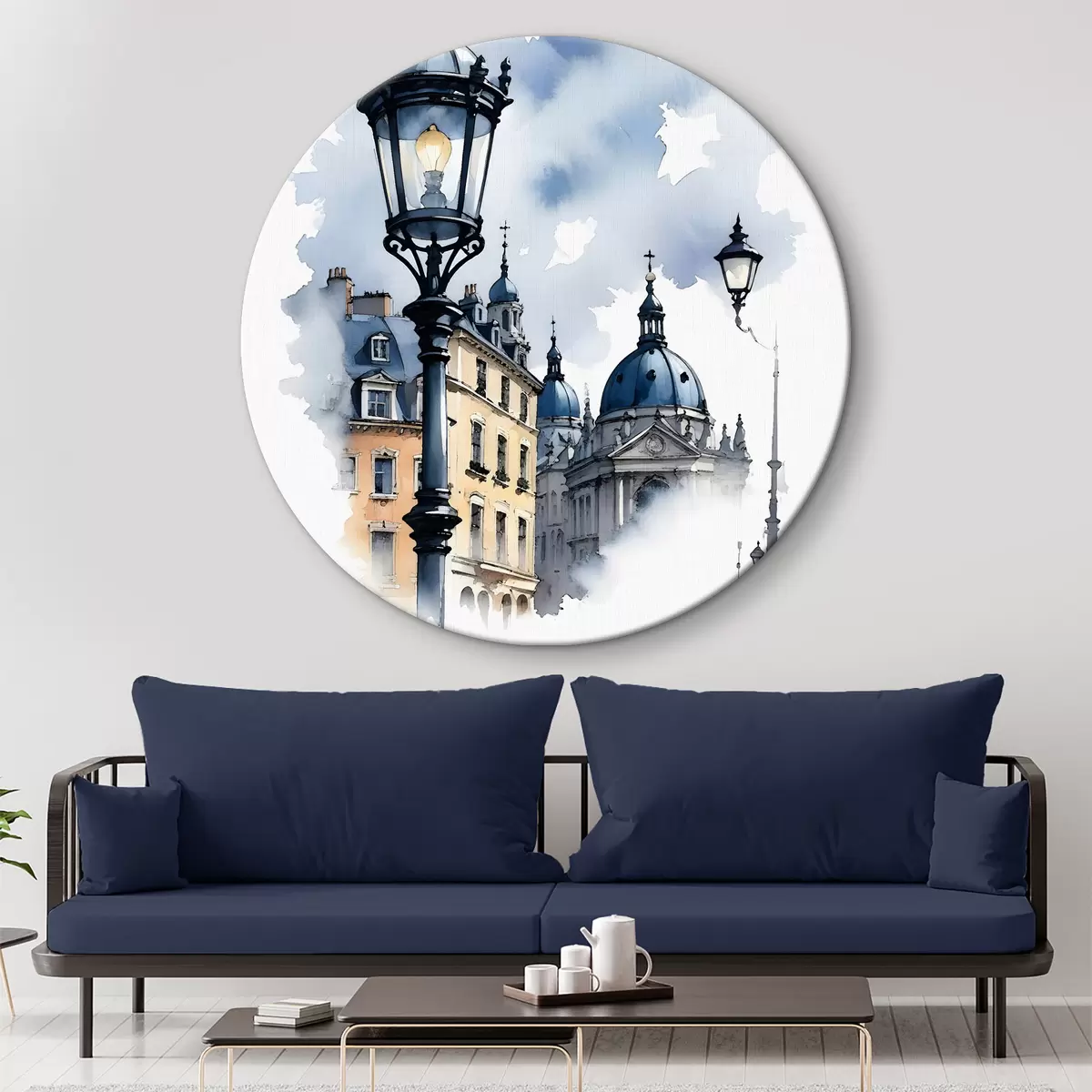Picturi rotunde O lampă de stradă ornamentată cu o clădire în formă de cupolă într-o zi noroasă Nr r38364