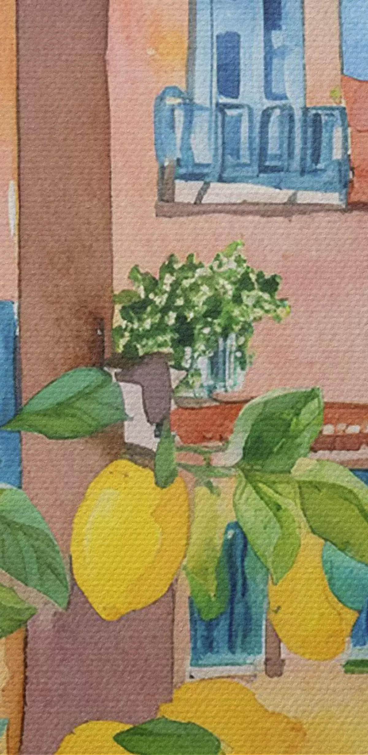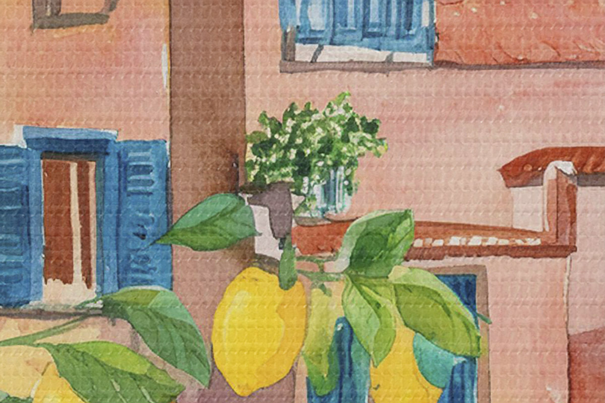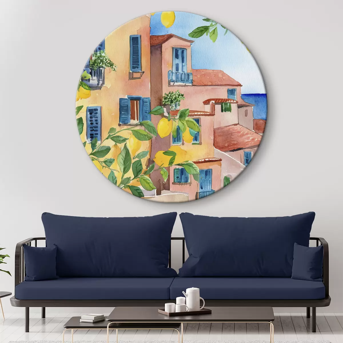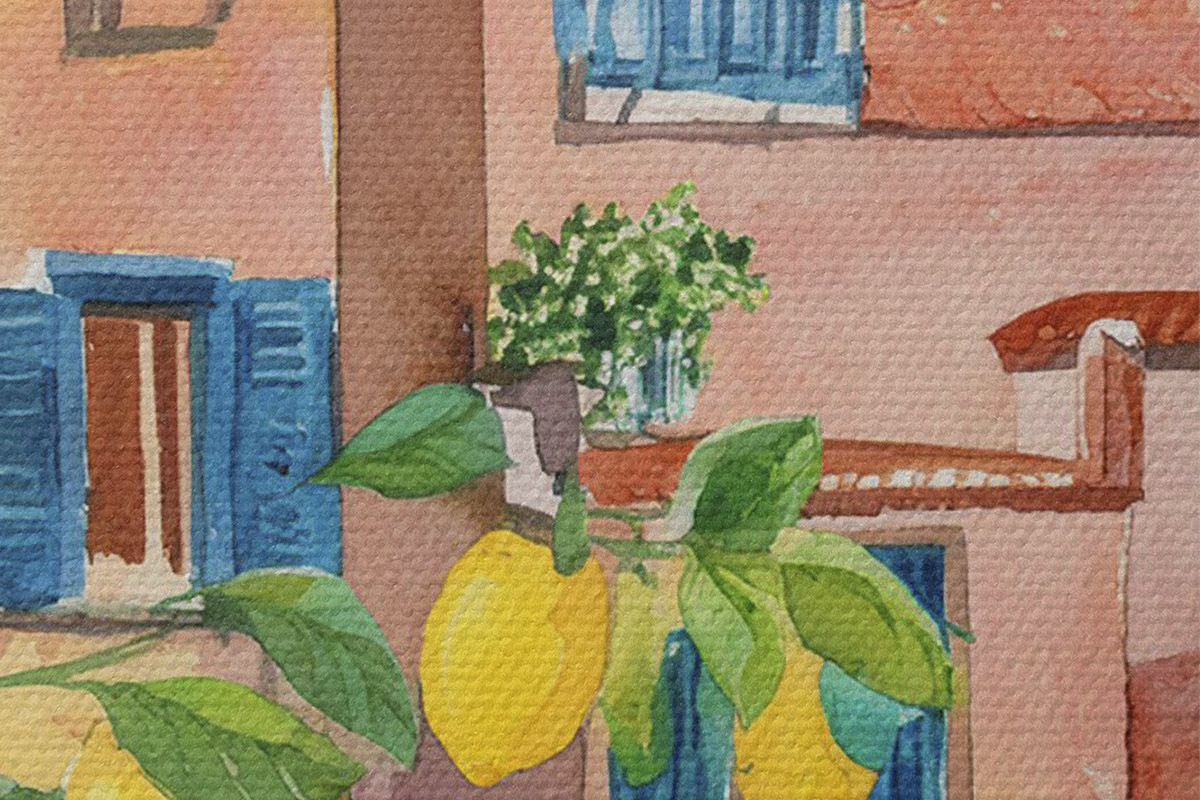 Picturi rotunde Arhitectura orașului italian, coasta mării, vară, acuarelă, copac de lămâie Nr r38395