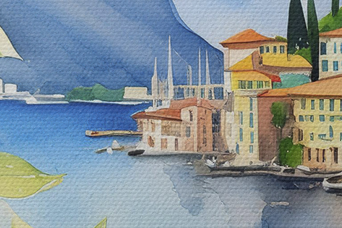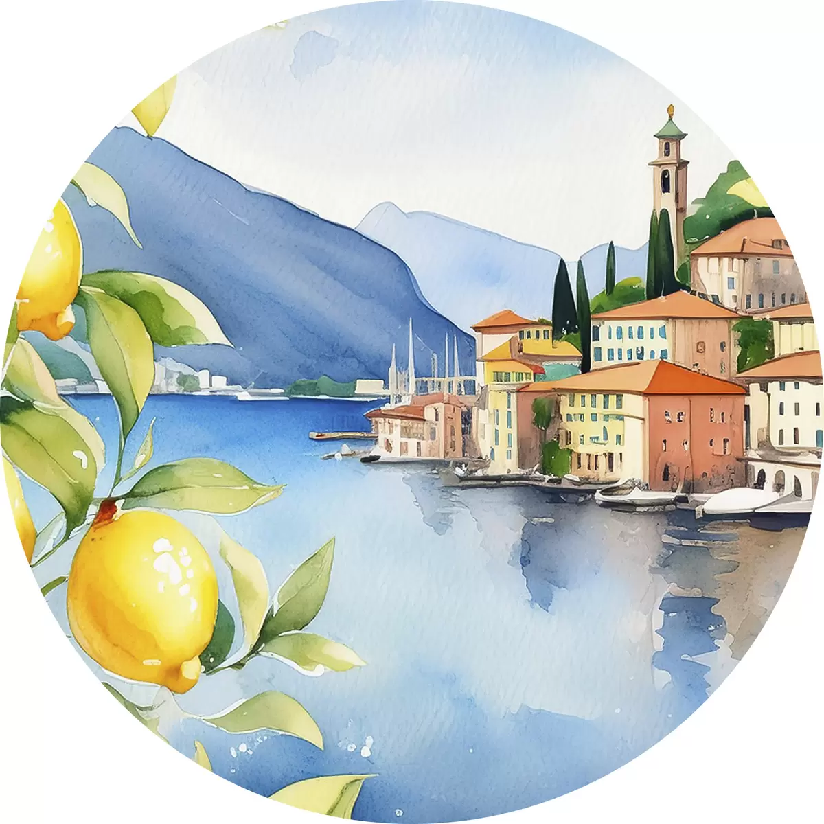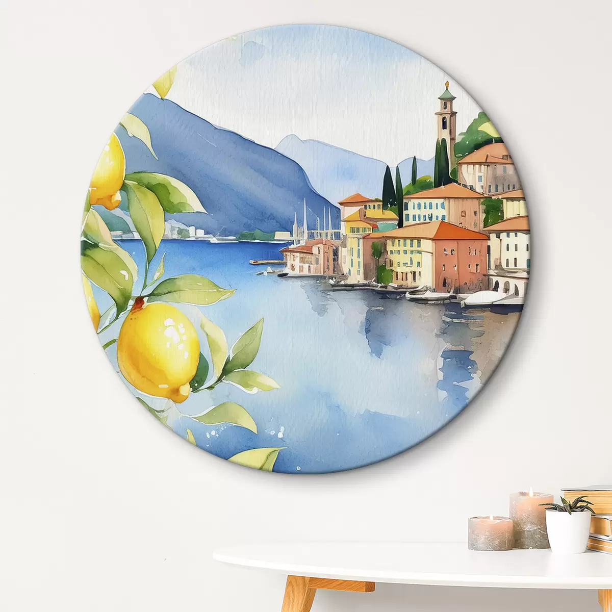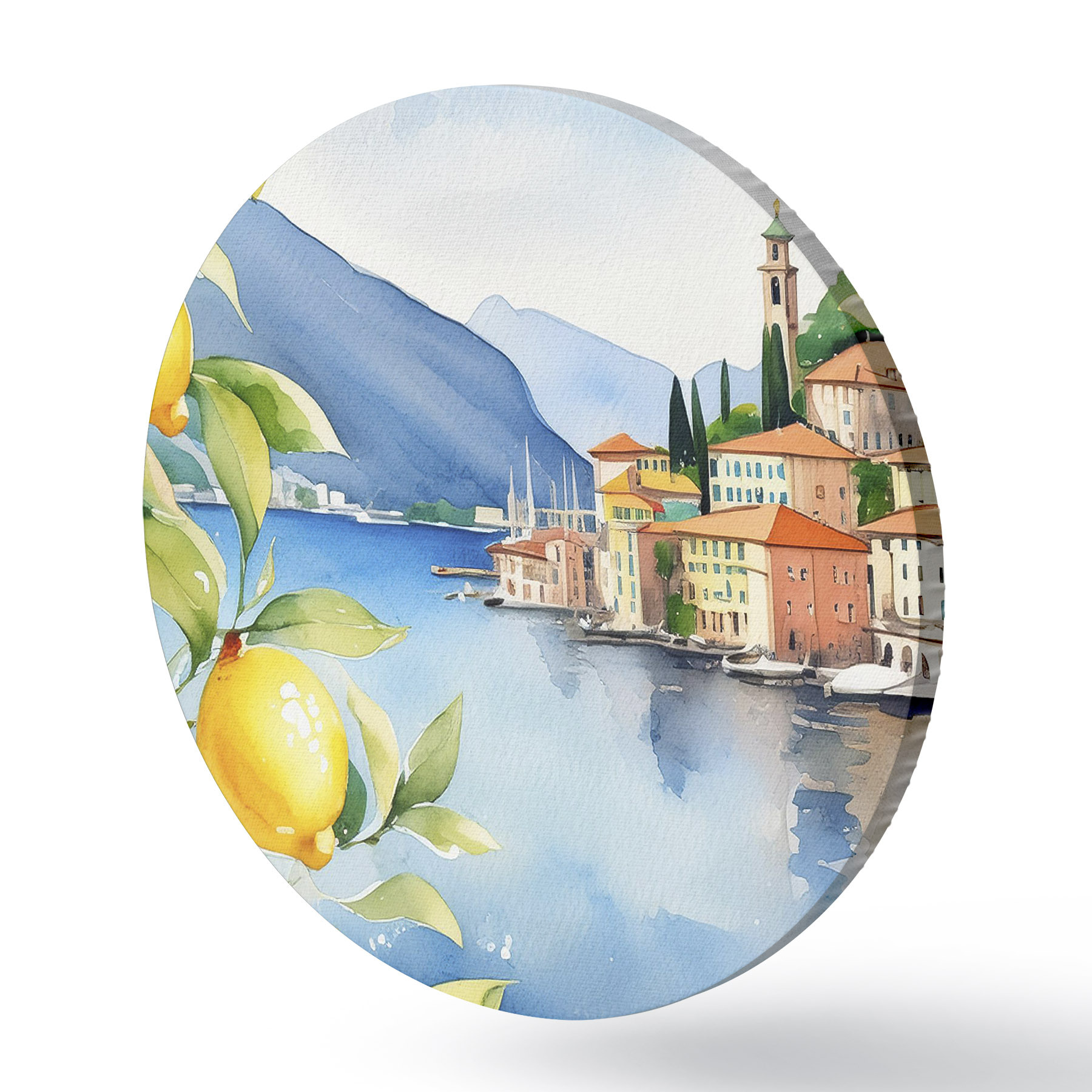 Picturi rotunde Lac italian, vară, acuarelă, peisaj natural, lămâi, arhitectura orașului Nr r38397