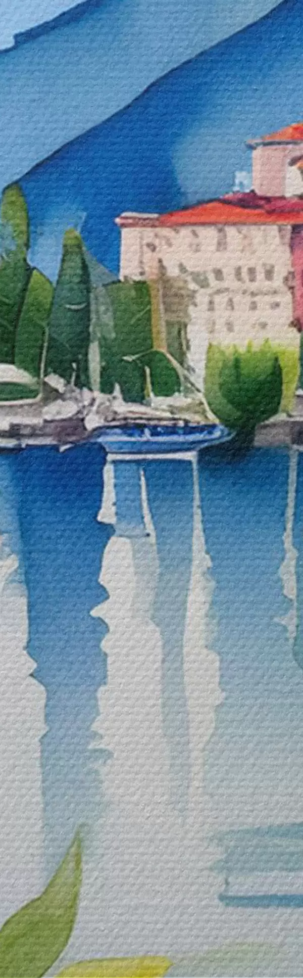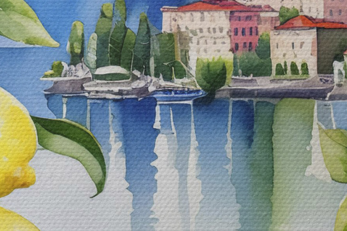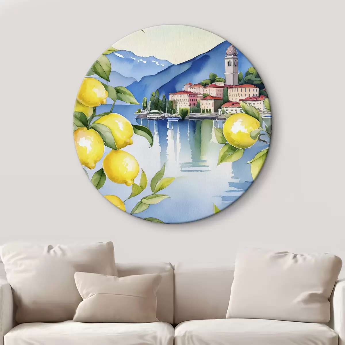 Picturi rotunde Lacul Como, acuarelă, Italia, vară, munți, lămâiță, mare, oraș vechi Nr r38398