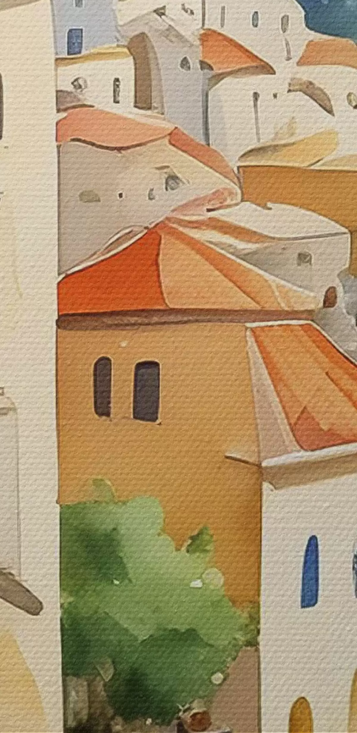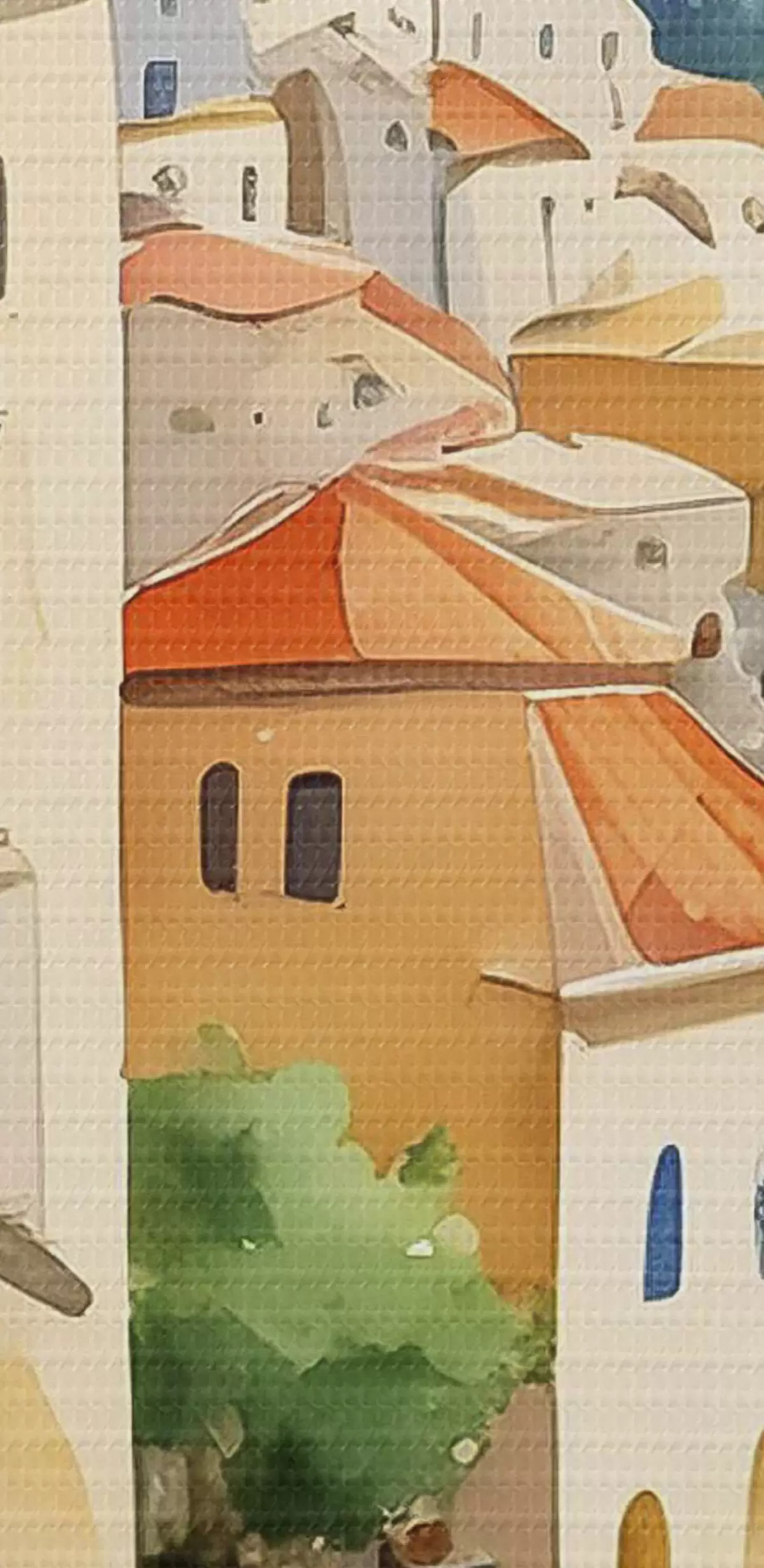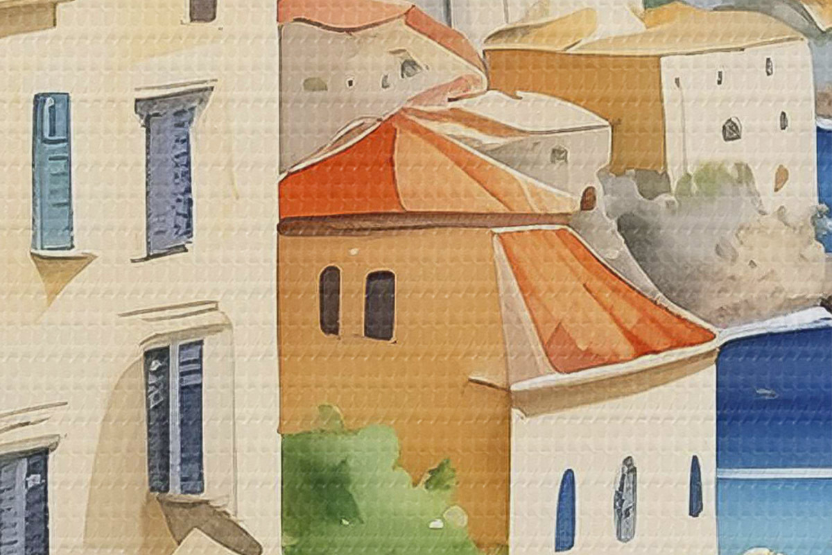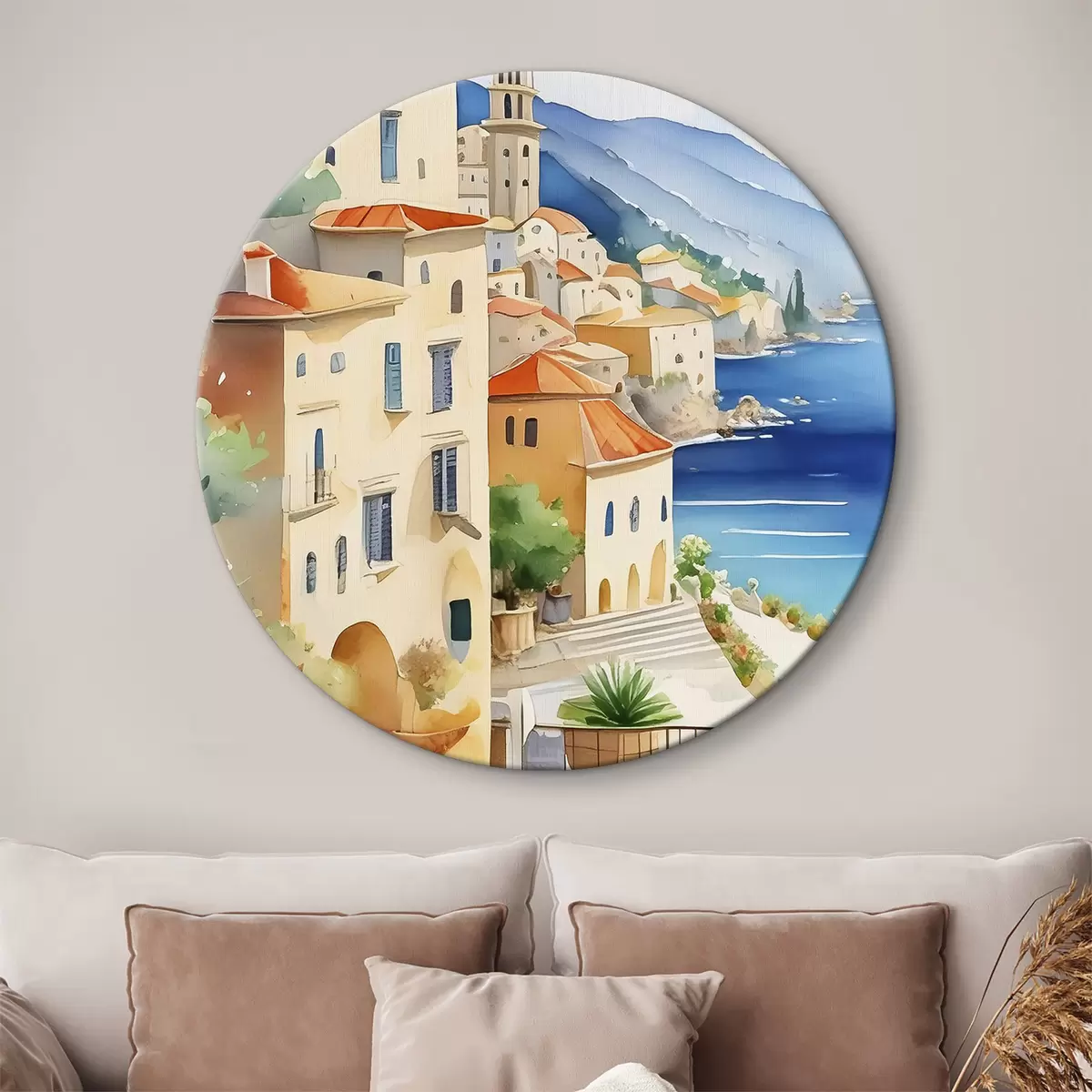 Picturi rotunde O acuarelă reprezentând un oraș pe un deal deasupra mării Nr r38409