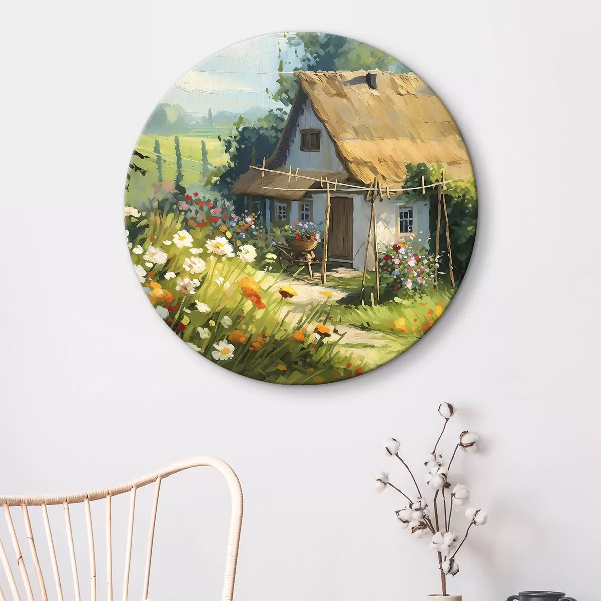 Picturi rotunde Casă de sat cu grădină, flori de vară, vopsea olil, lovituri de perie, câmp, stil rustic r38491