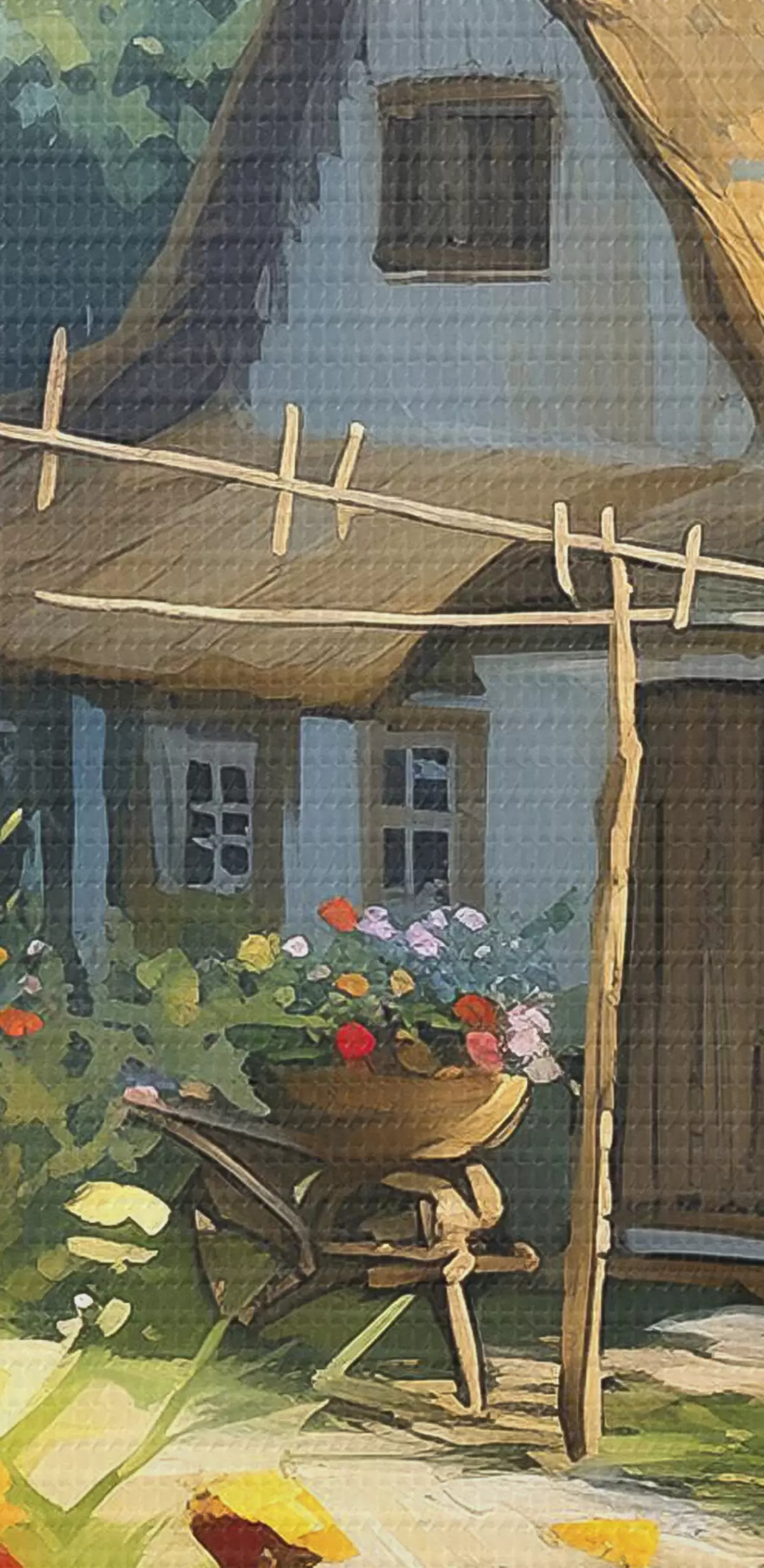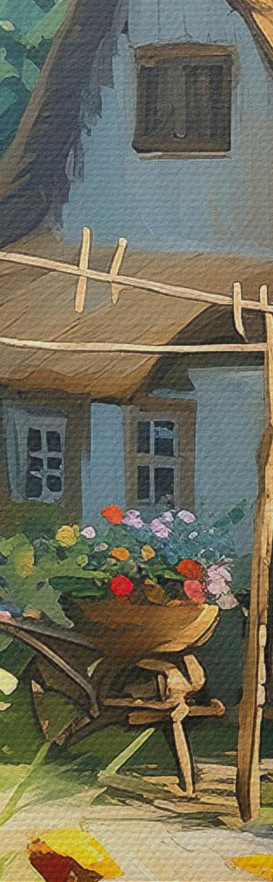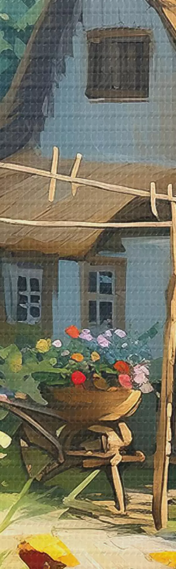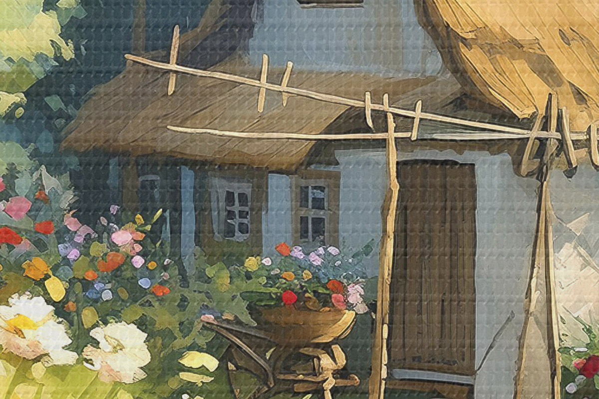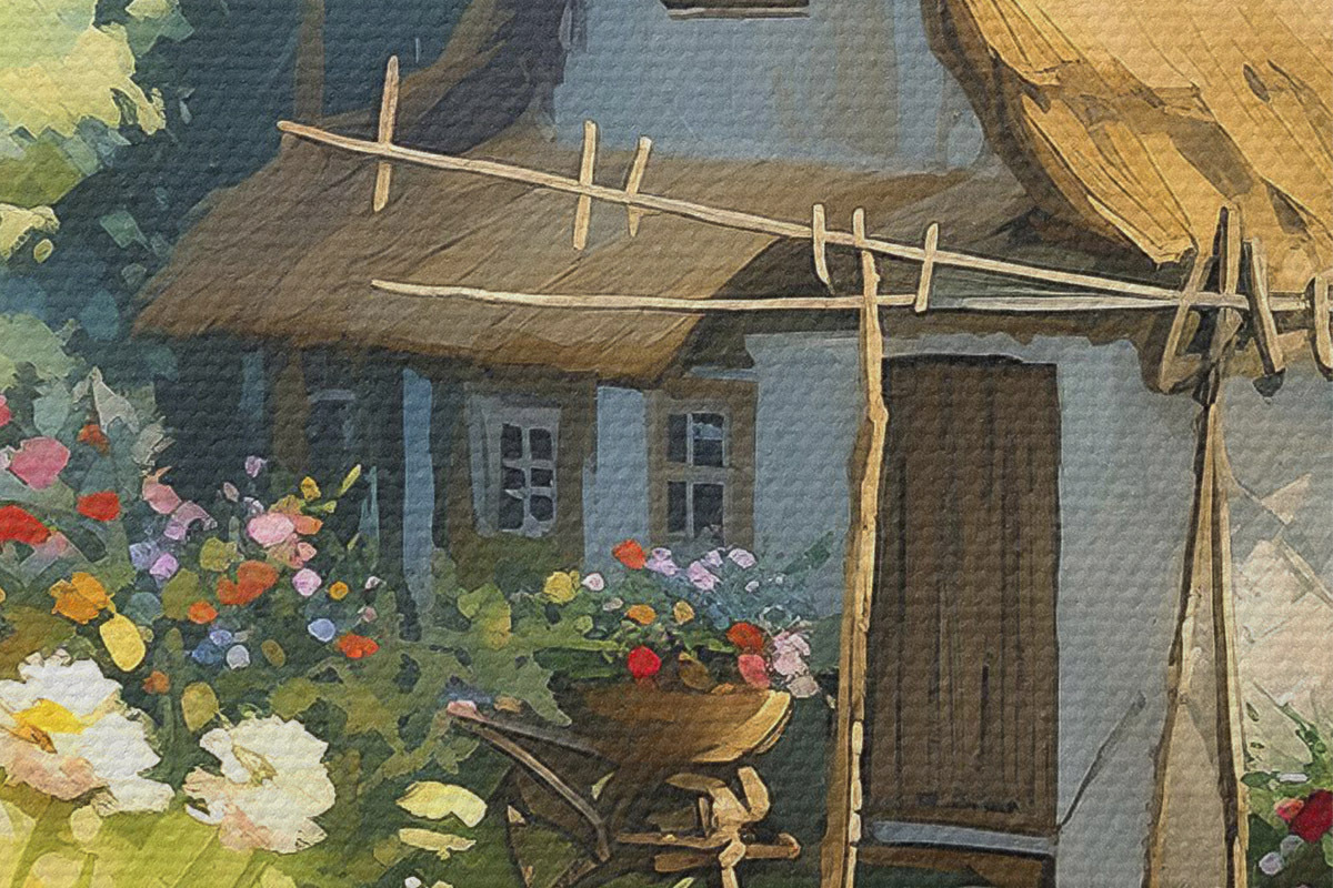 Picturi rotunde Casă de sat cu grădină, flori de vară, vopsea olil, lovituri de perie, câmp, stil rustic Nr r38491