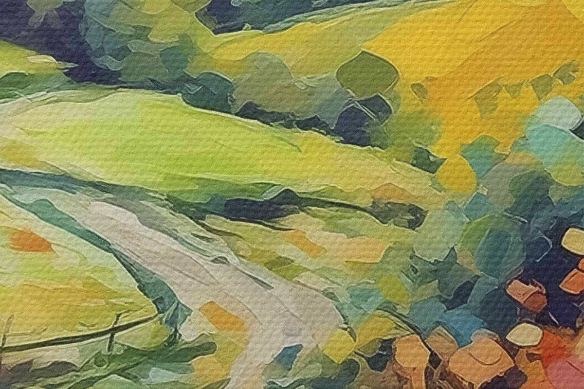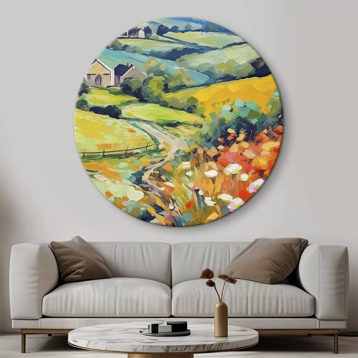 Picturi rotunde O pictură care prezintă un peisaj cu case și câmpuri Nr r38501