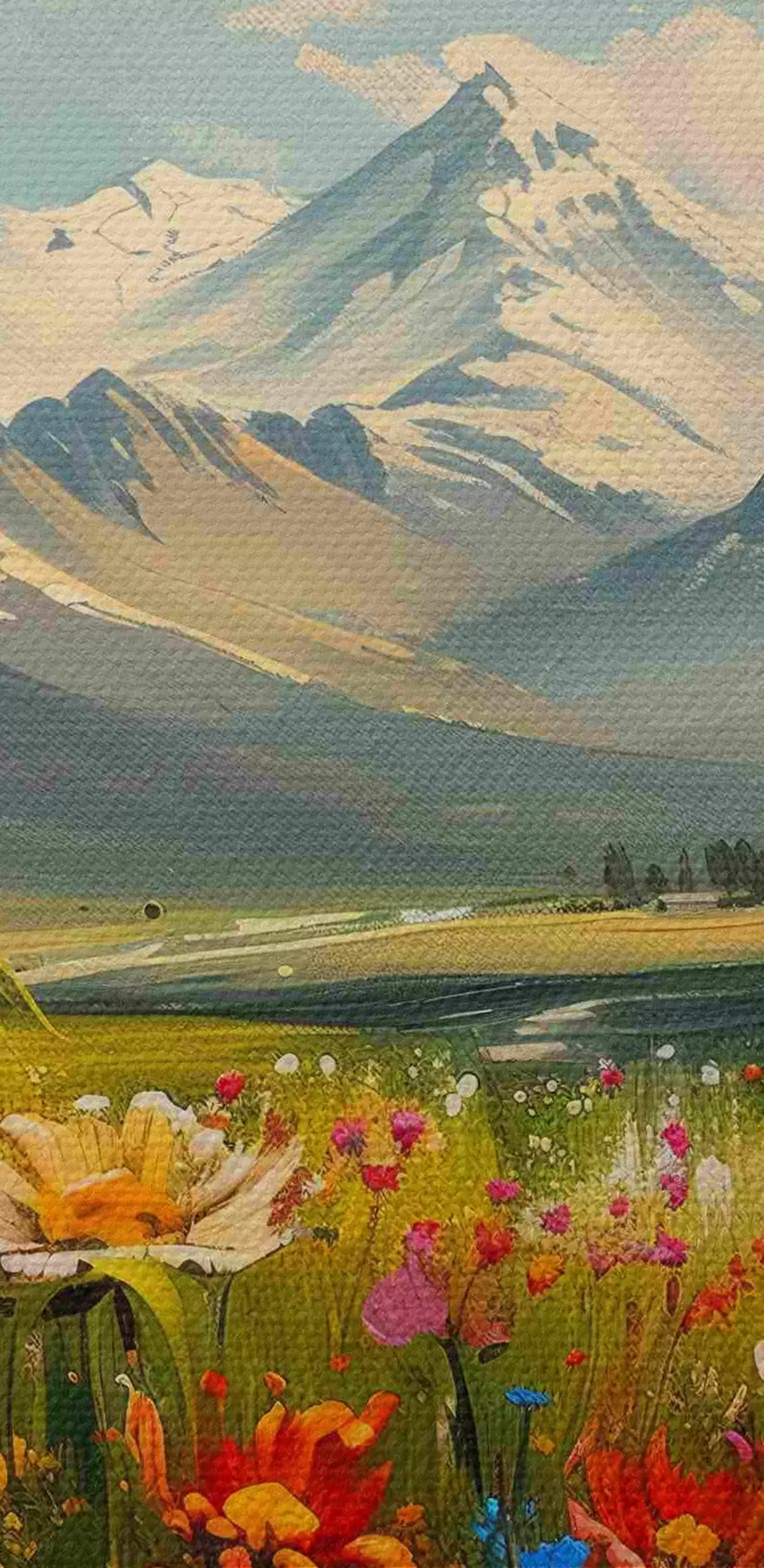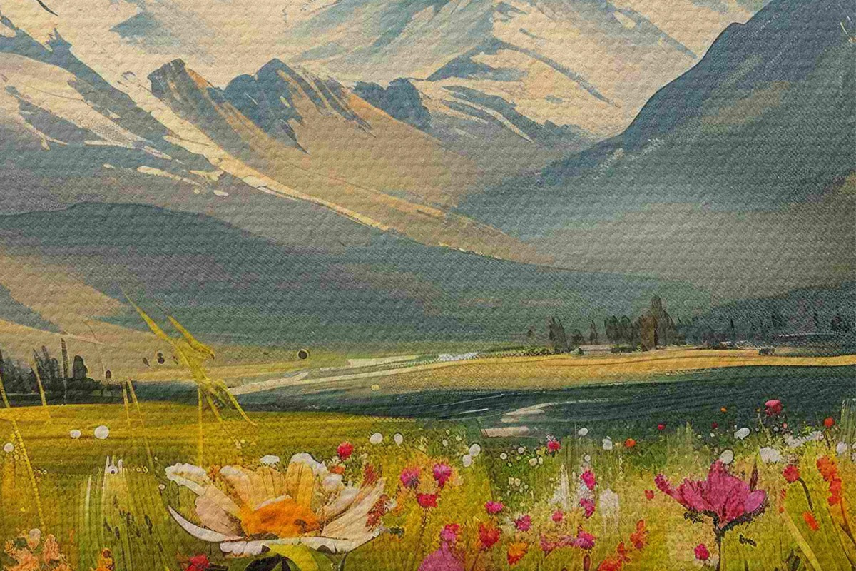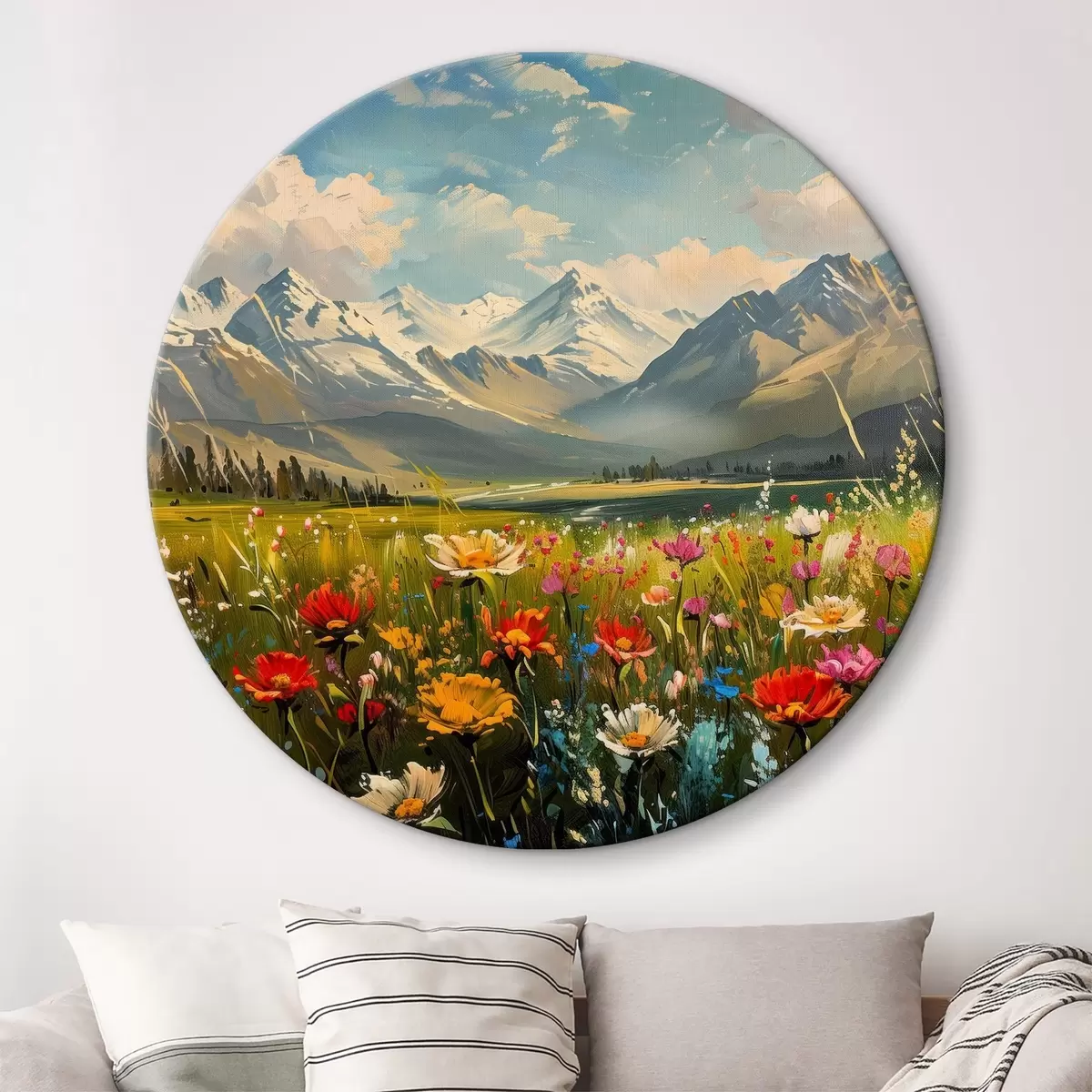 Picturi rotunde Pajiști înflorite sub vârfuri acoperite de zăpadă Nr r38573