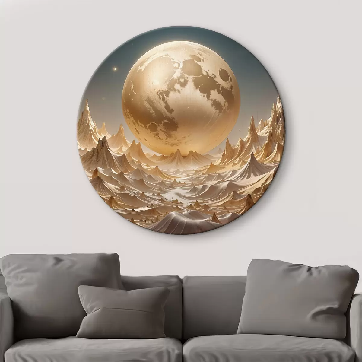 Picturi rotunde Lună plină strălucitoare deasupra unui peisaj montan suprarealist, cu vârfuri Nr r38775