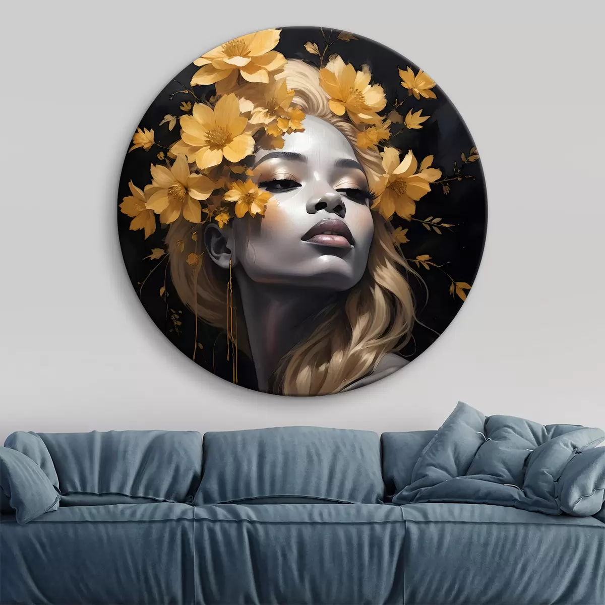 Picturi rotunde Un portret de femeie tânără înconjurat de frunze galbene de toamnă pe un fundal întunecat Nr r38834