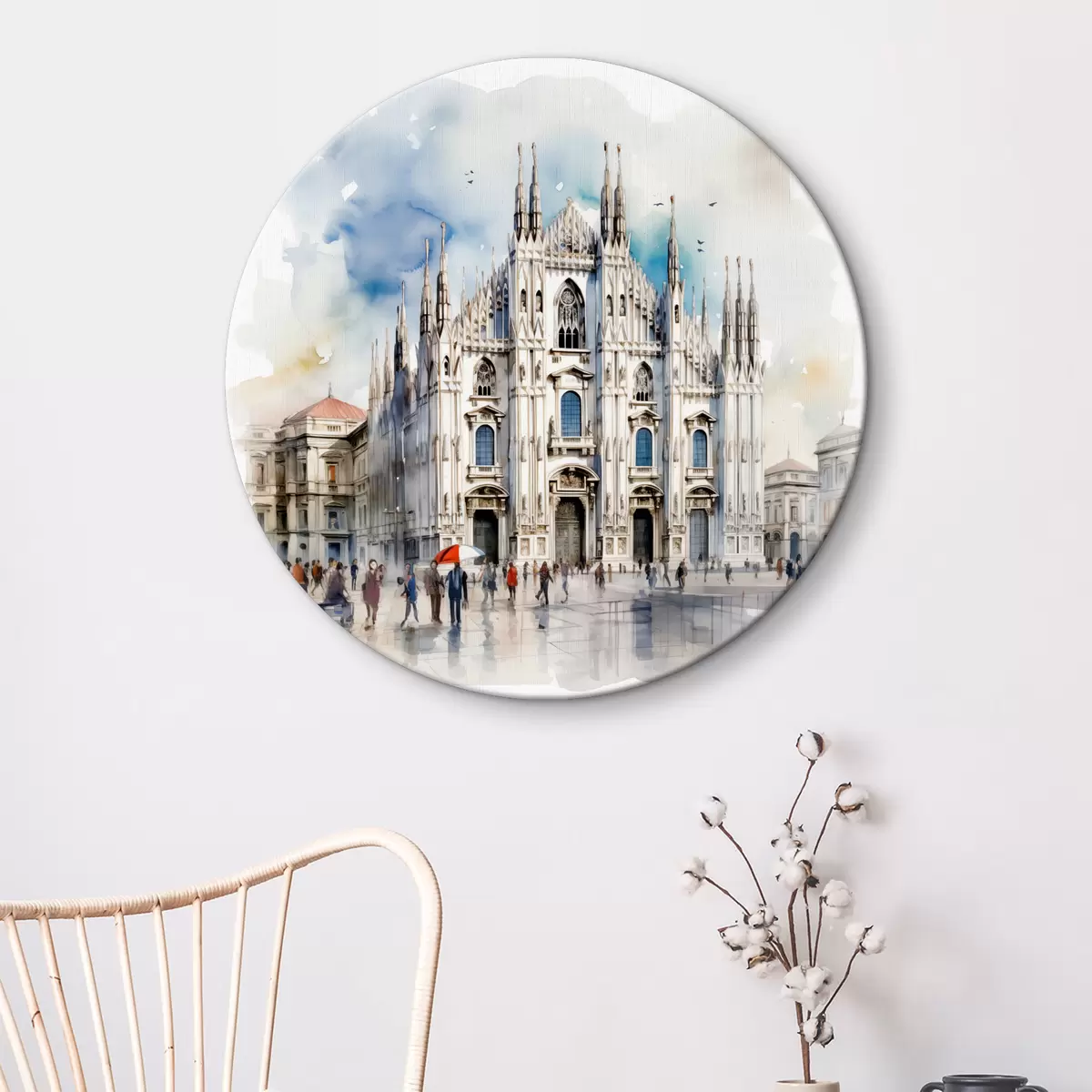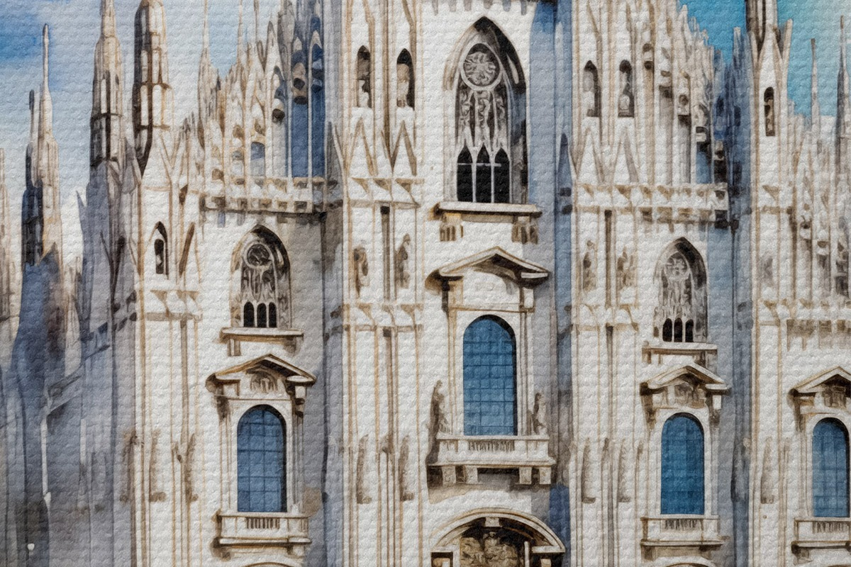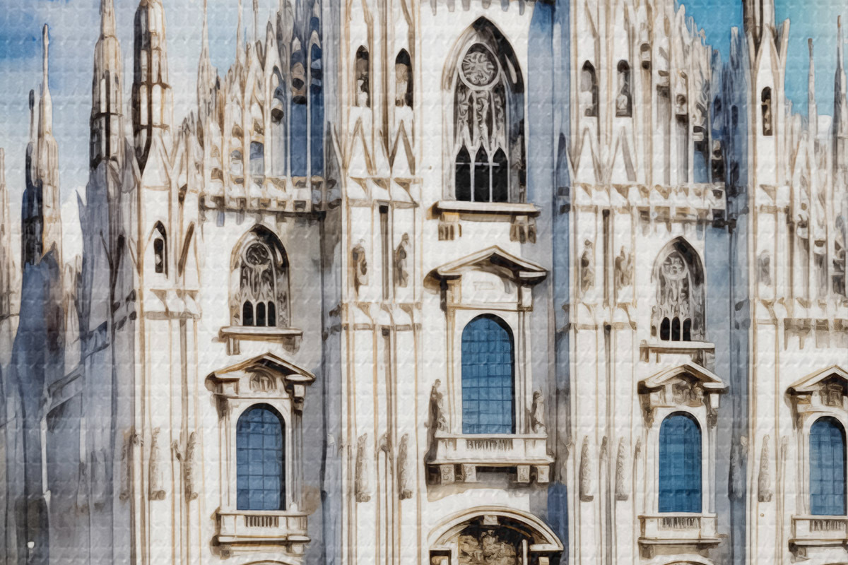 Picturi rotunde Catedrala Duomo din Milano, arhitectură, oraș, ploaie, acuarelă, albastru, gri, oameni pe jos Nr r38938