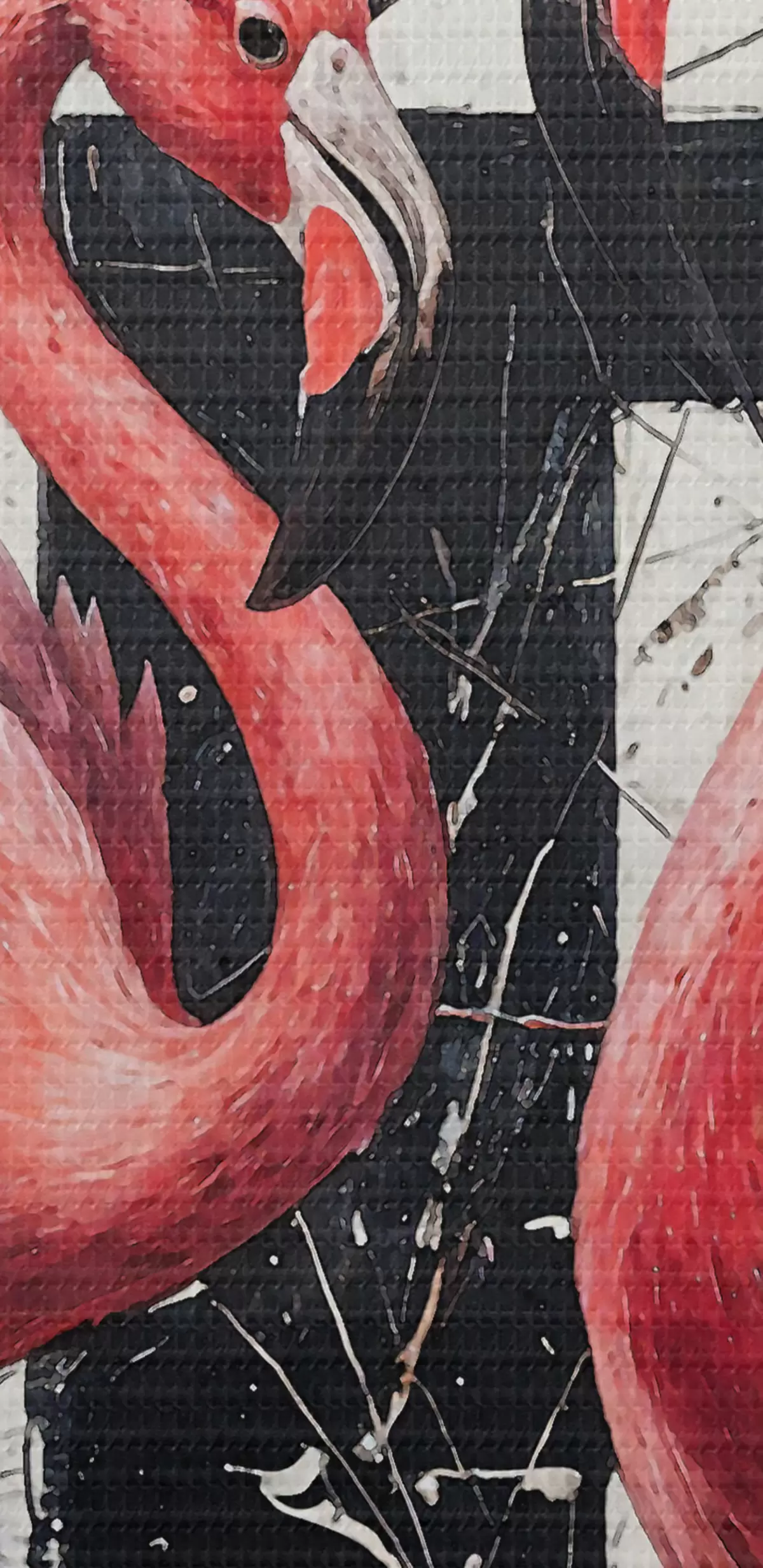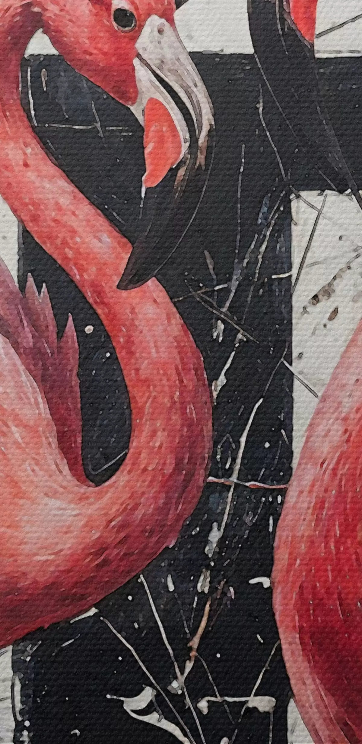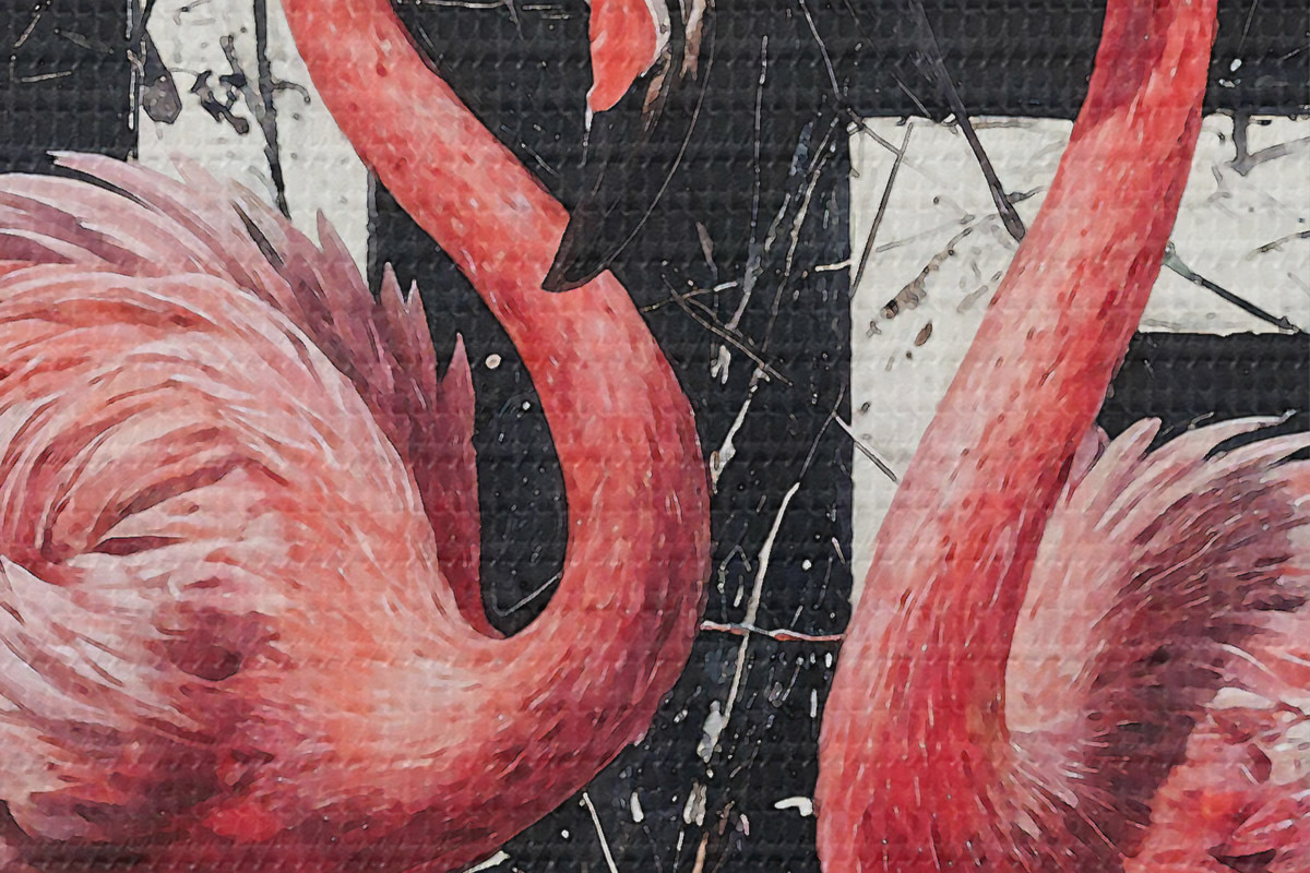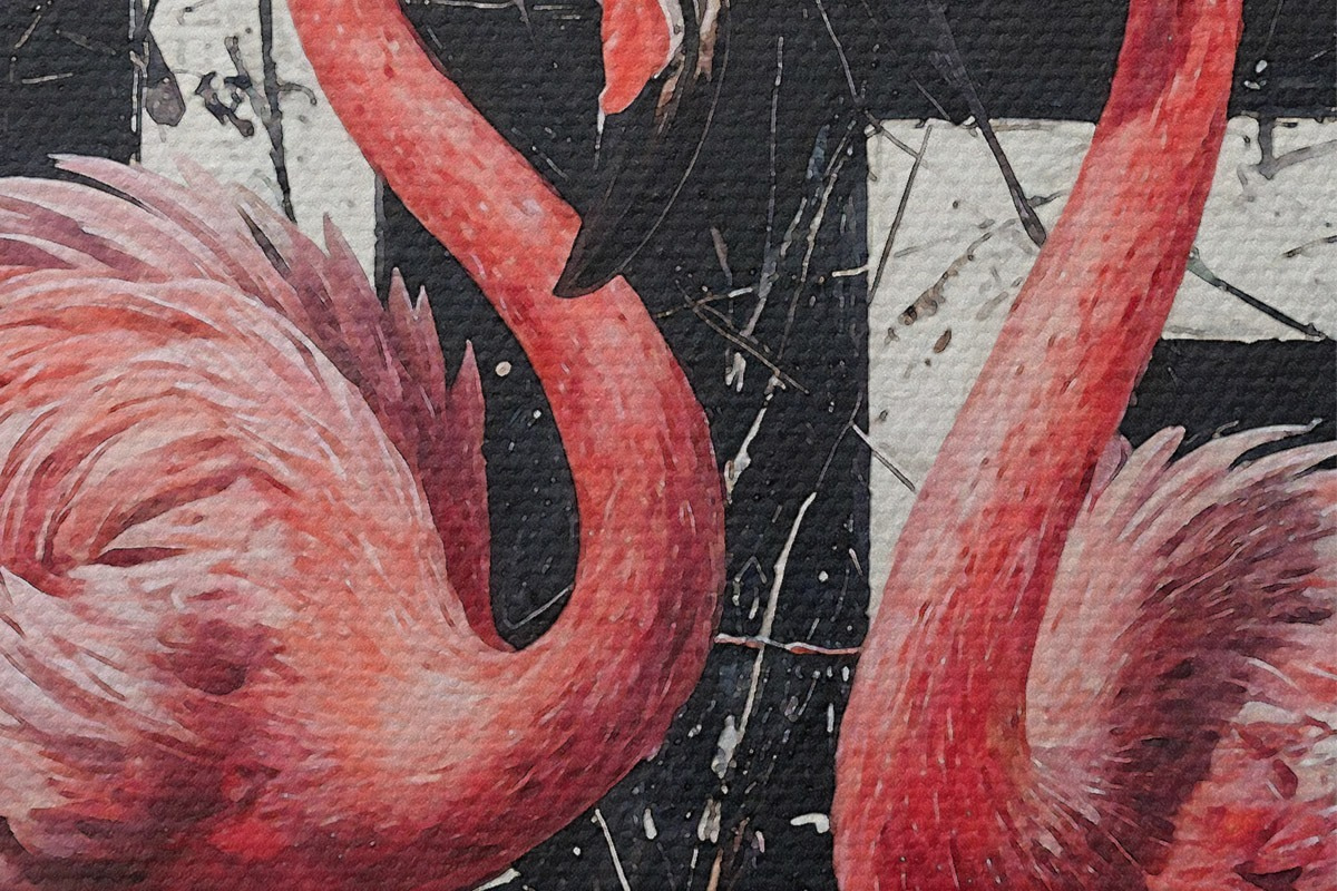 Picturi rotunde Două flamingo roz în picioare în fața unui fundal negru și alb abstract pictura de arta r38954
