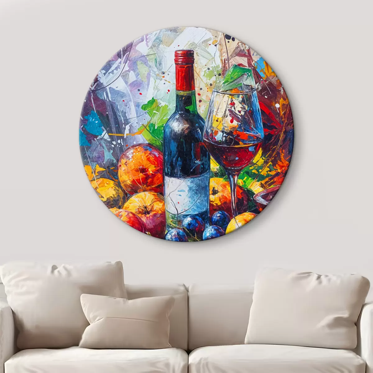 Picturi rotunde Pictură abstractă de viață statică a unei sticle de vin, a unui pahar de vin și a fructelor colorate cu stropi de diferite culori Nr r38958