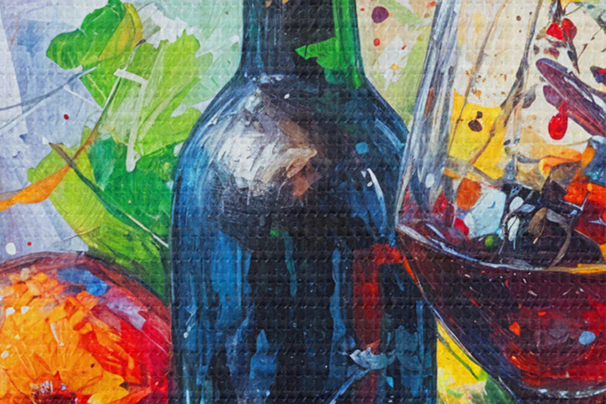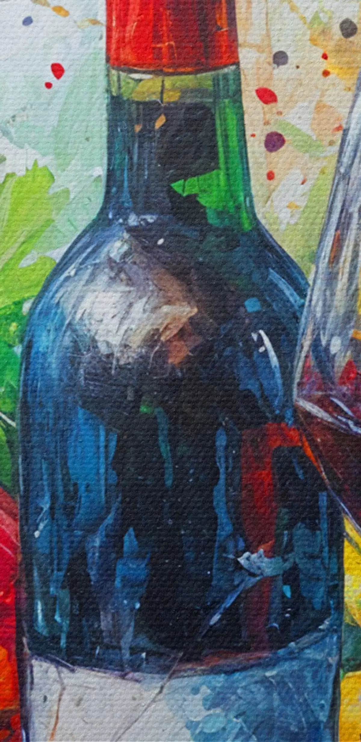 Picturi rotunde Pictură abstractă de viață statică a unei sticle de vin, a unui pahar de vin și a fructelor colorate cu stropi de diferite culori r38958