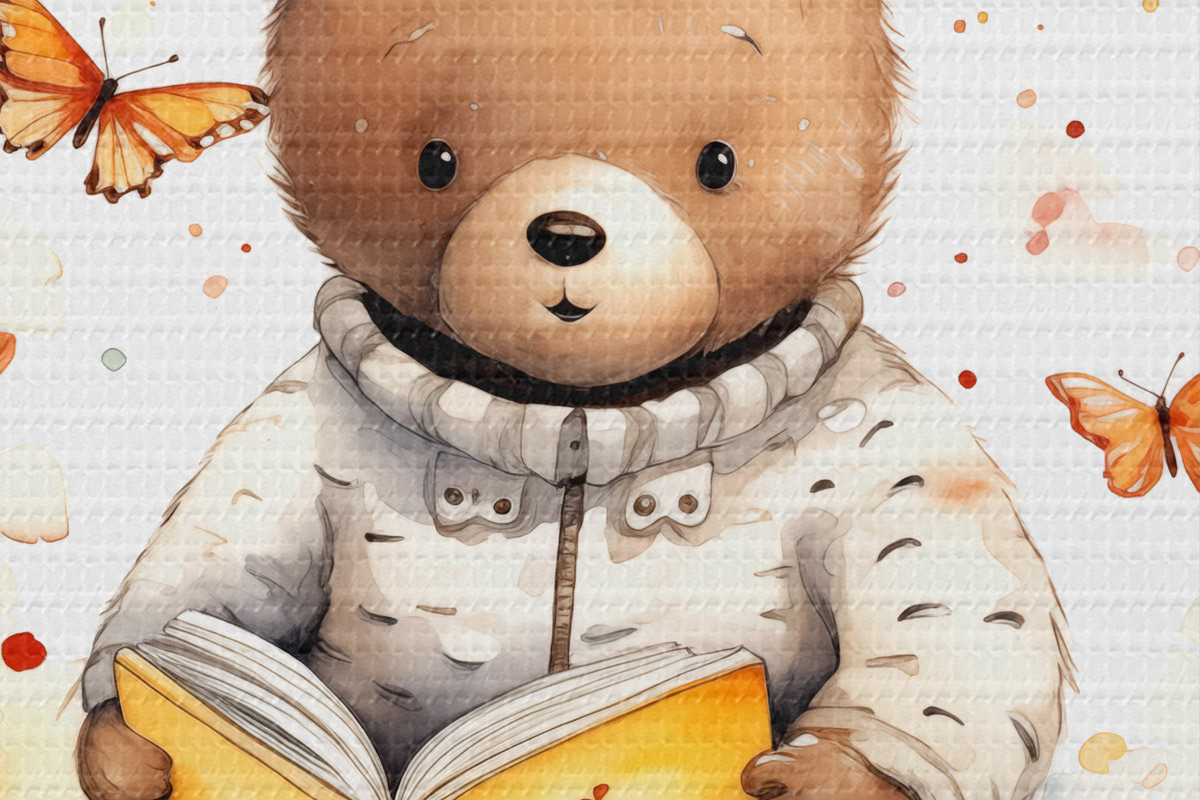 Picturi rotunde Pui de urs brun într-un pulover citește o carte înconjurat de fluturi acuarelă r39025