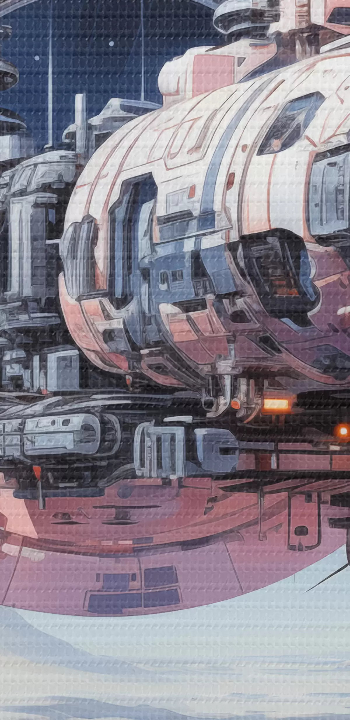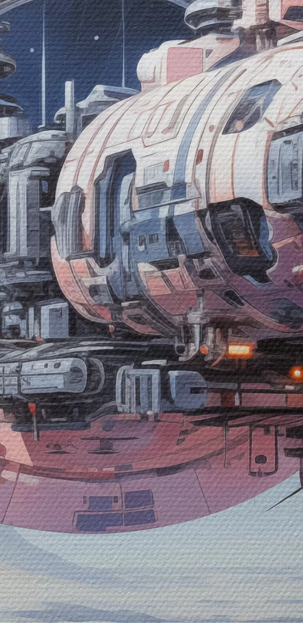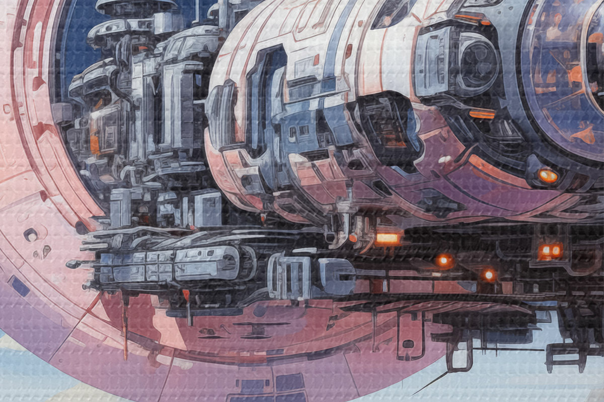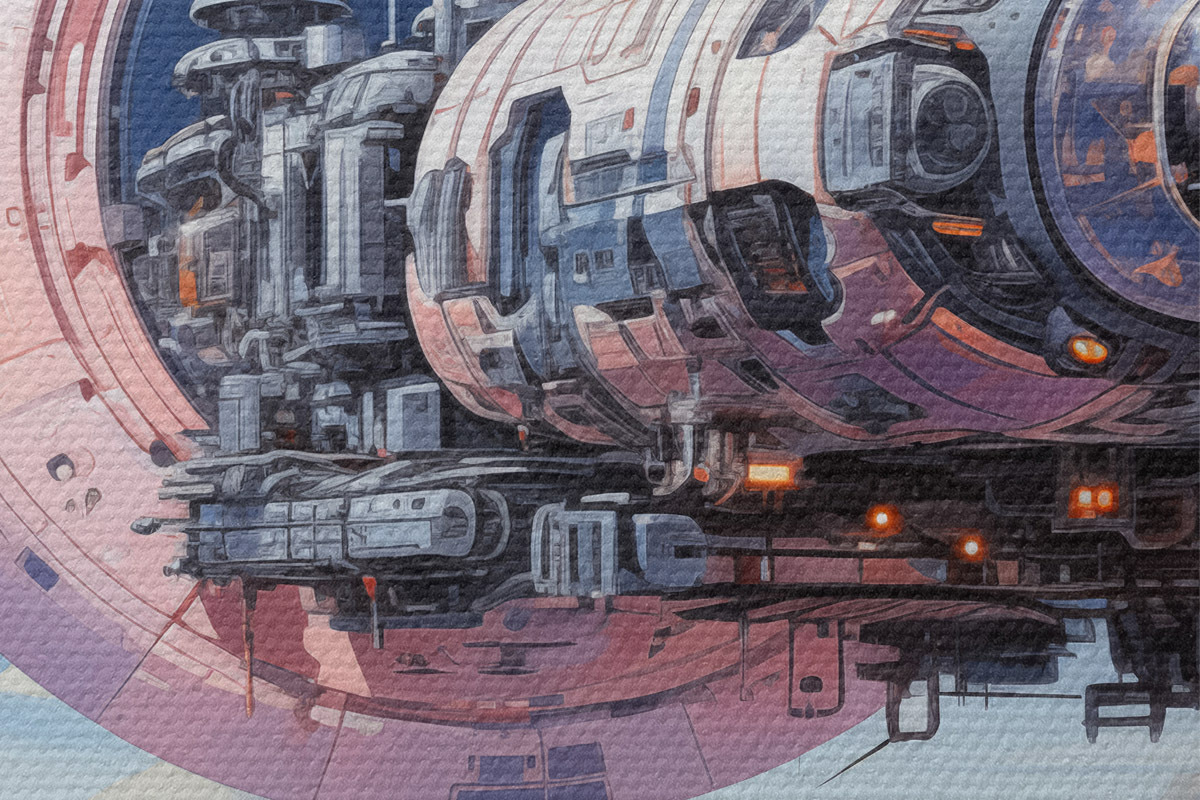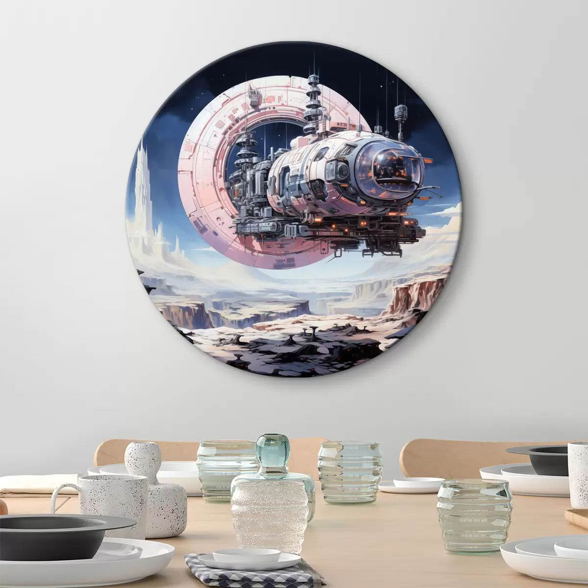Picturi rotunde O navă spațială în stil cyberpunk zboară în spațiu peste un asteroid și o planetă, de culoare albastru, bej, roz, alb Nr r39115