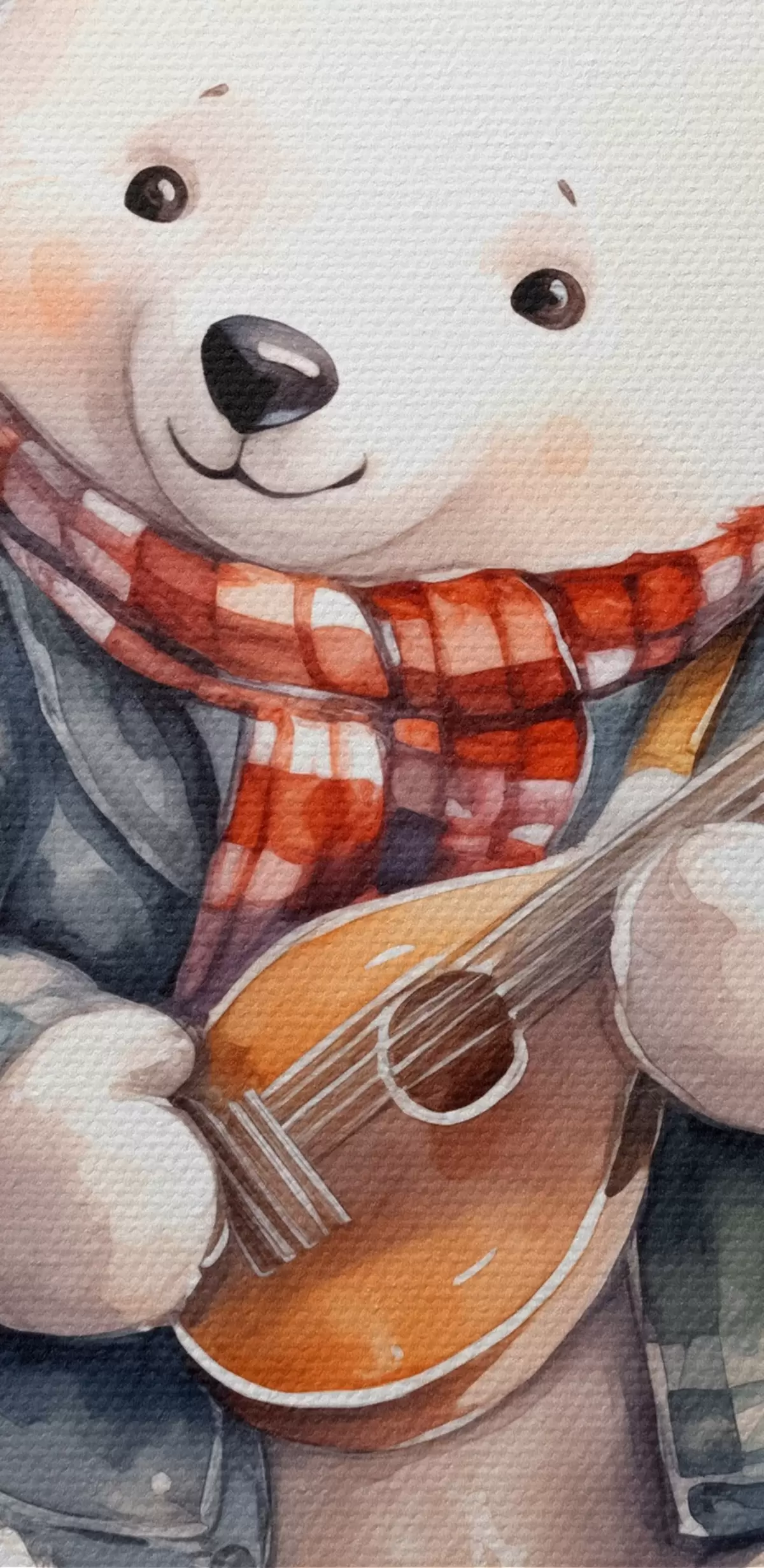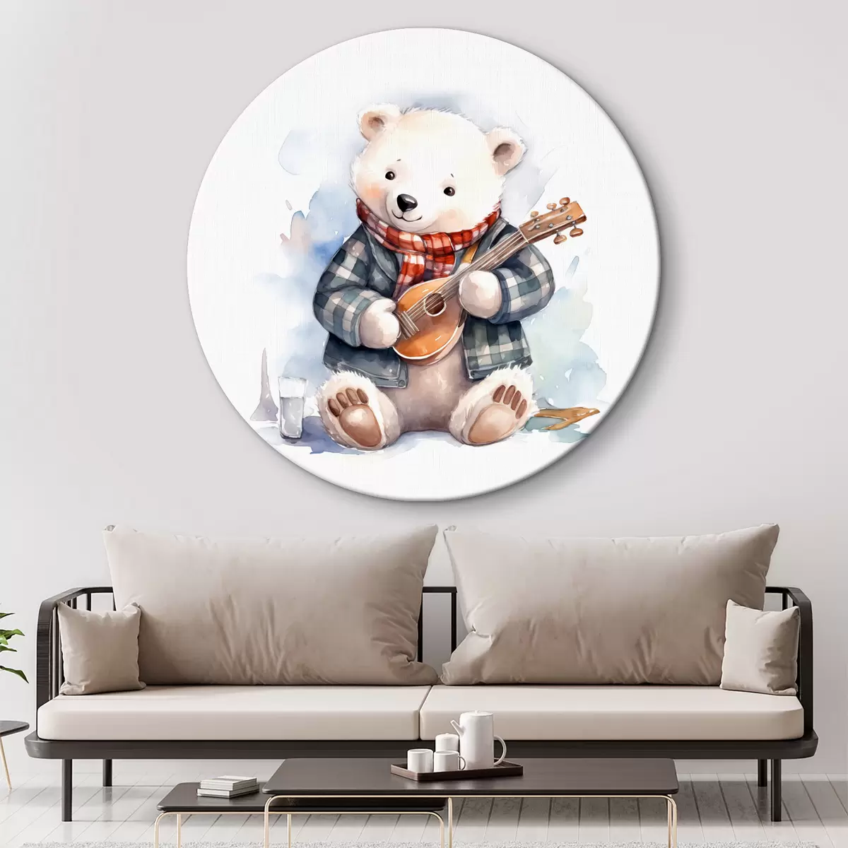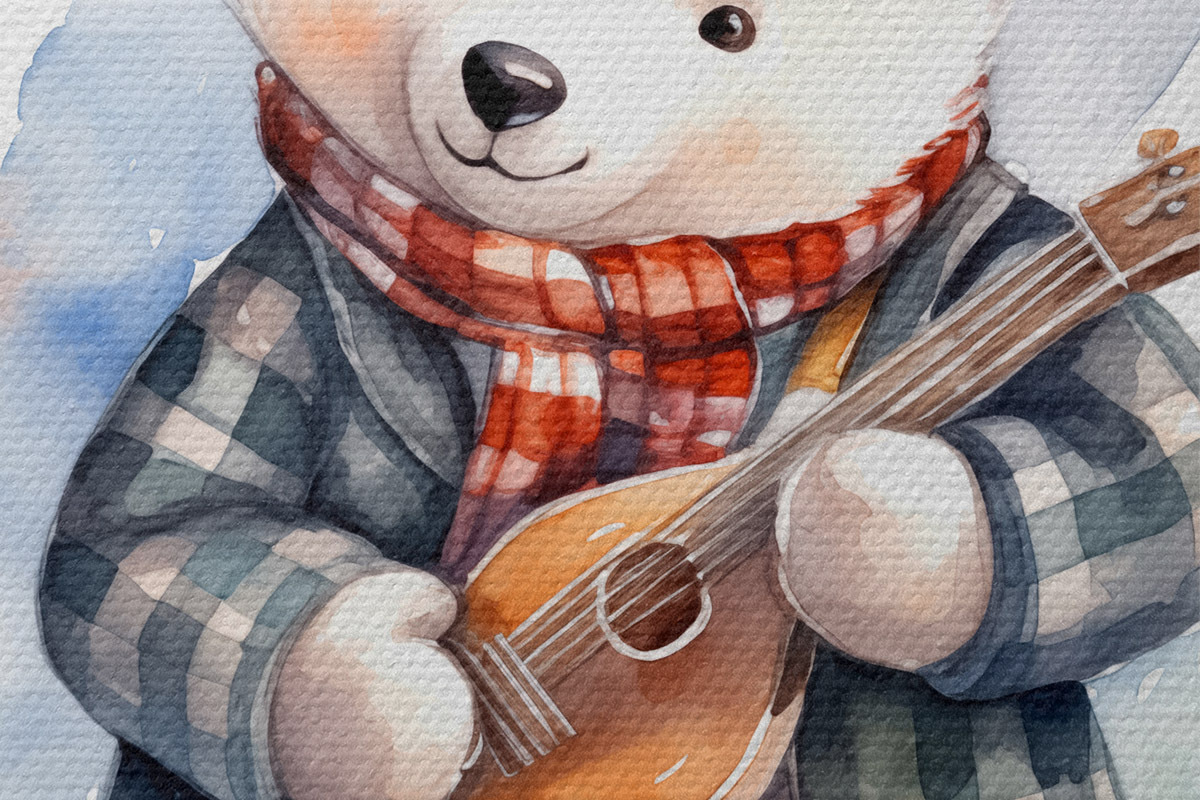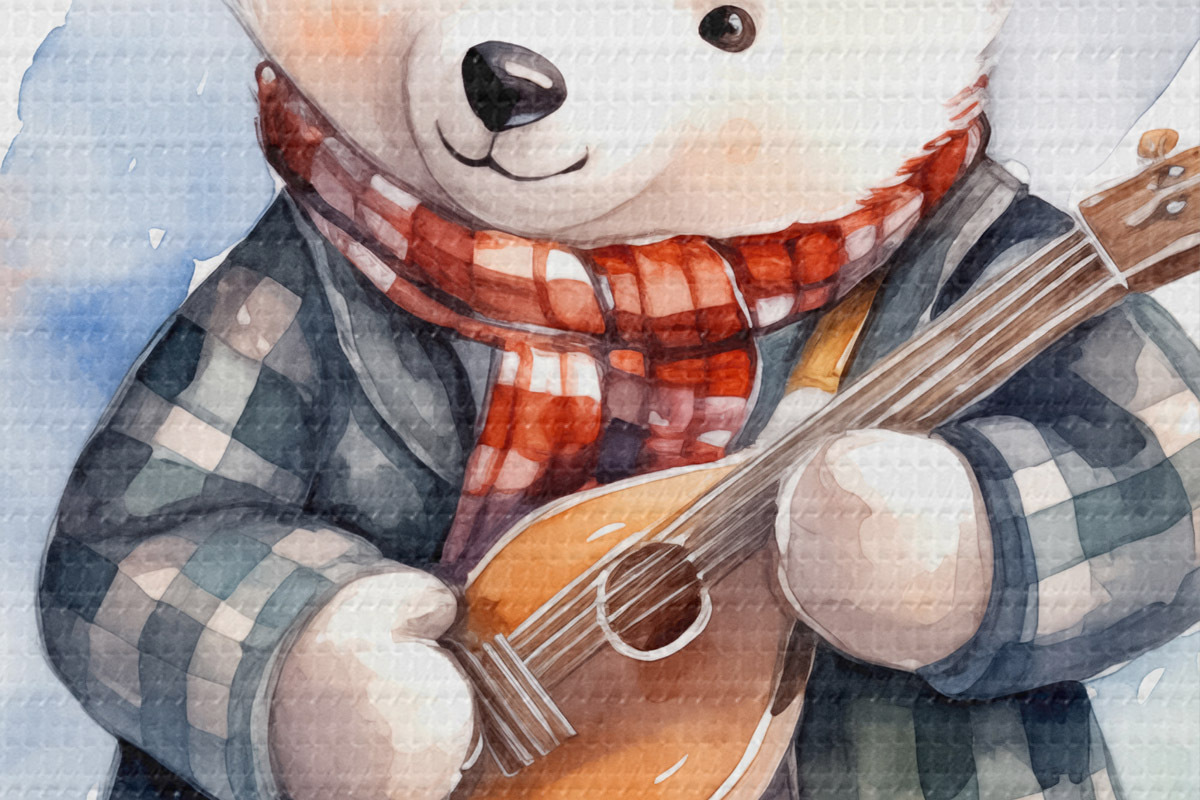 Picturi rotunde Polar urs muzician într-un costum albastru în carouri și eșarfă roșie joacă chitara copii acuarelă ilustrare Nr r39120