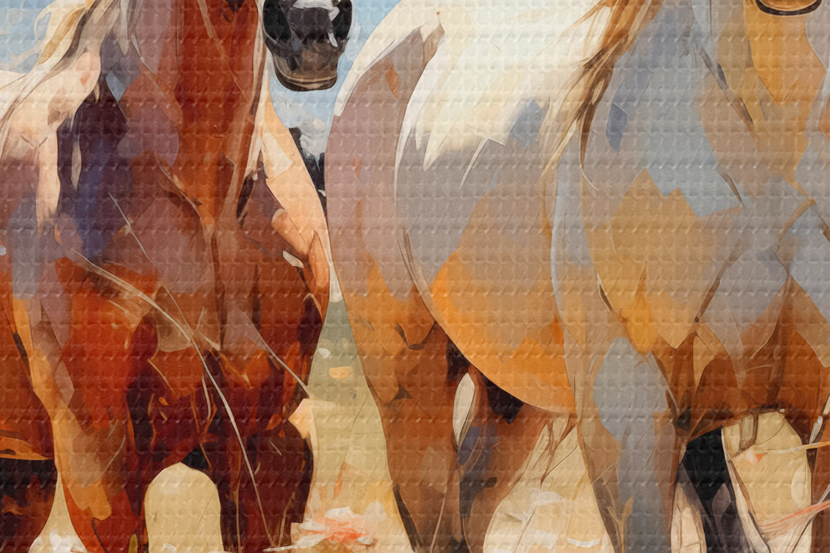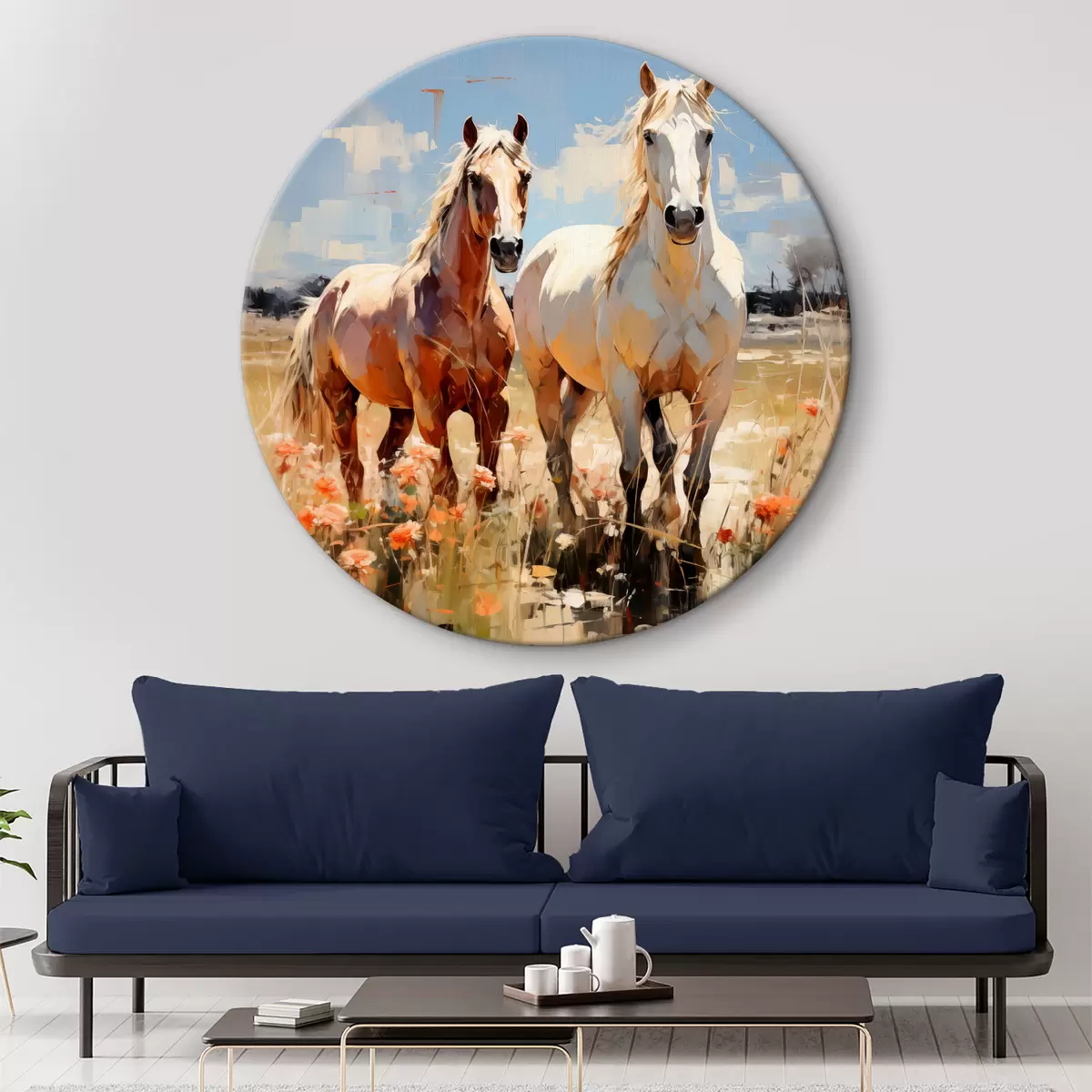 Picturi rotunde Cai albi și maro pasc într-o pajiște printre flori sălbatice pictură în ulei artă abstractă r39187