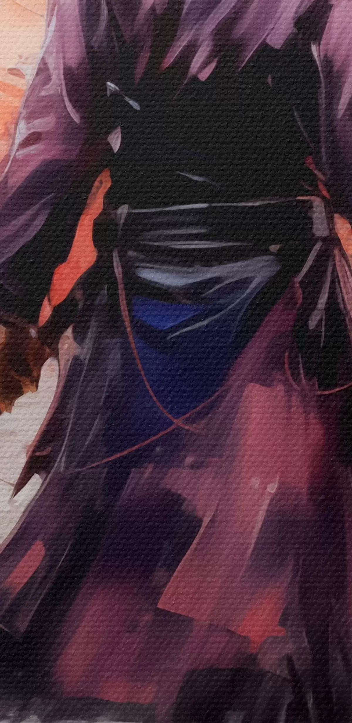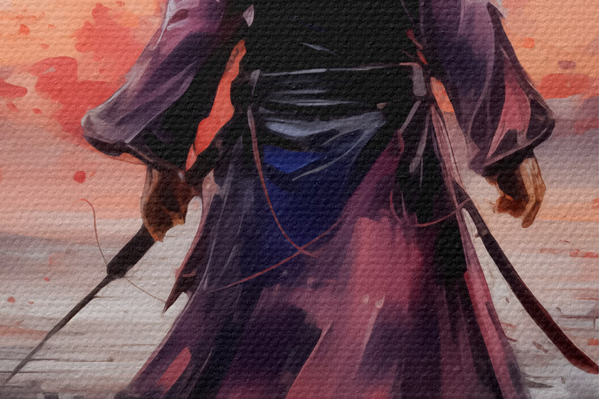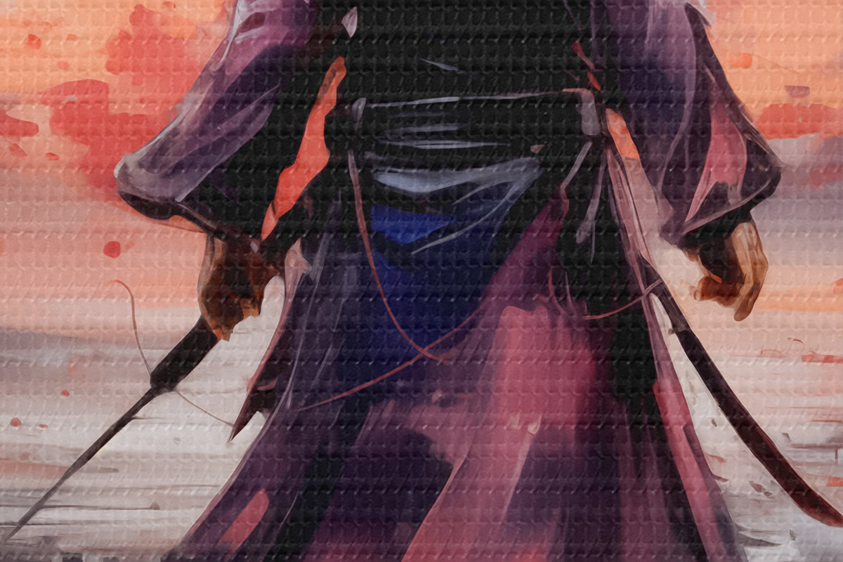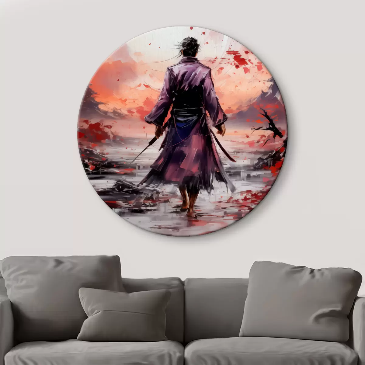 Picturi rotunde Un samurai cu o sabie într-o mantie purpurie merge spre munți pictură de artă abstractă Nr r39194