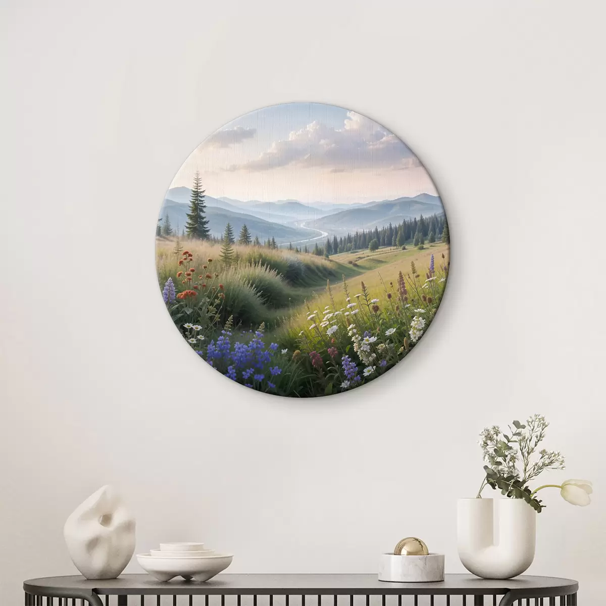 Picturi rotunde Peisaj montan cu o pajiște cu iarbă în prim-plan plină de flori sălbatice colorate Nr r39382