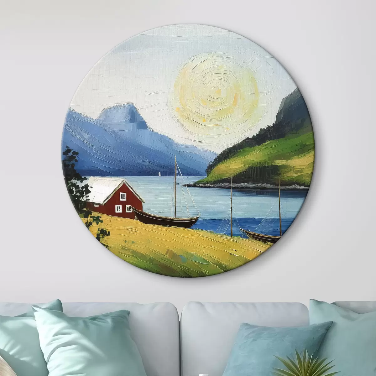 Picturi rotunde Vara nordică, casă mică pe coasta mării, soare pe cerul albastru, munți r39423
