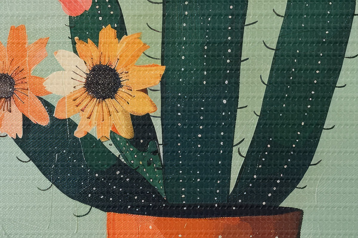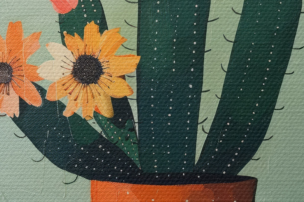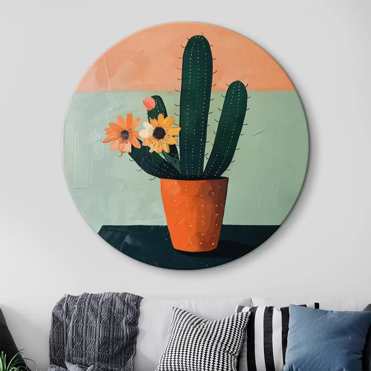 Picturi rotunde O pictură minimalistă a unui singur cactus cu flori într-o paletă de culori îndrăzneață. Nr r39452
