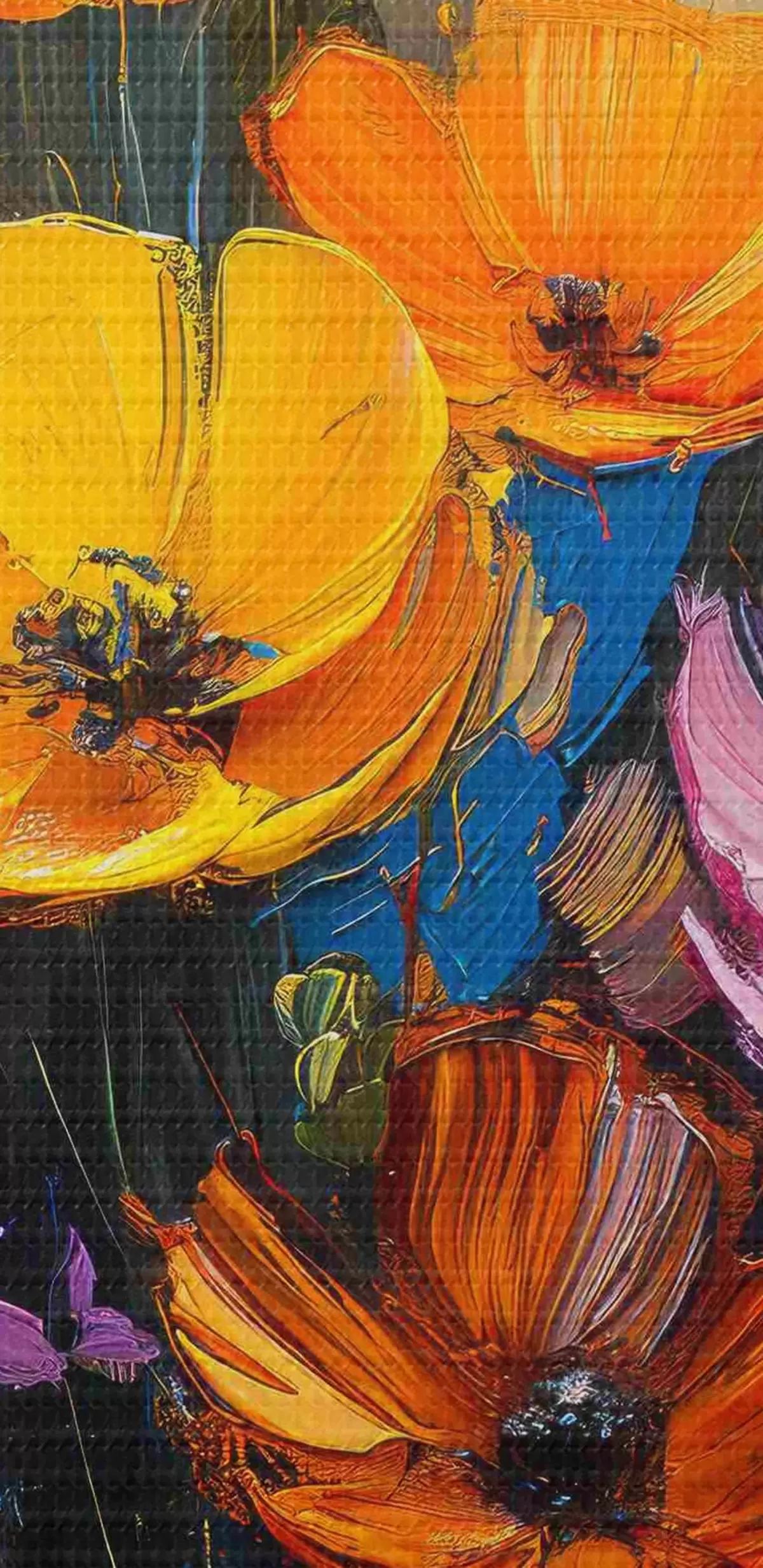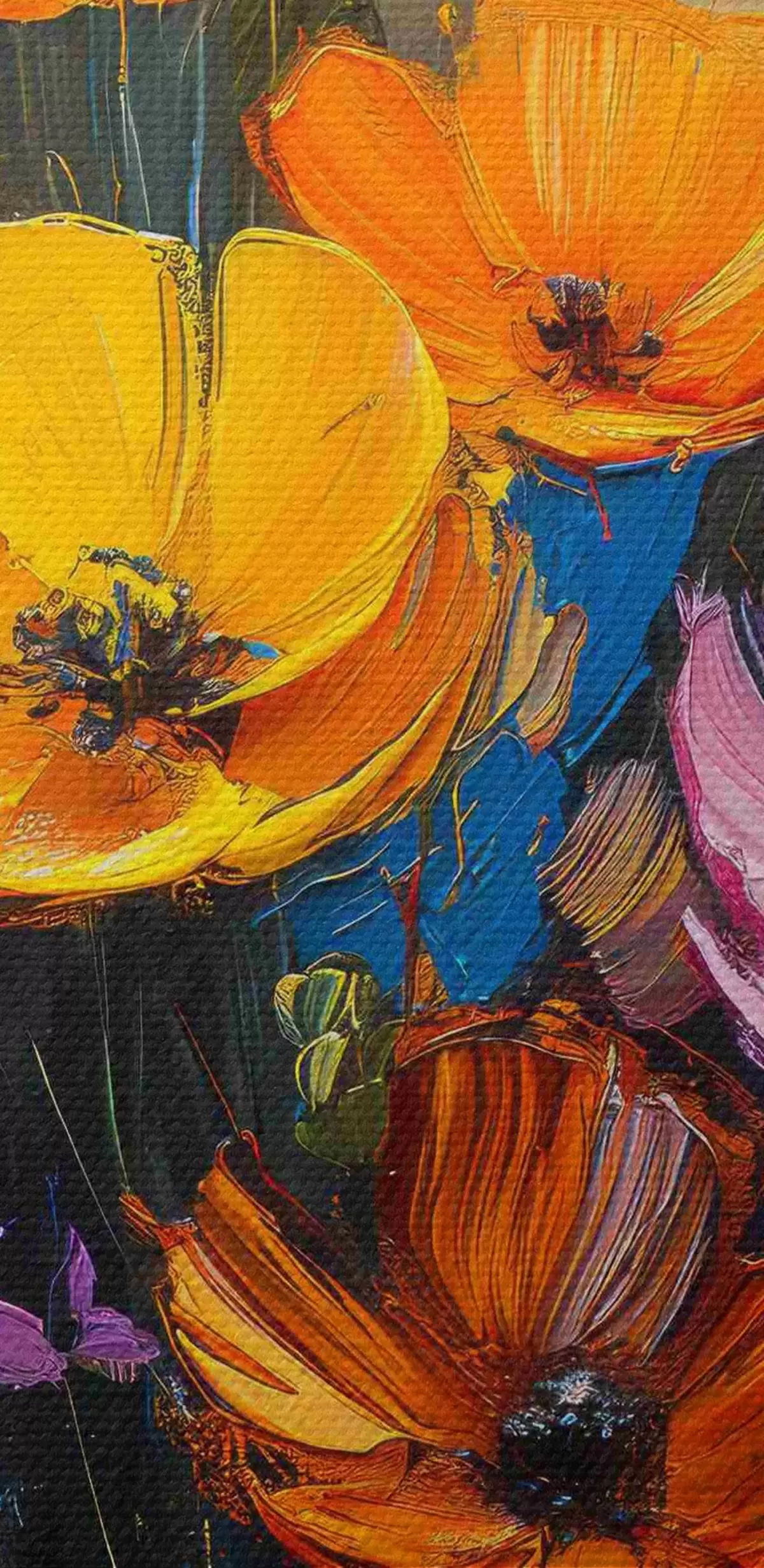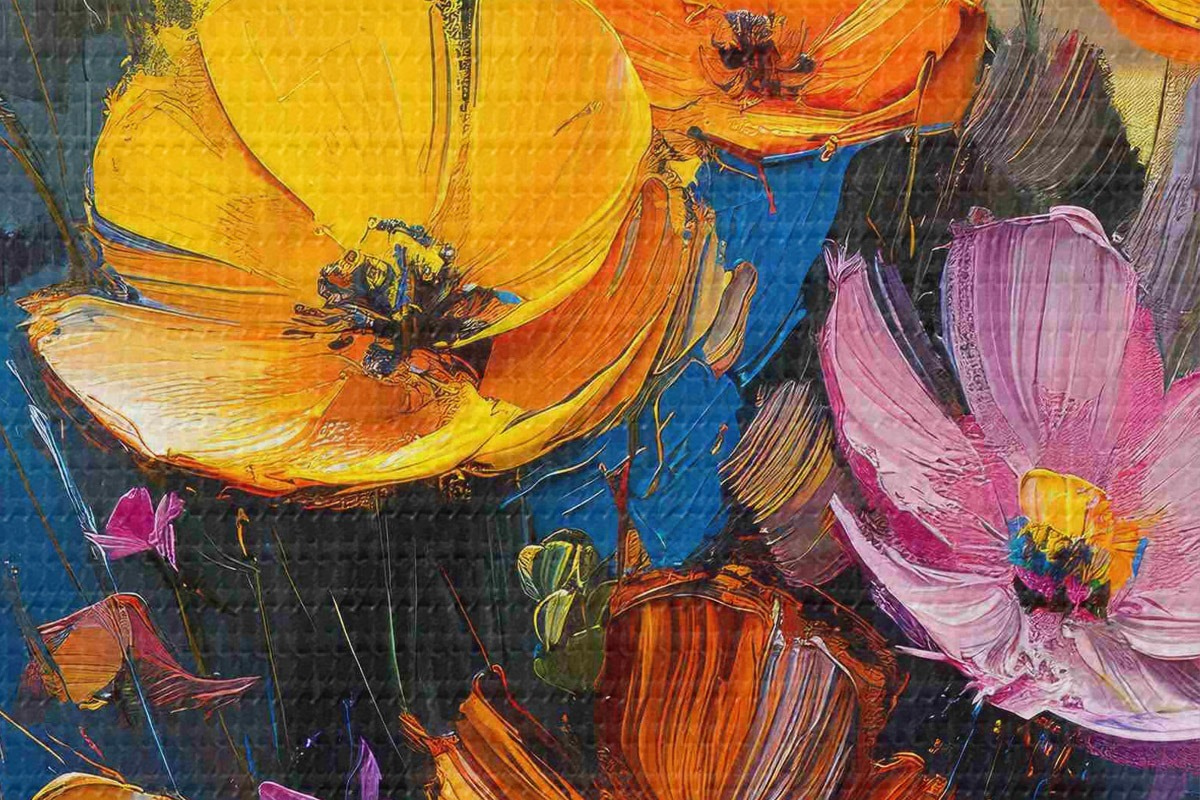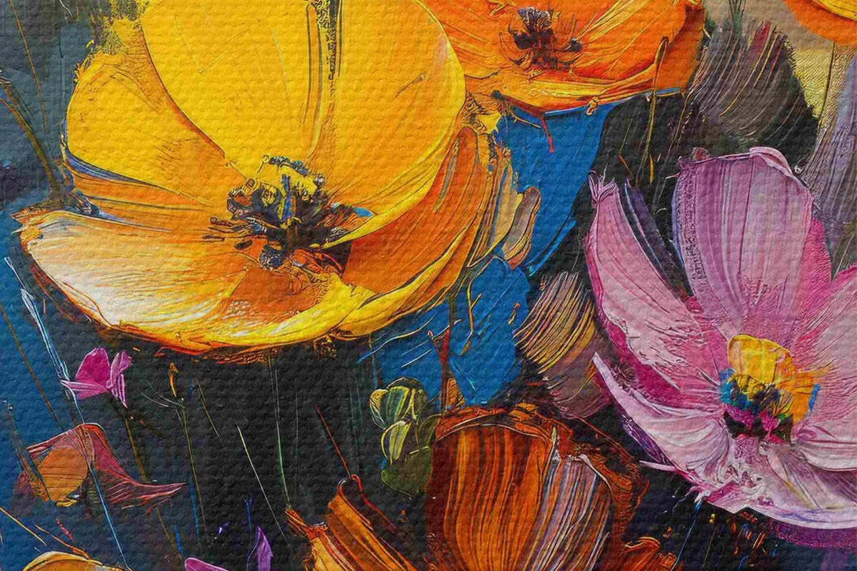 Picturi rotunde Simfonie pictată: galben deschis, portocaliu, roz și albastru cu tușe de maci Nr r39454