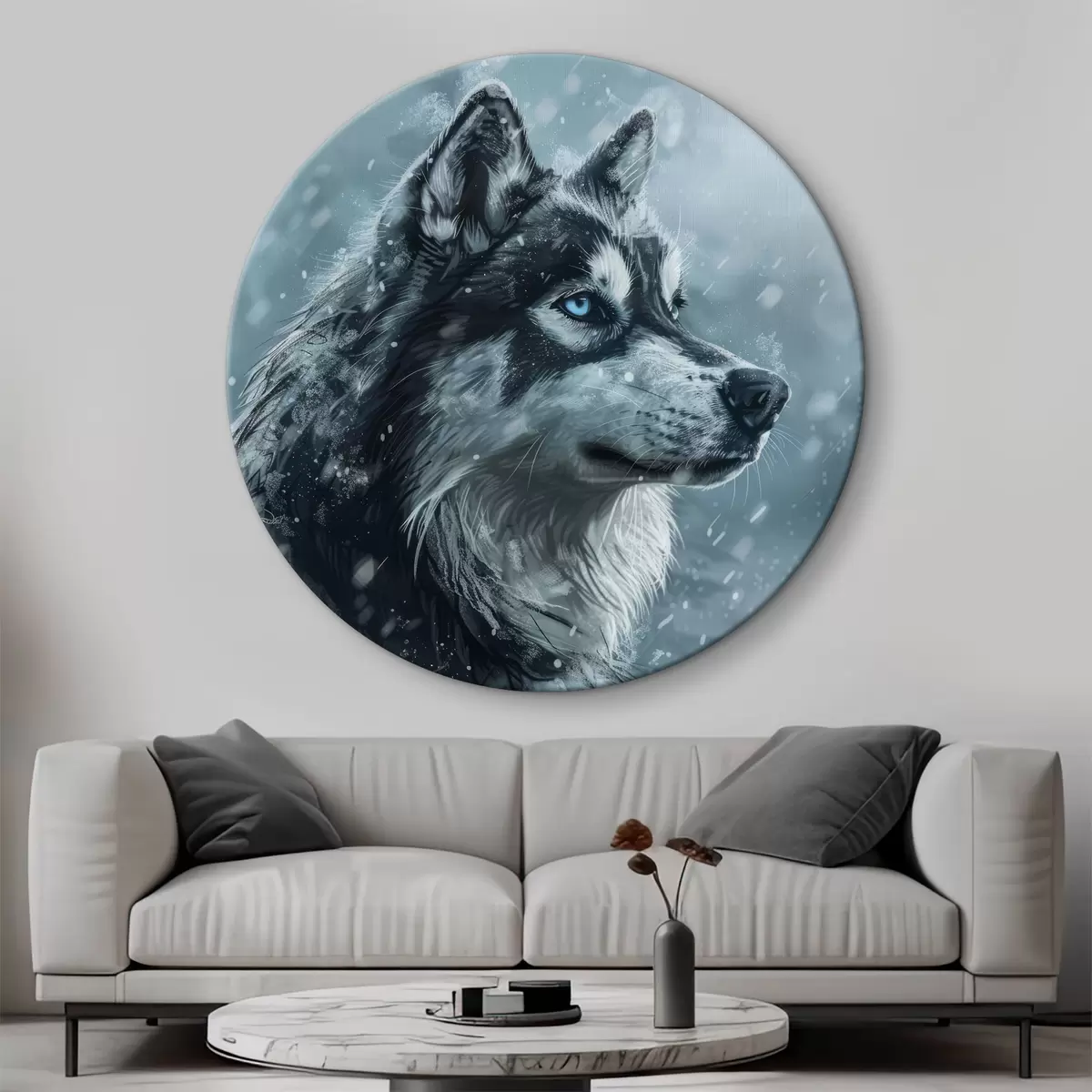 Picturi rotunde Husky cu ochi albaștri pe fundal albastru de iarnă r39462