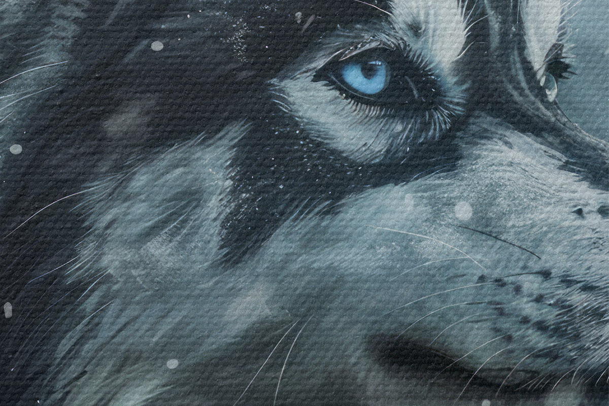 Picturi rotunde Husky cu ochi albaștri pe fundal albastru de iarnă Nr r39462