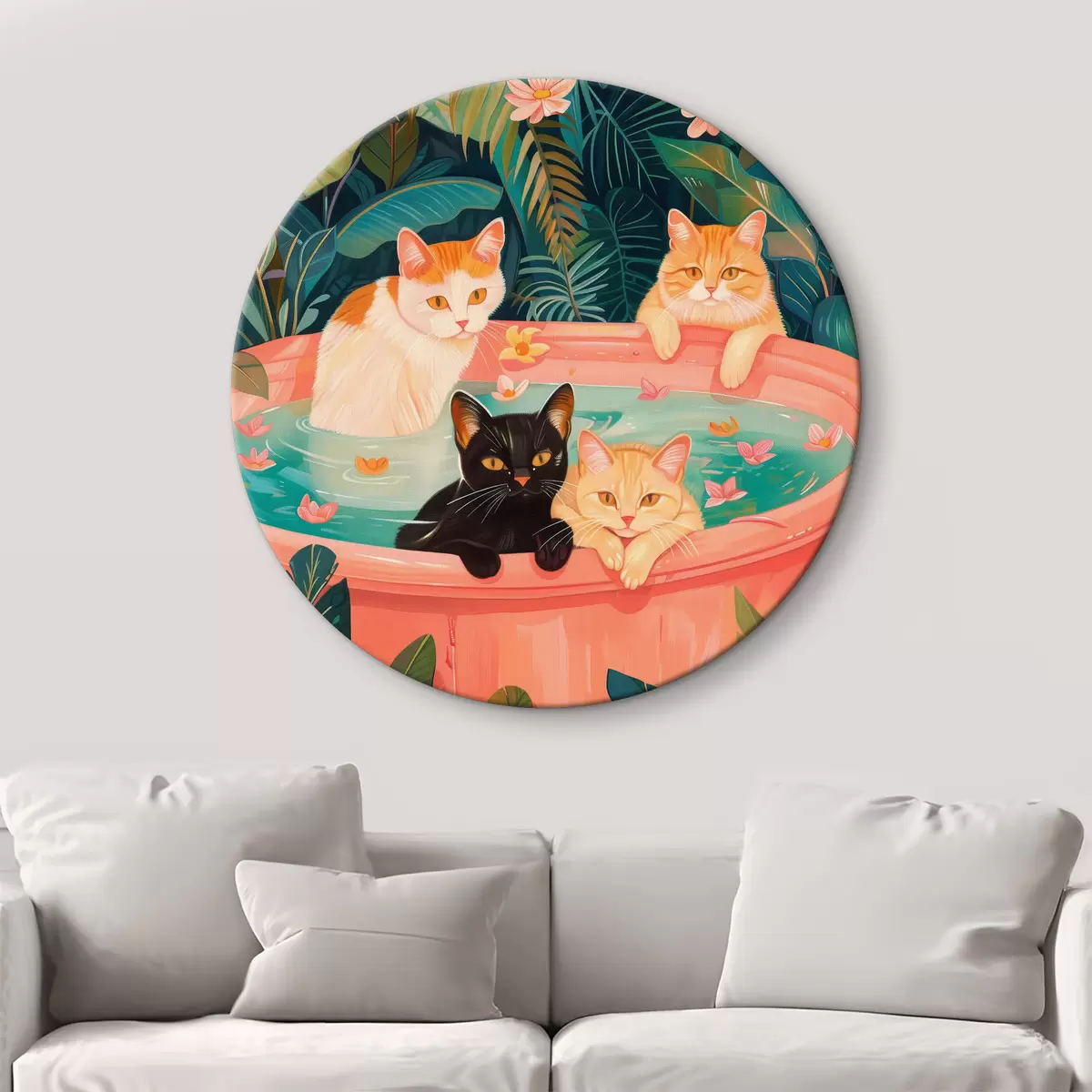 Picturi rotunde Pisici într-o baie roz cu frunze verzi, atmosferă de junglă Nr r39465