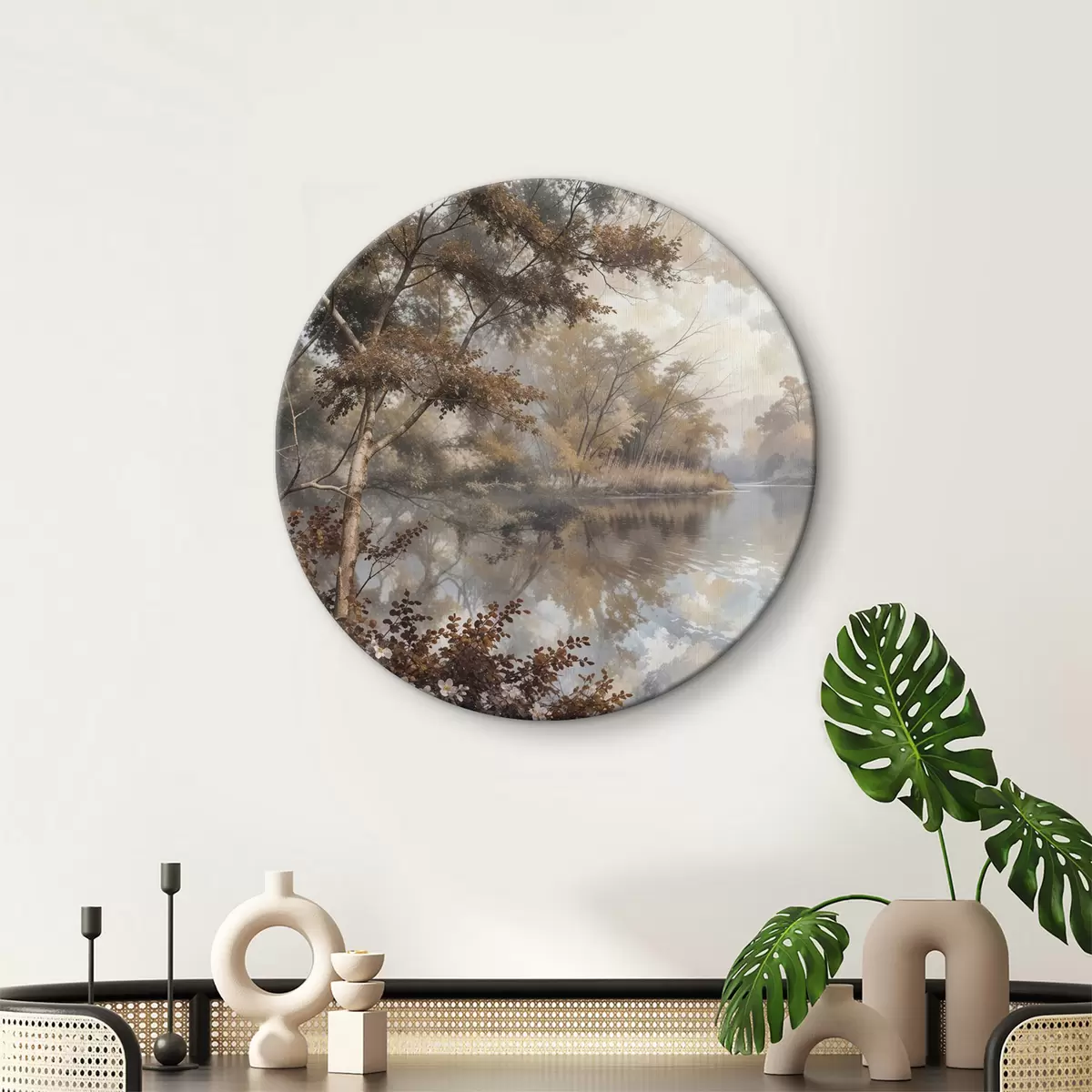 Picturi rotunde Peisaj de toamnă cu un lac calm înconjurat de copaci cu frunze vibrante portocalii și galbene r39511