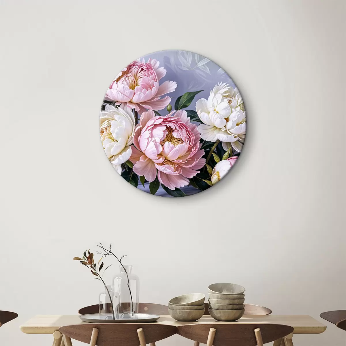 Picturi rotunde Un buchet de flori mari, luxuriante, roz și albe de bujor, cu frunze verzi, pe un fundal blând, neclar Nr r39514