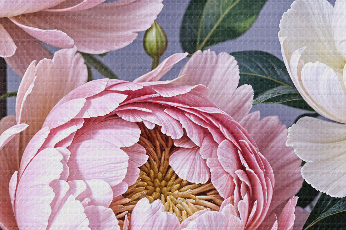 Picturi rotunde Un buchet de flori mari, luxuriante, roz și albe de bujor, cu frunze verzi, pe un fundal blând, neclar Nr r39514