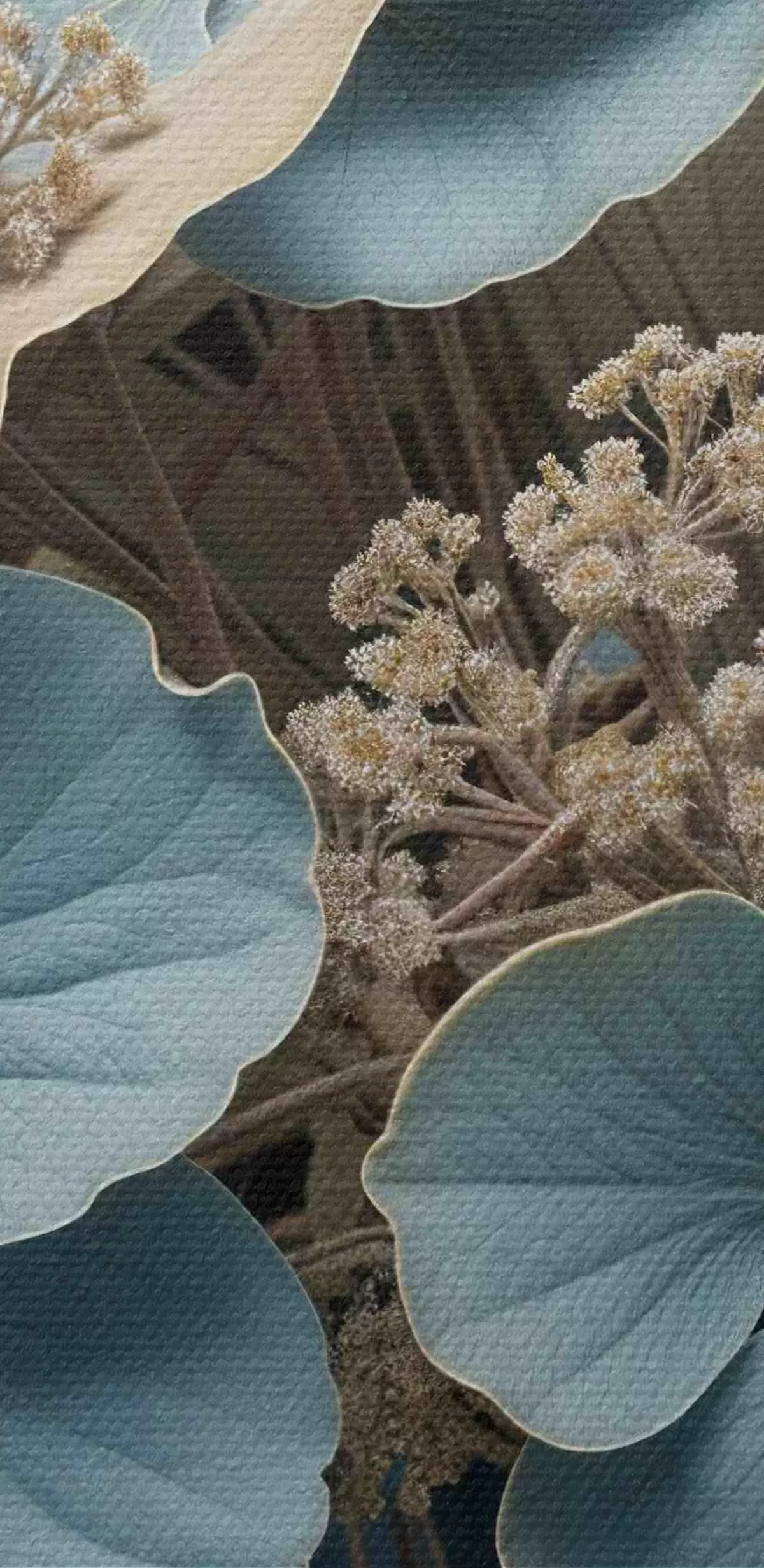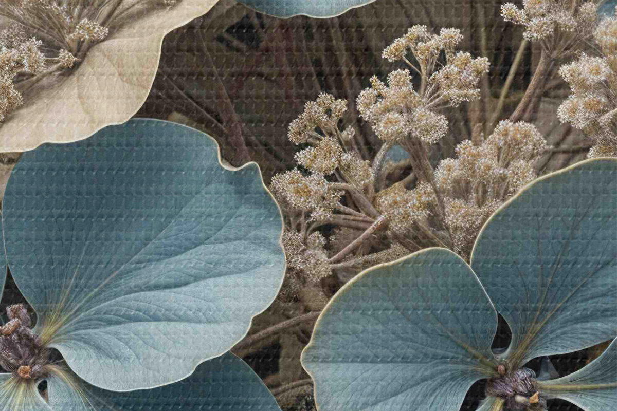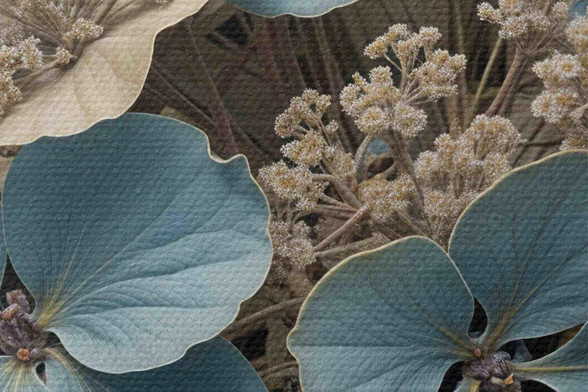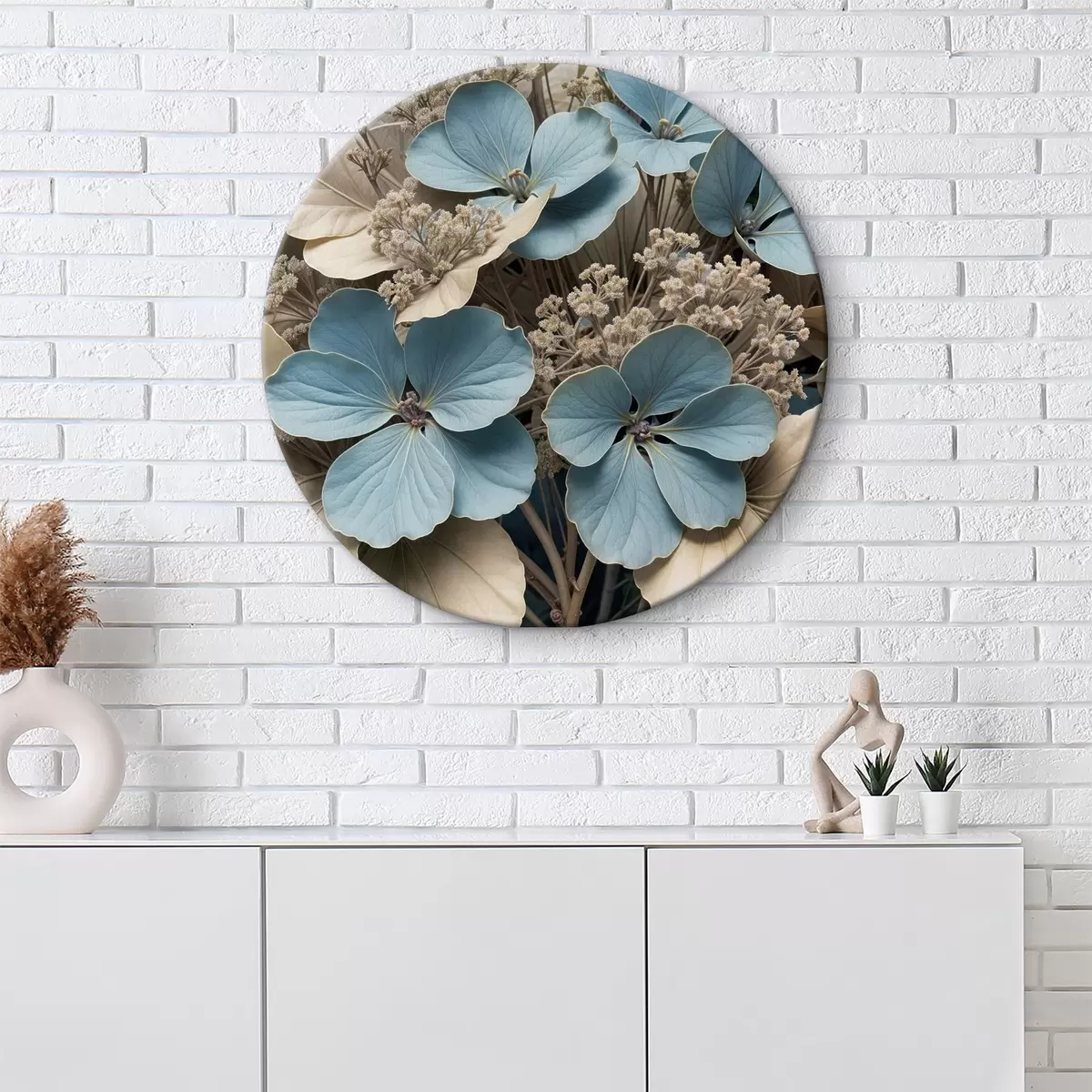 Picturi rotunde Close-up de flori albastre și albe cu petale moi, neclare pe un fundal maro Nr r39517