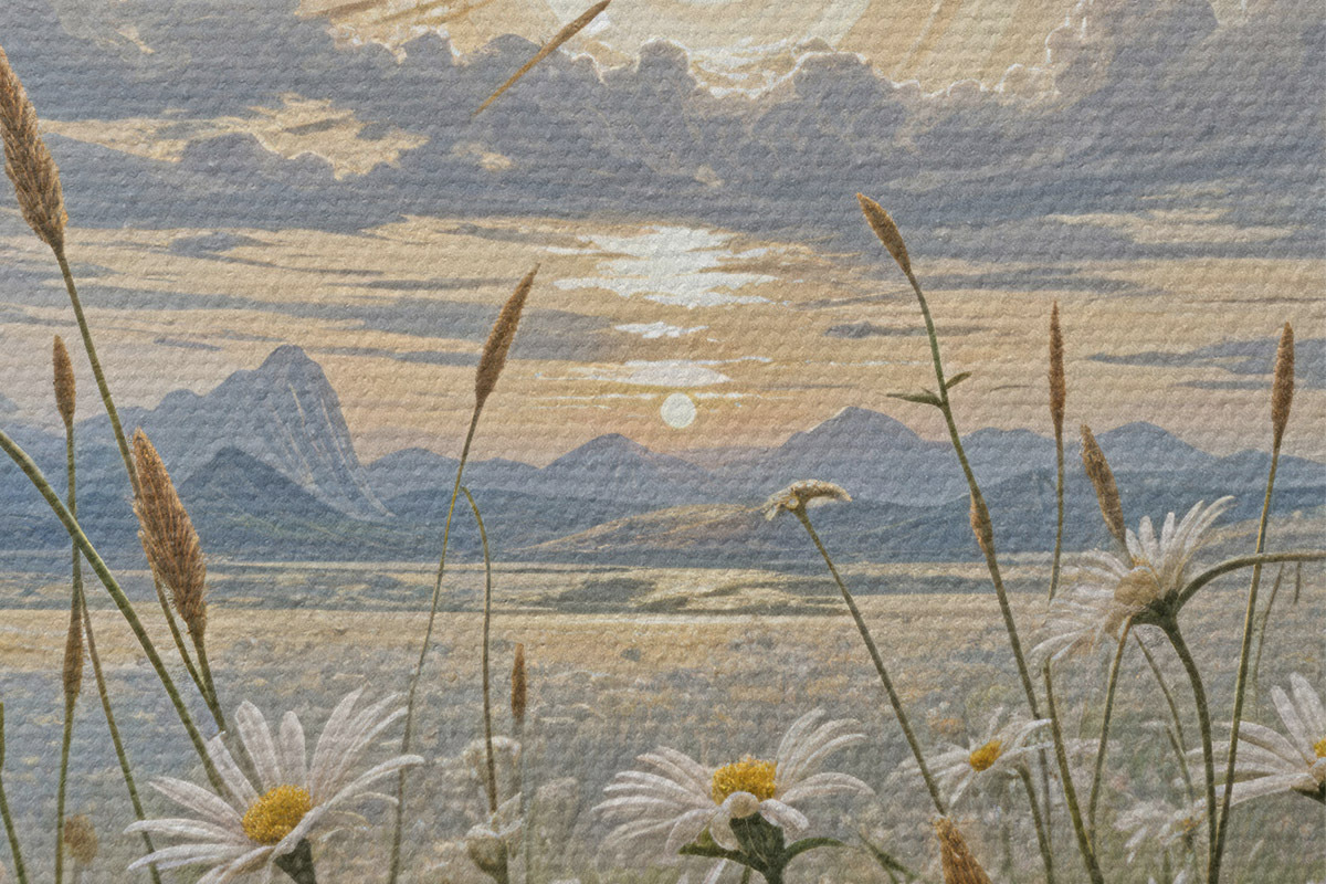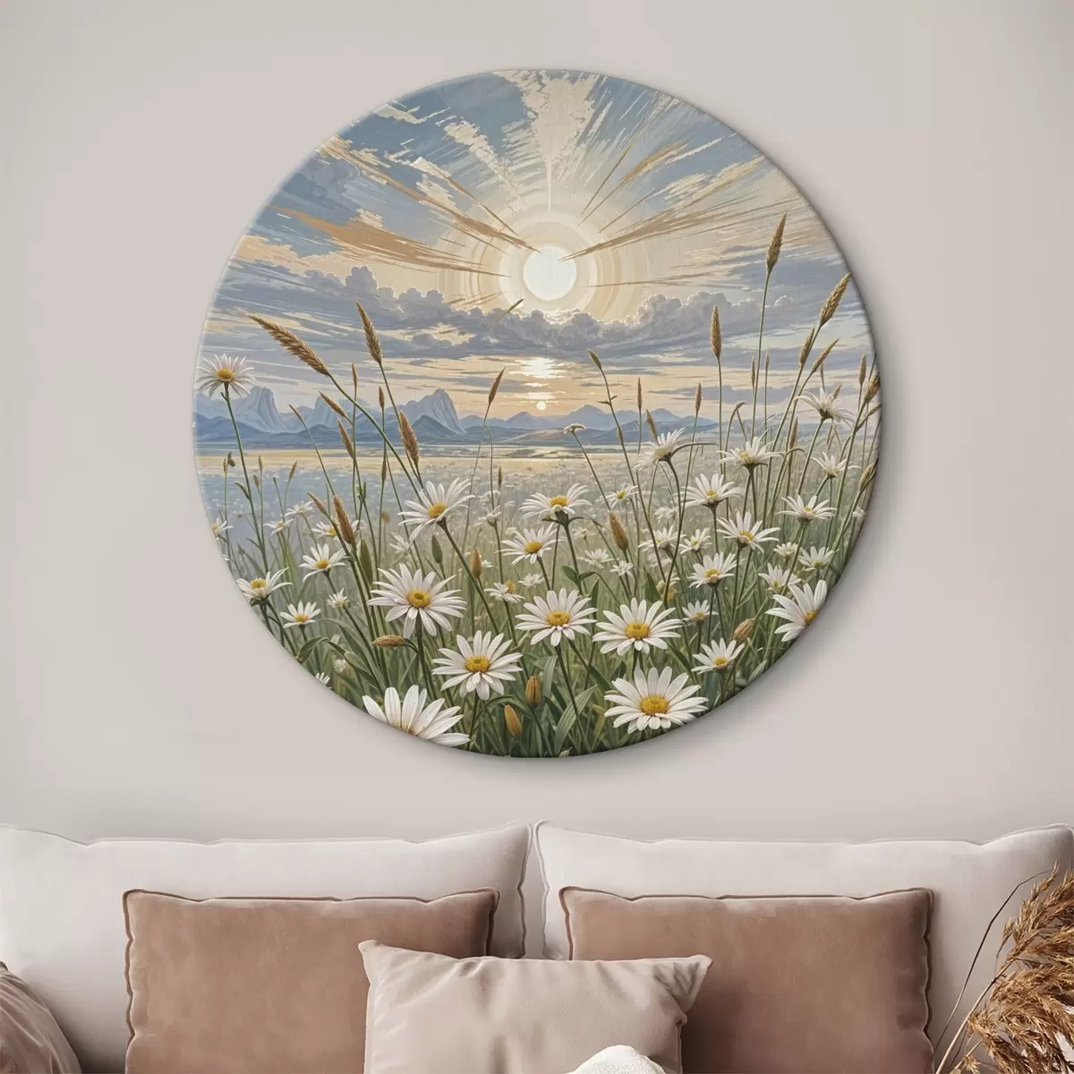 Picturi rotunde Un câmp de flori albe margarete în prim-plan cu peisaj de munți și un cer noros r39528