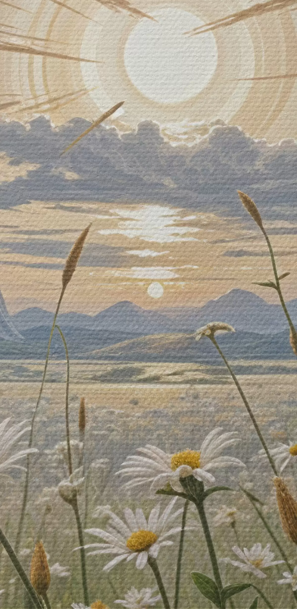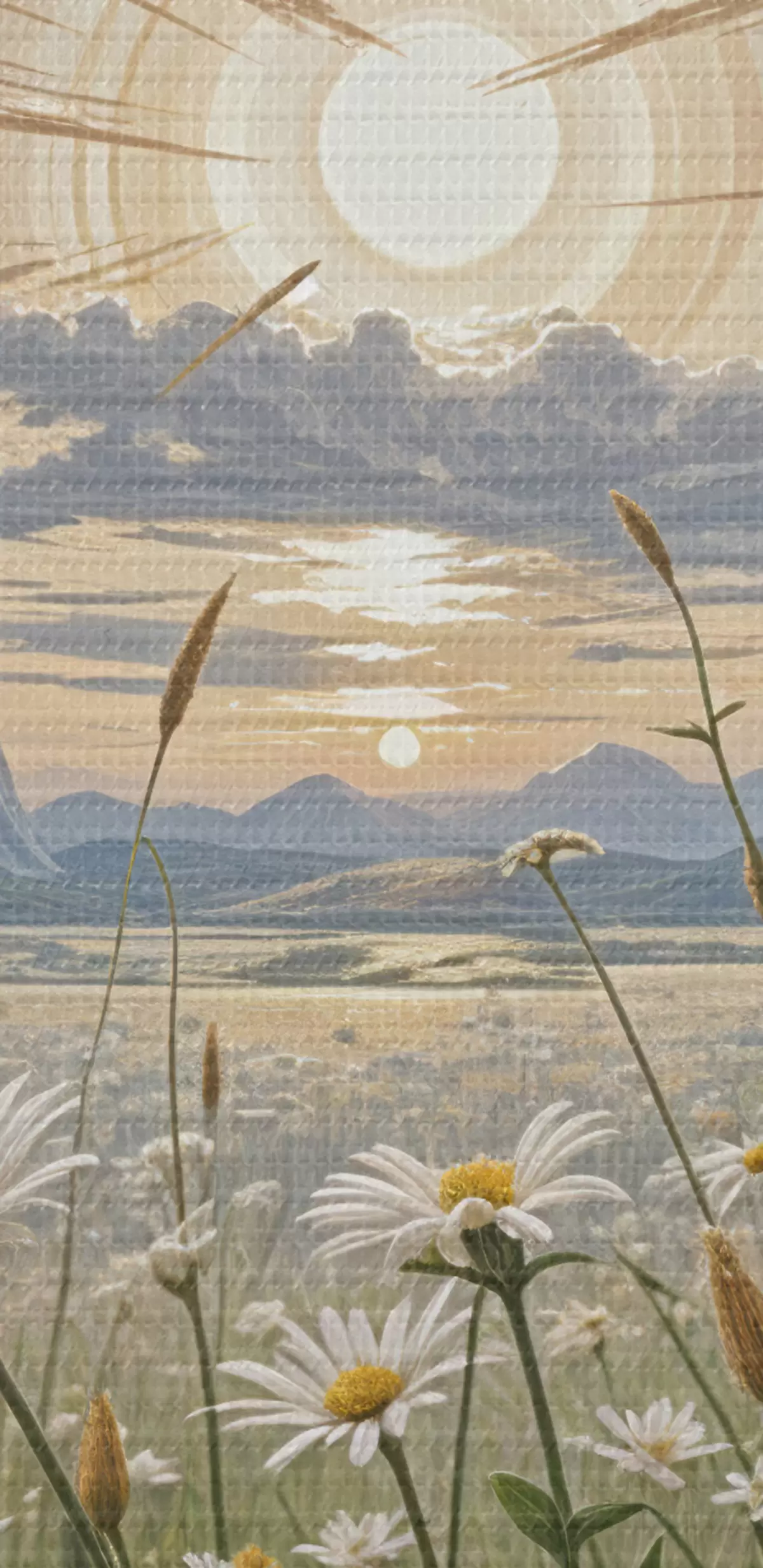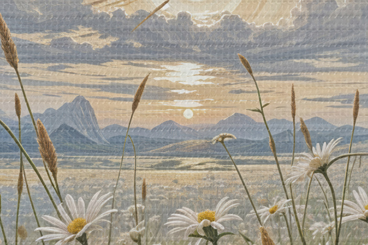 Picturi rotunde Un câmp de flori albe margarete în prim-plan cu peisaj de munți și un cer noros Nr r39528