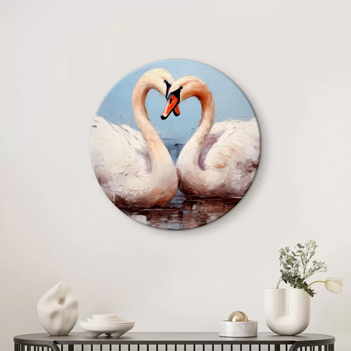 Picturi rotunde Pereche de lebede albe pe un iaz, pictură în ulei r39572