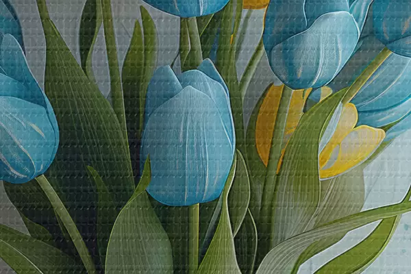 Picturi rotunde Lalele albastre și galbene în 3D: imagine de perete elegantă cu ramă albă, fundal alb și albastru deschis și vază gravată Nr r39636