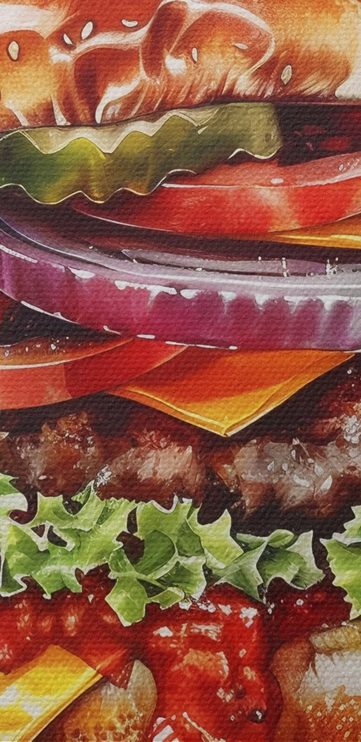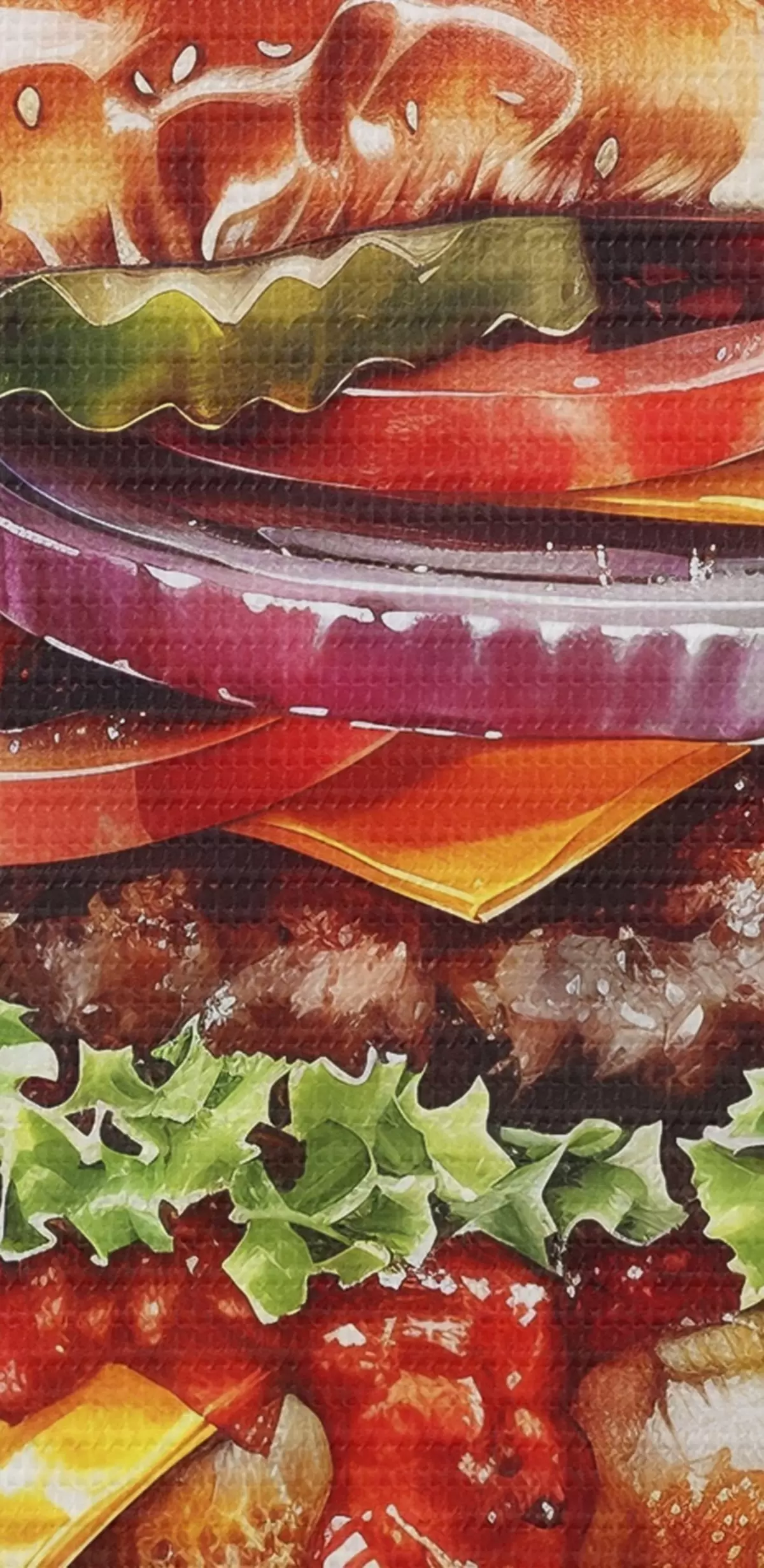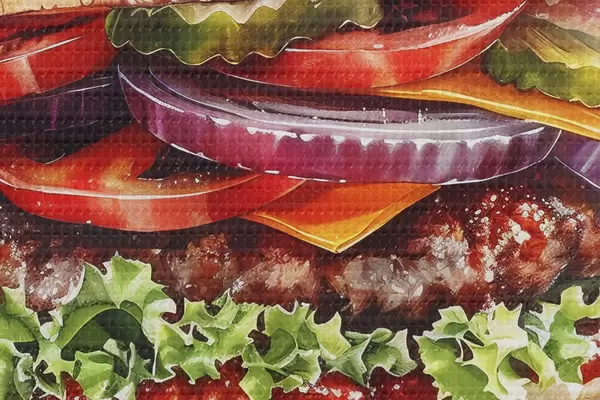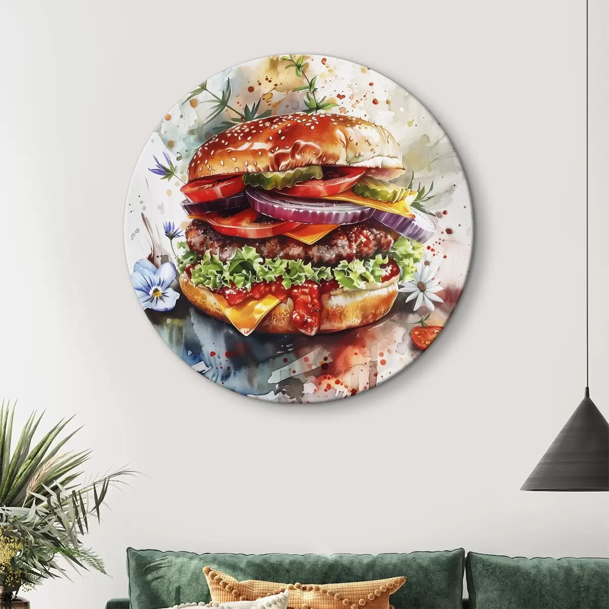 Picturi rotunde Burger gustos cu carne, floral, acuarelă, artă alimentară Nr r39699