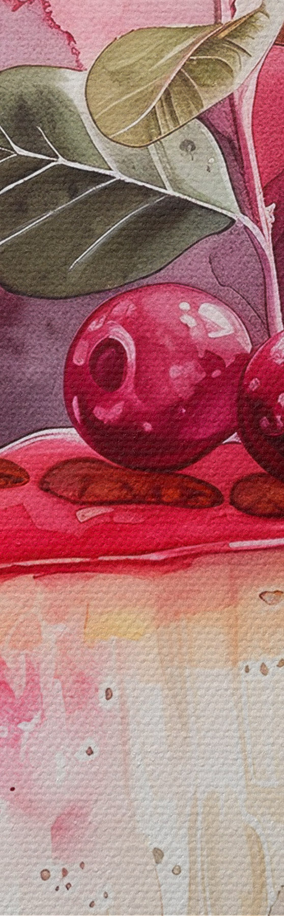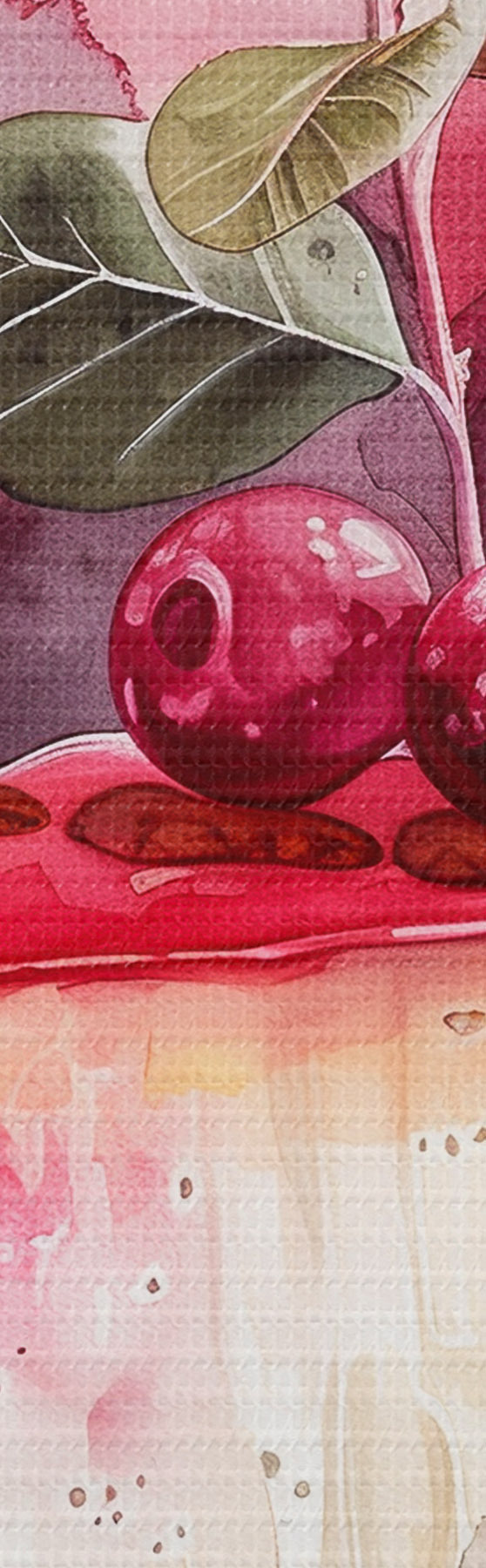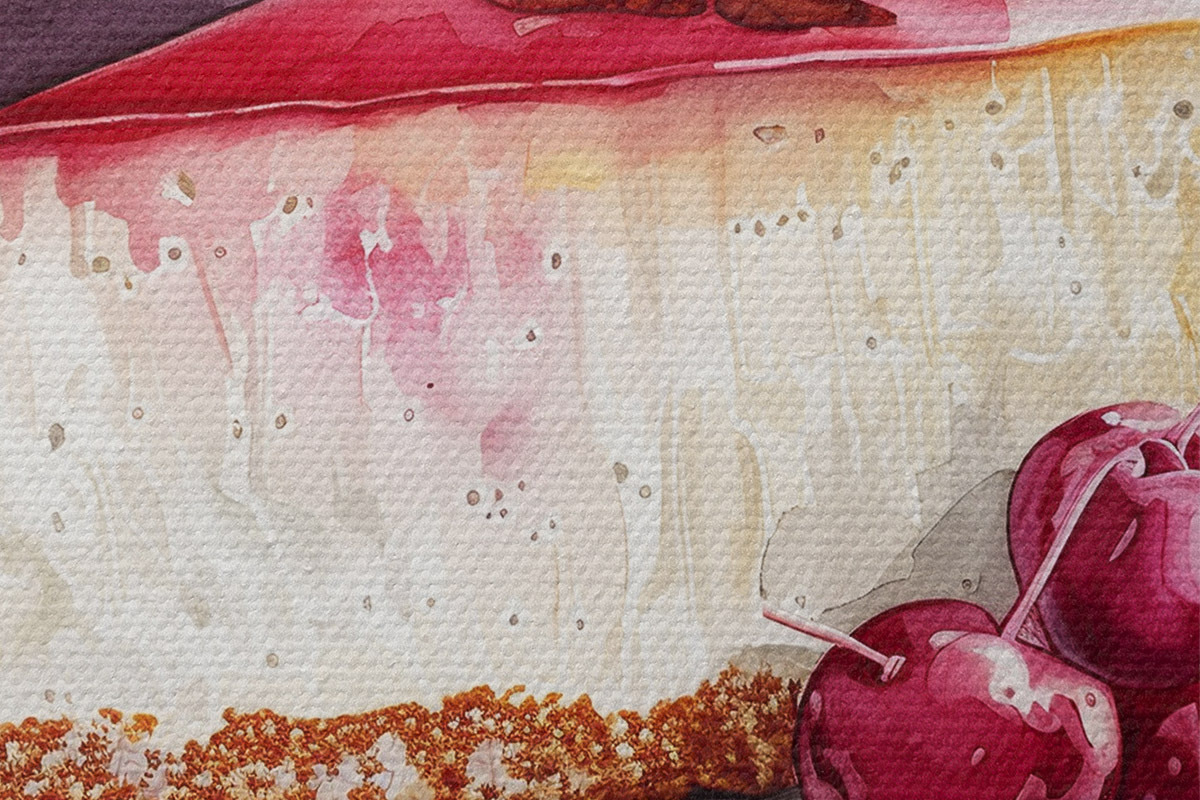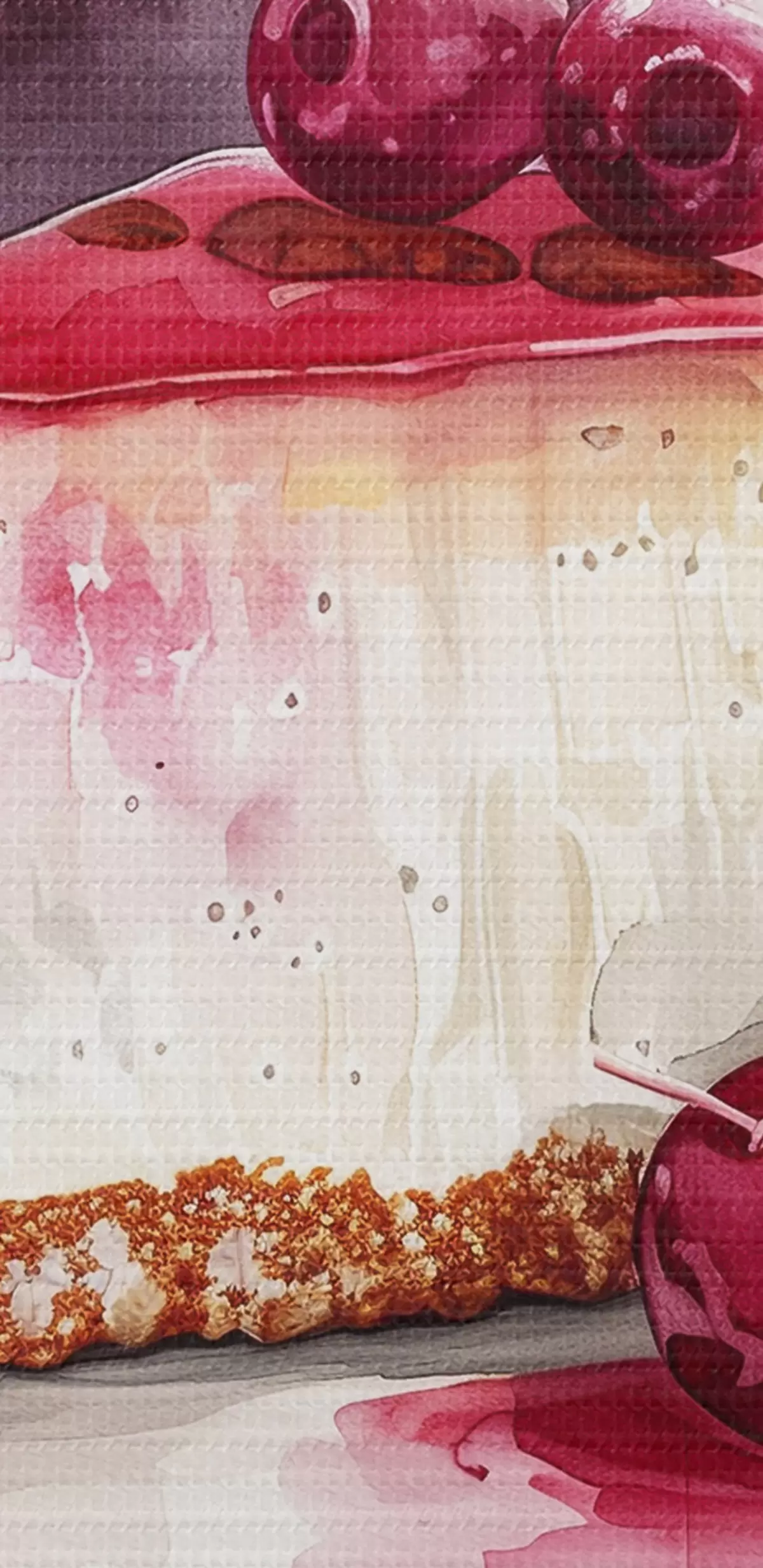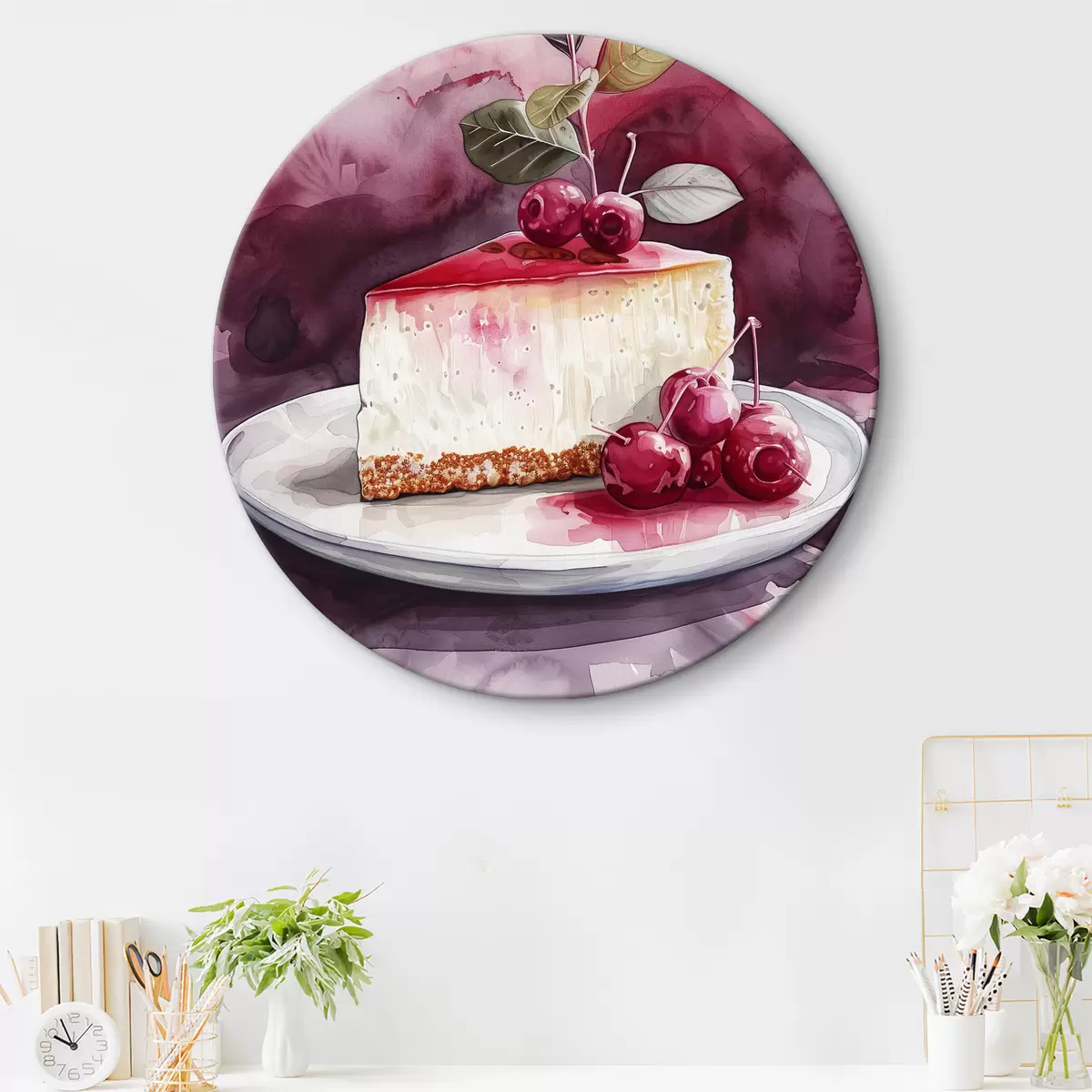 Picturi rotunde Cheesecake acuarelă cu cireșe, artă alimentară elegantă, culori roșii și violet r39700