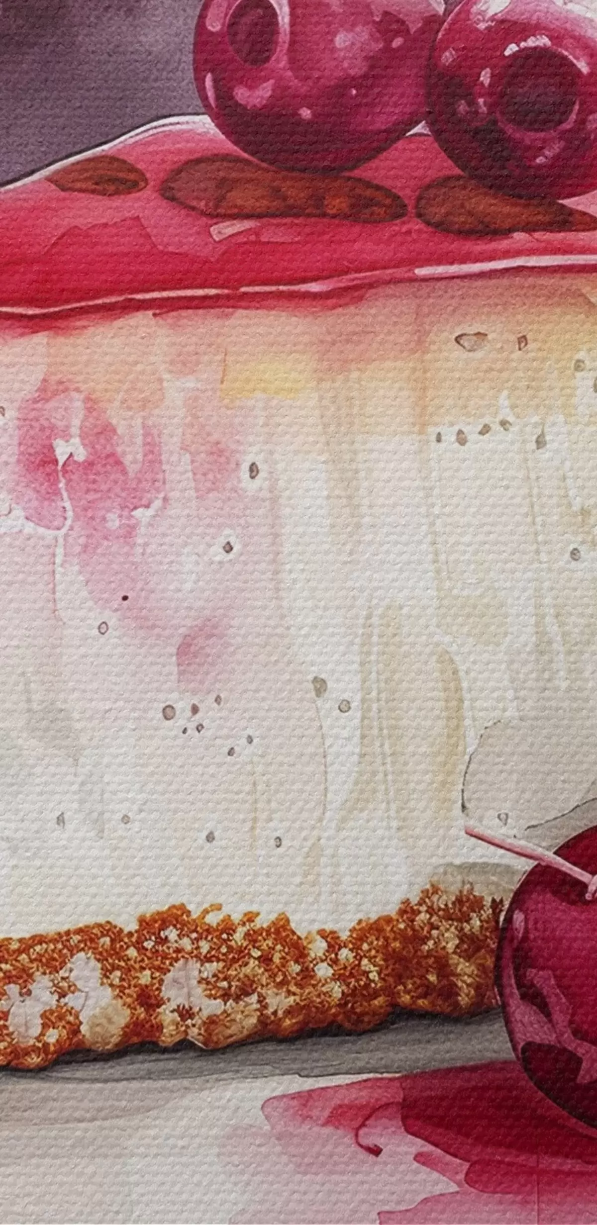 Picturi rotunde Cheesecake acuarelă cu cireșe, artă alimentară elegantă, culori roșii și violet Nr r39700