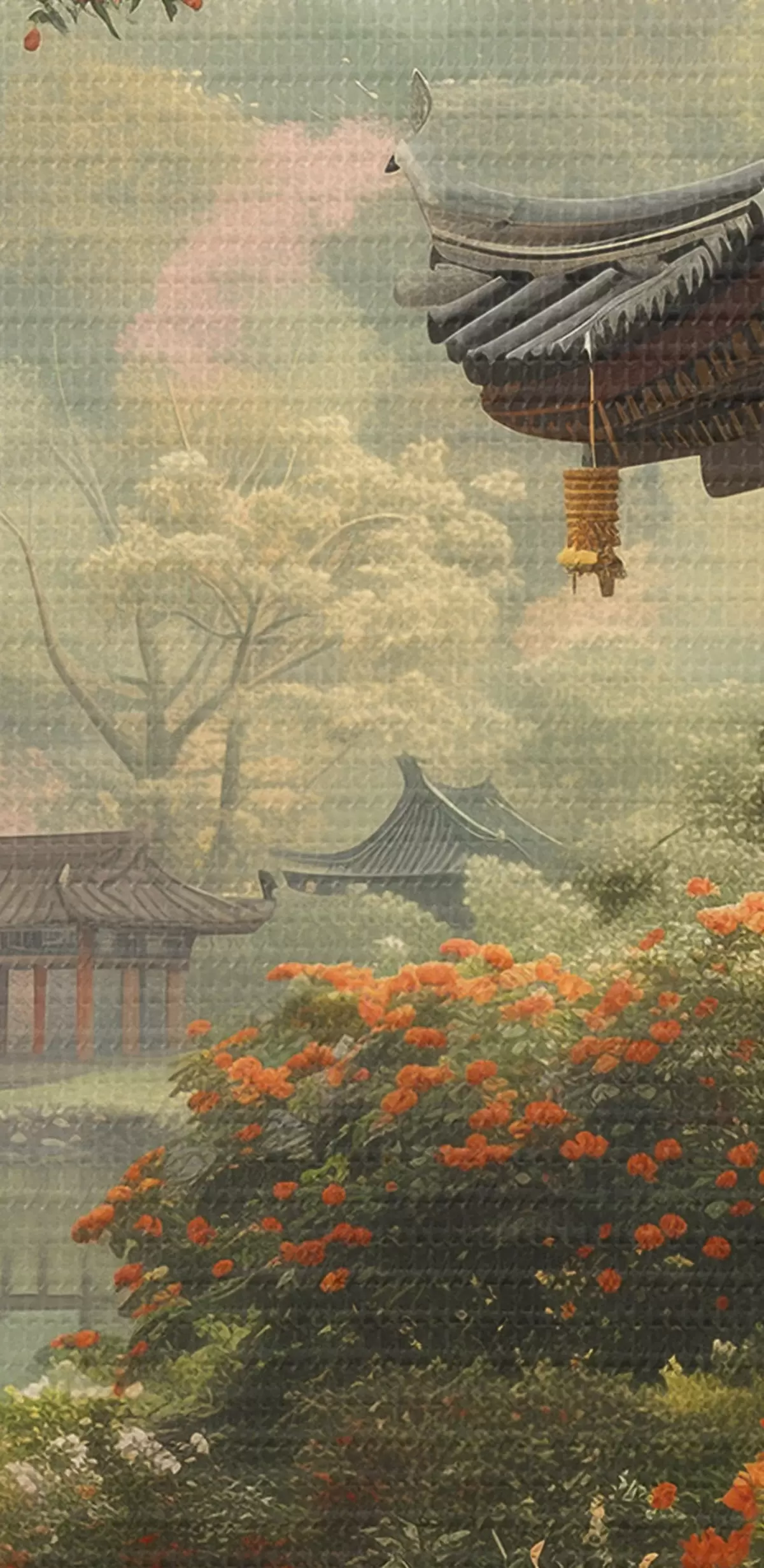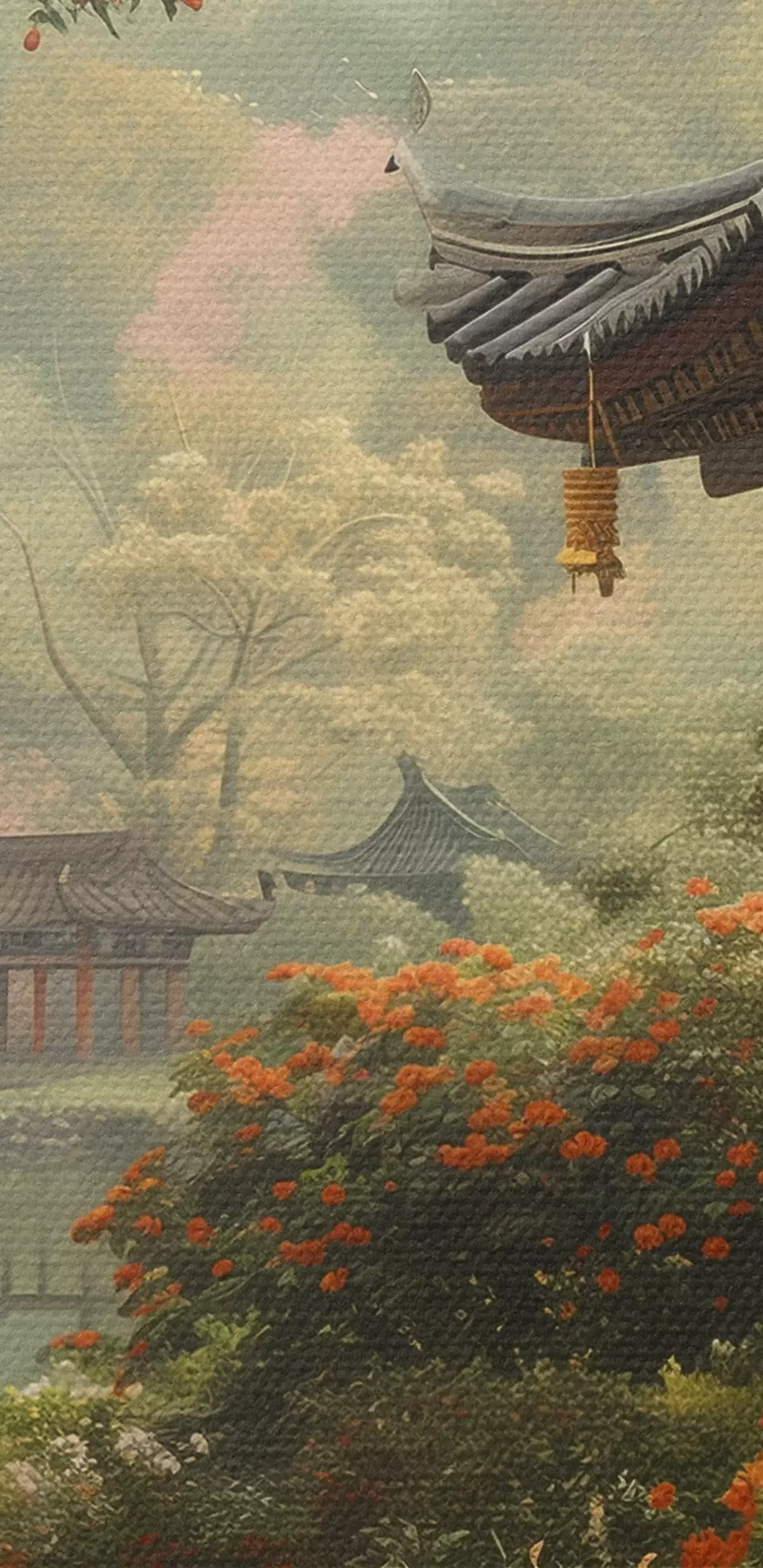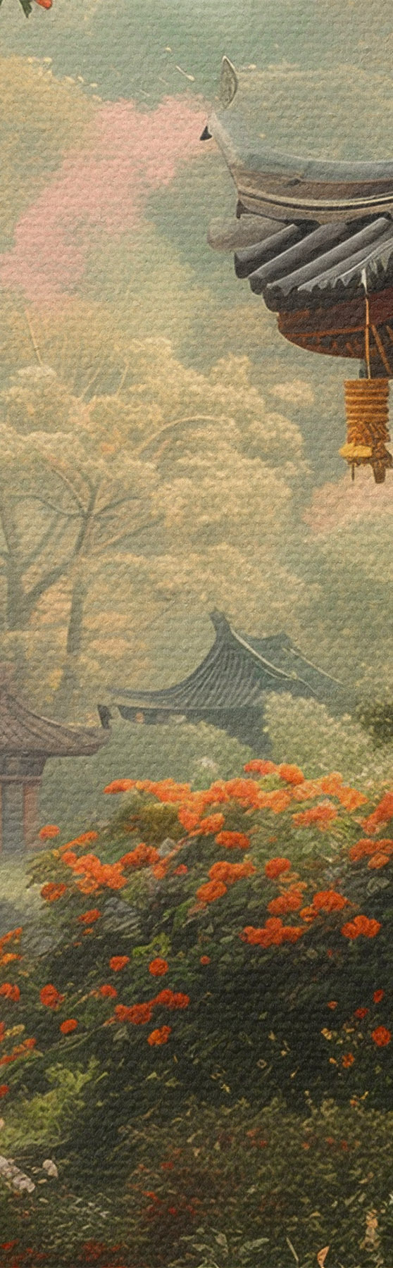Picturi rotunde Parc japonez cu copaci și flori înflorite, pădure, casă de grădină, lac Nr r39772