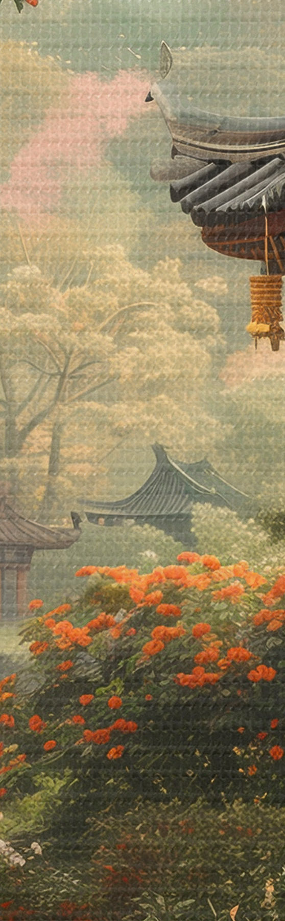 Picturi rotunde Parc japonez cu copaci și flori înflorite, pădure, casă de grădină, lac r39772