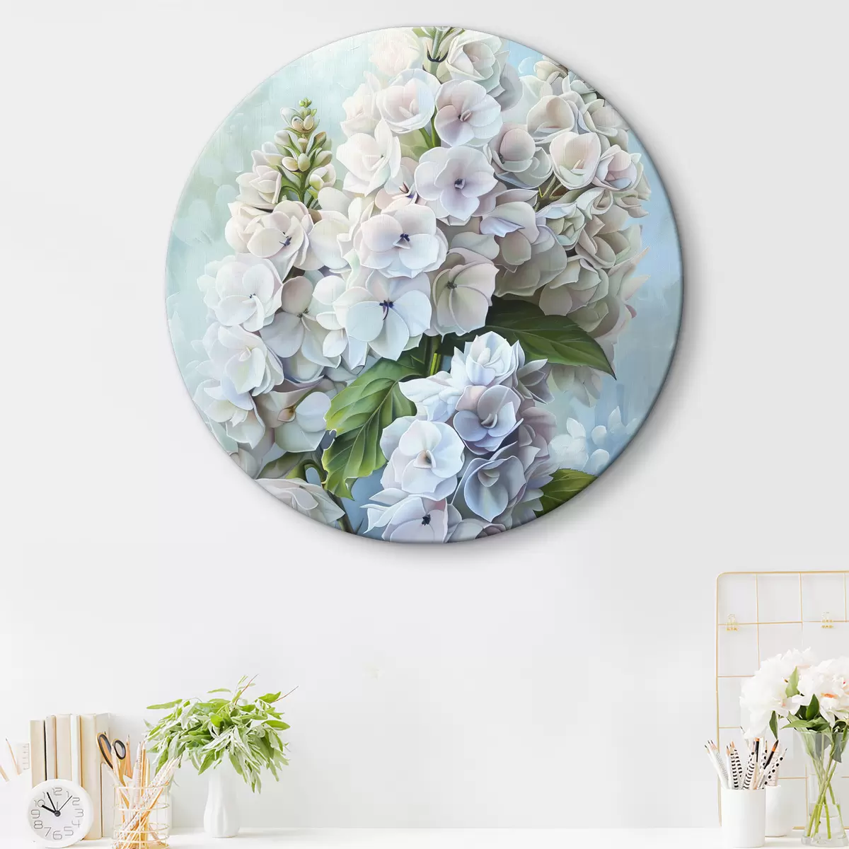 Picturi rotunde Flori de hortensie violet, culori naturale moi, desen acuarelă r39783