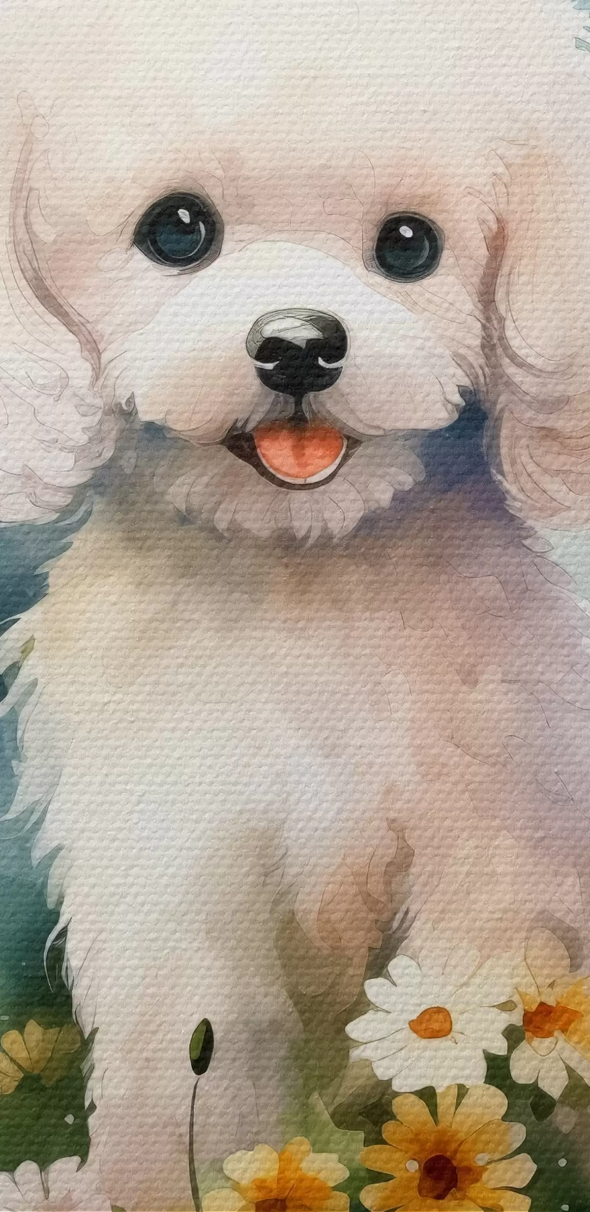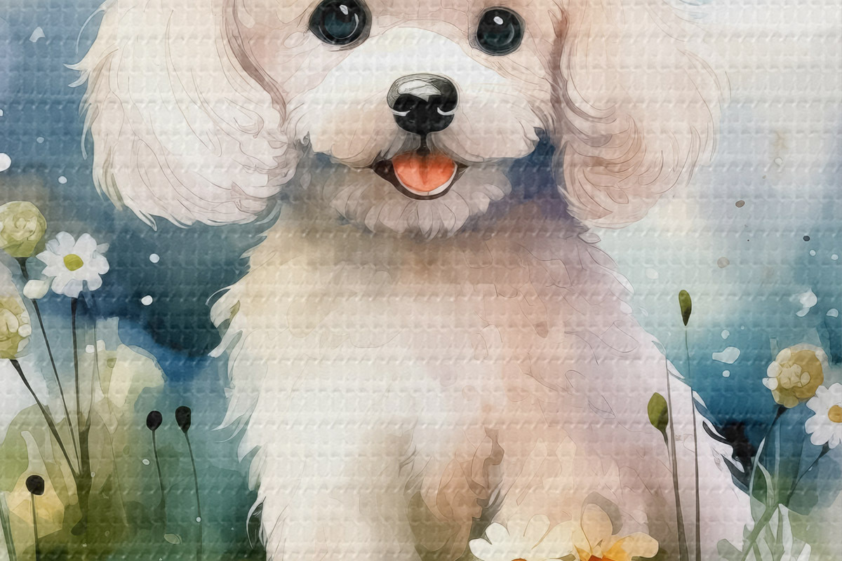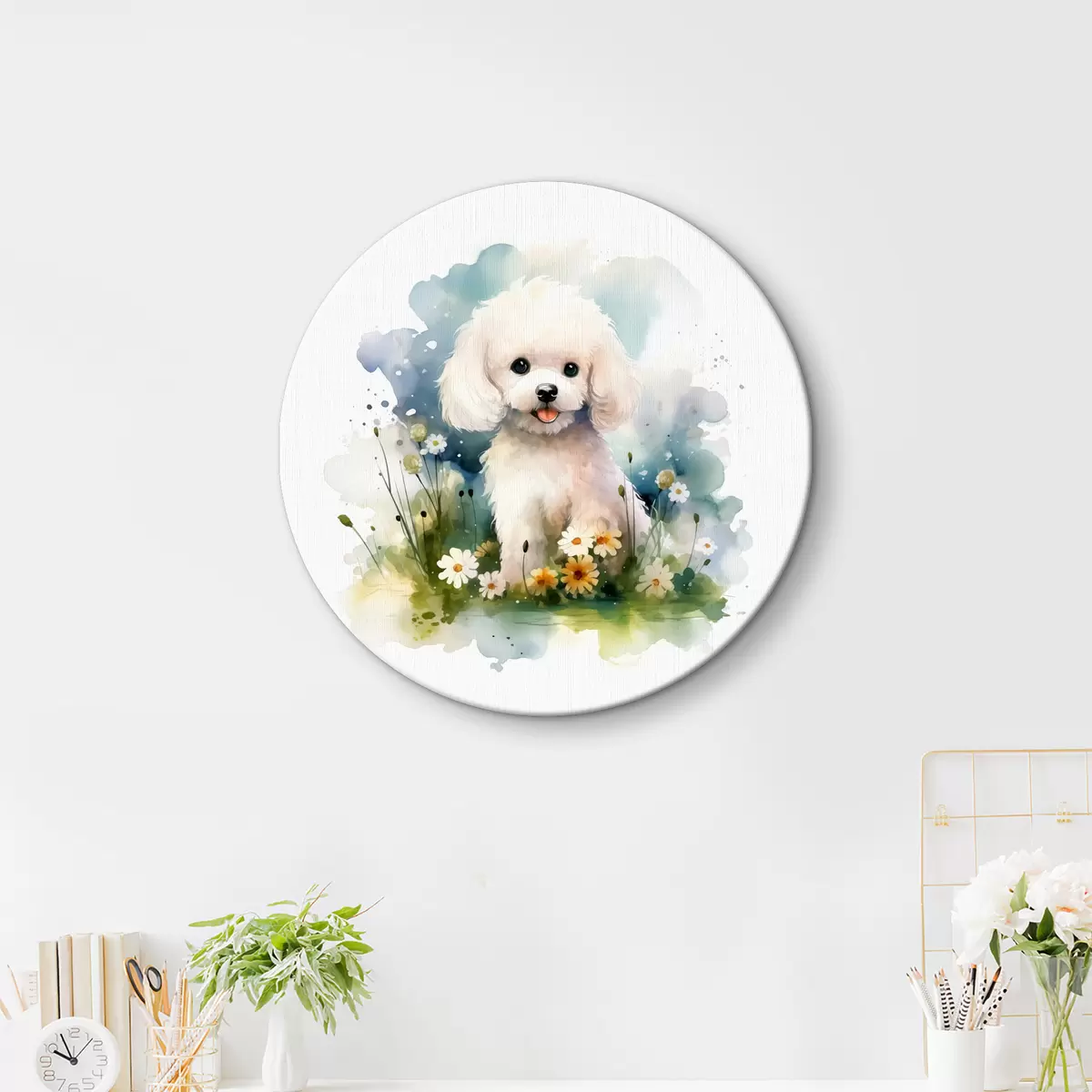 Picturi rotunde Mic pudel alb stând în flori acuarelă Nr r39928