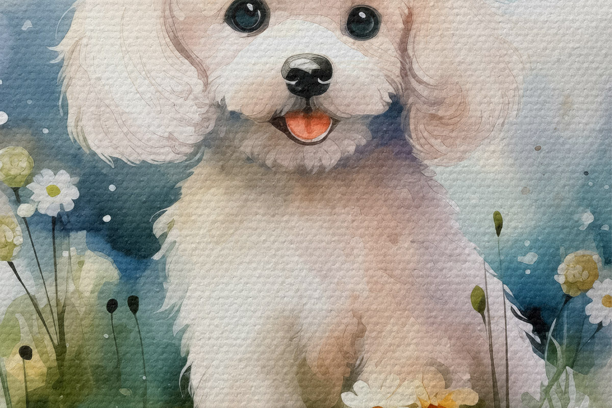 Picturi rotunde Mic pudel alb stând în flori acuarelă r39928